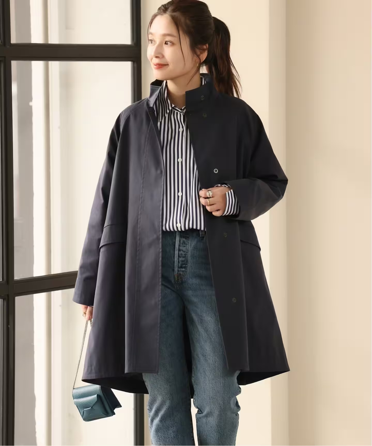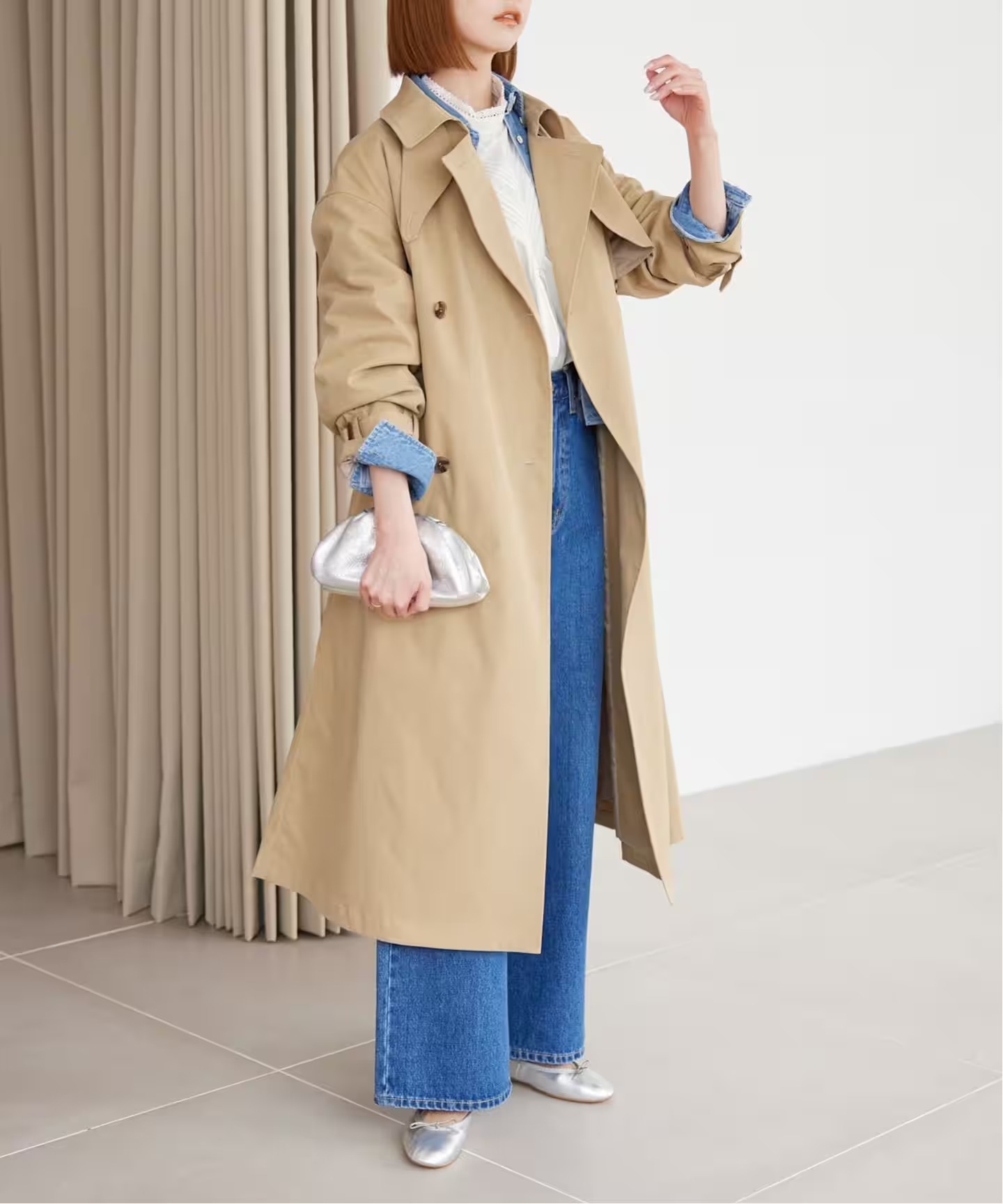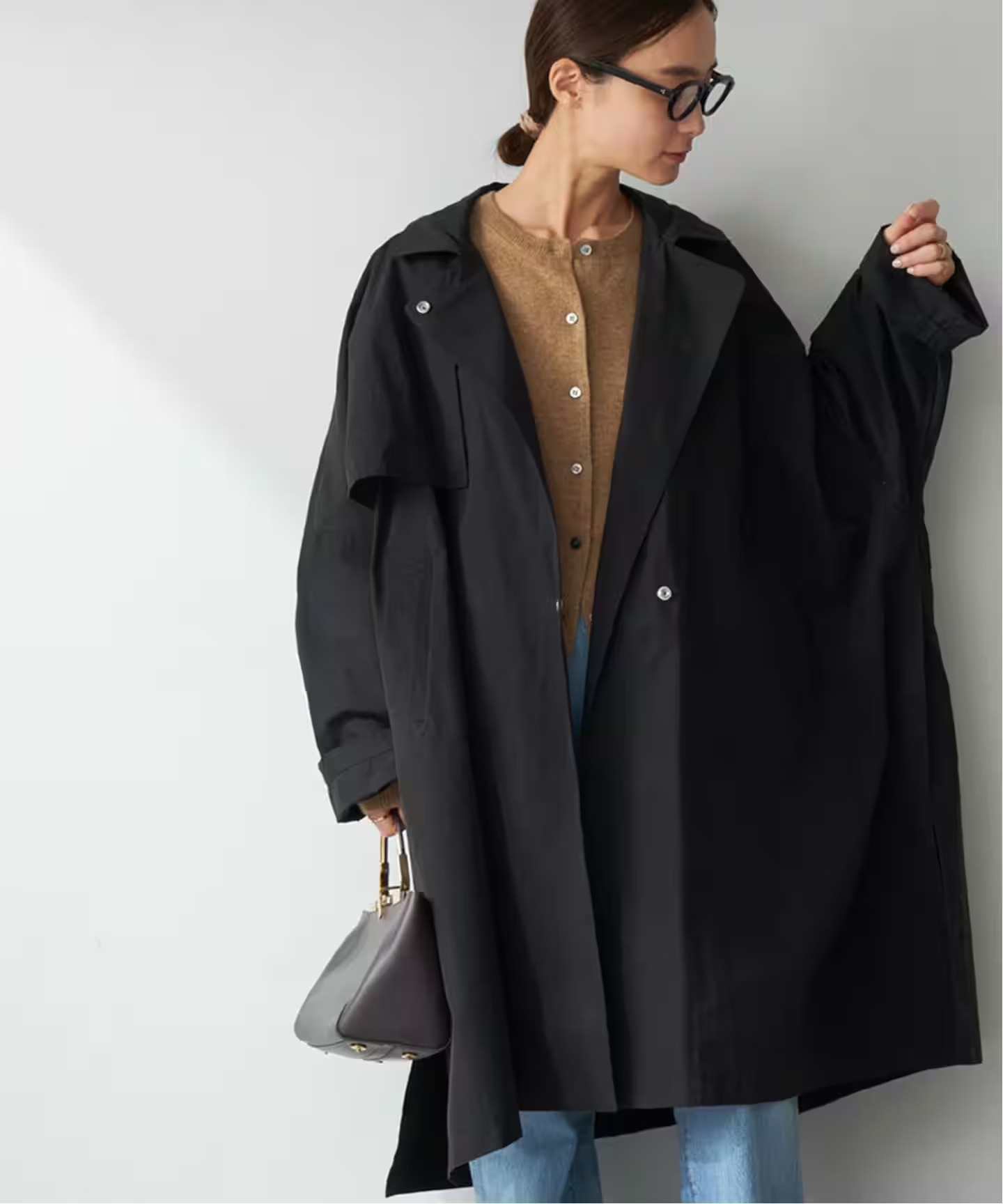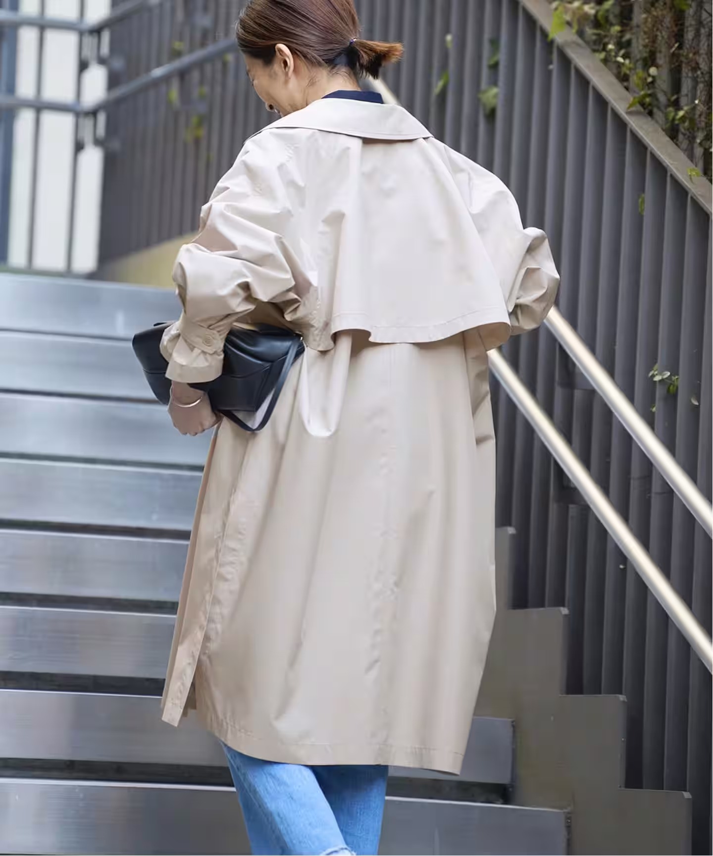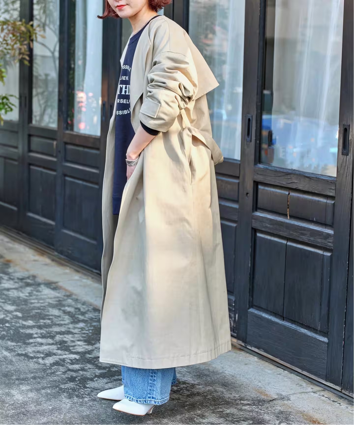 Spick & Spanのノーカラートレンチコートは、バサっと羽織るだけでマニッシュにキマるマキシ丈と顔まわりをすっきり見せるノーカラーがグッドバランス。SLOBE IENAは軽くてシワになりにくく、洗える嬉しい素材で登場。