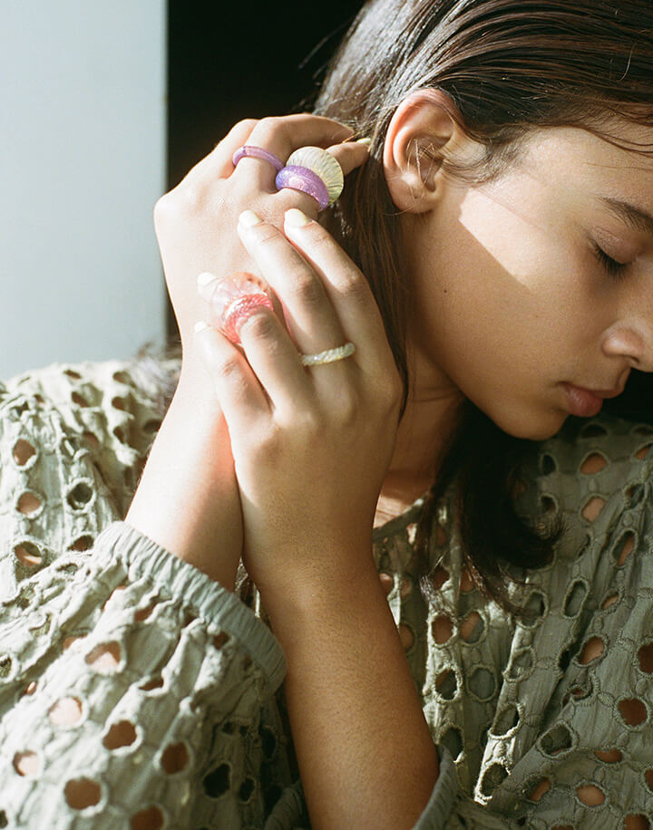 - NY発のアクセサリーブランド。オリジナルで作るカラーリングと温かみのあるデザインが特徴のリングは全てハンドメイド。グリーン、パープル、ピンク、イエローのカラーを効かせたリングをラインナップ。ボリュームやカラーでグラデーションをつけた重ね付けスタイルがおススメ◎