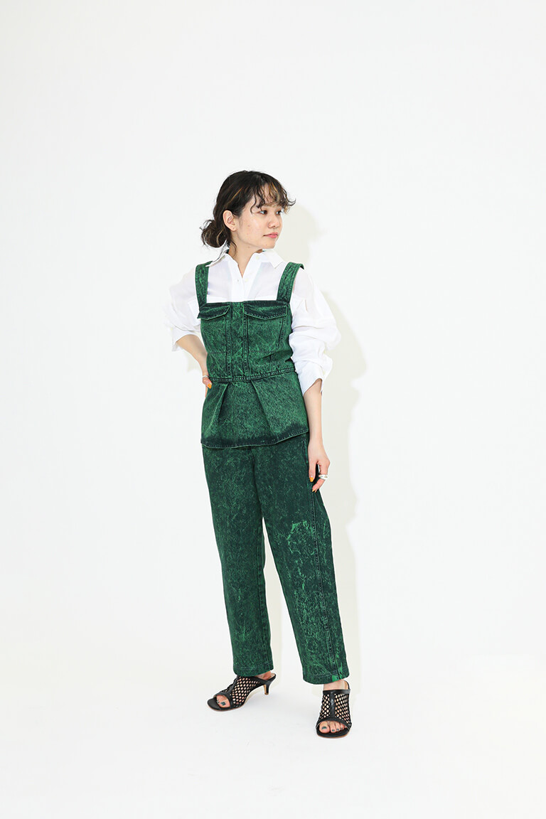 女性らしさと着心地を重視したイタリアのブランド<TELA>のビスチェとパンツのセットアップ。インポートらしいデザインと深みのあるグリーンがポイント。