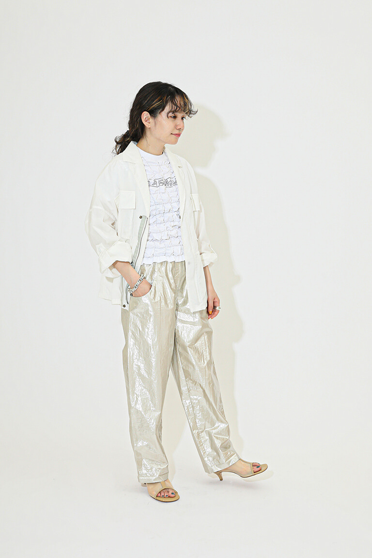 シャイニーなボトムスとヌーディサンダルで、最旬のニュアンスコーデをメイク。