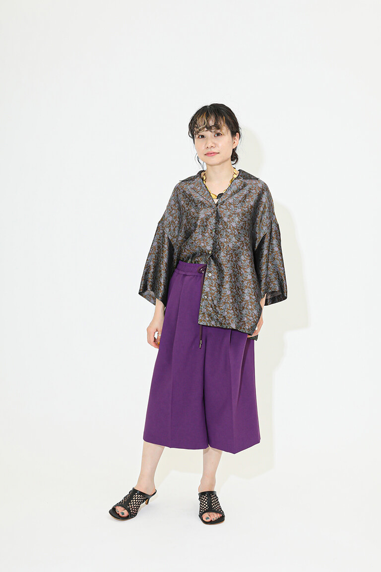 立袖幅を広めにとり、カフス部分にたっぷりタックを入れてボリューミーで立体的なシルエットに。トレンドのハーフパンツとスポサンでヘルシーとモードの両方を叶えて。