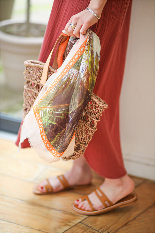 スカーフ&大きめかごバッグを携えて、さらにシティライクな印象を強めて。