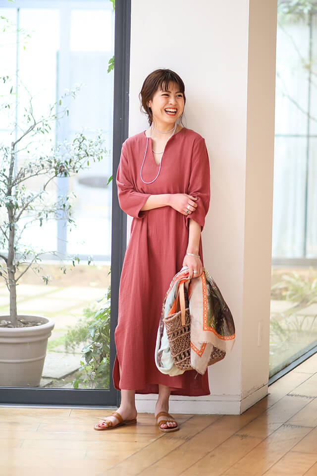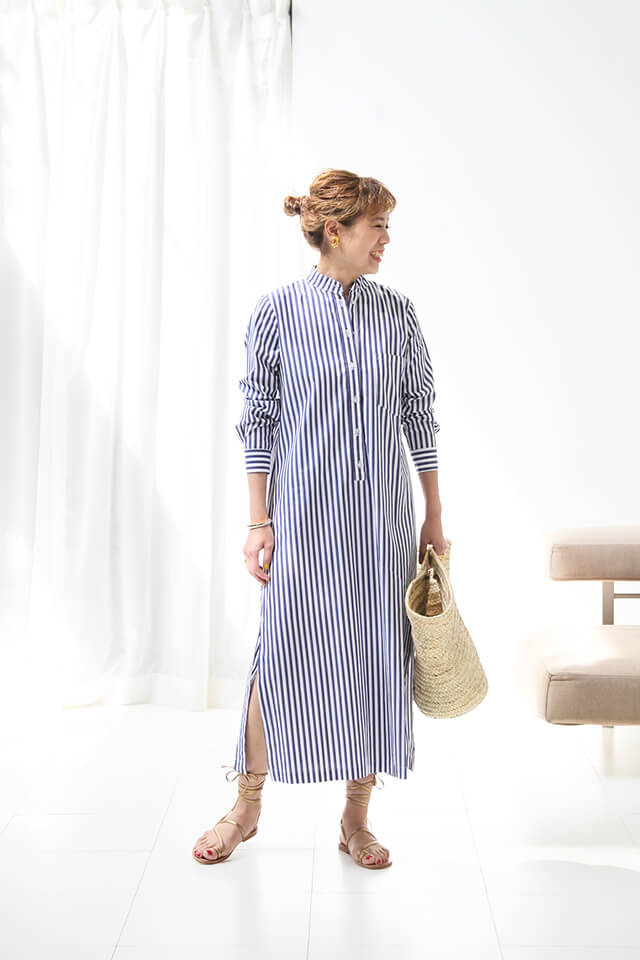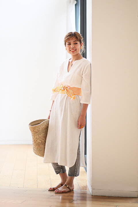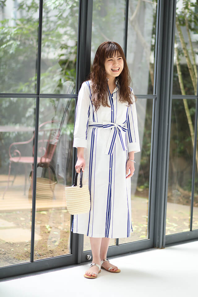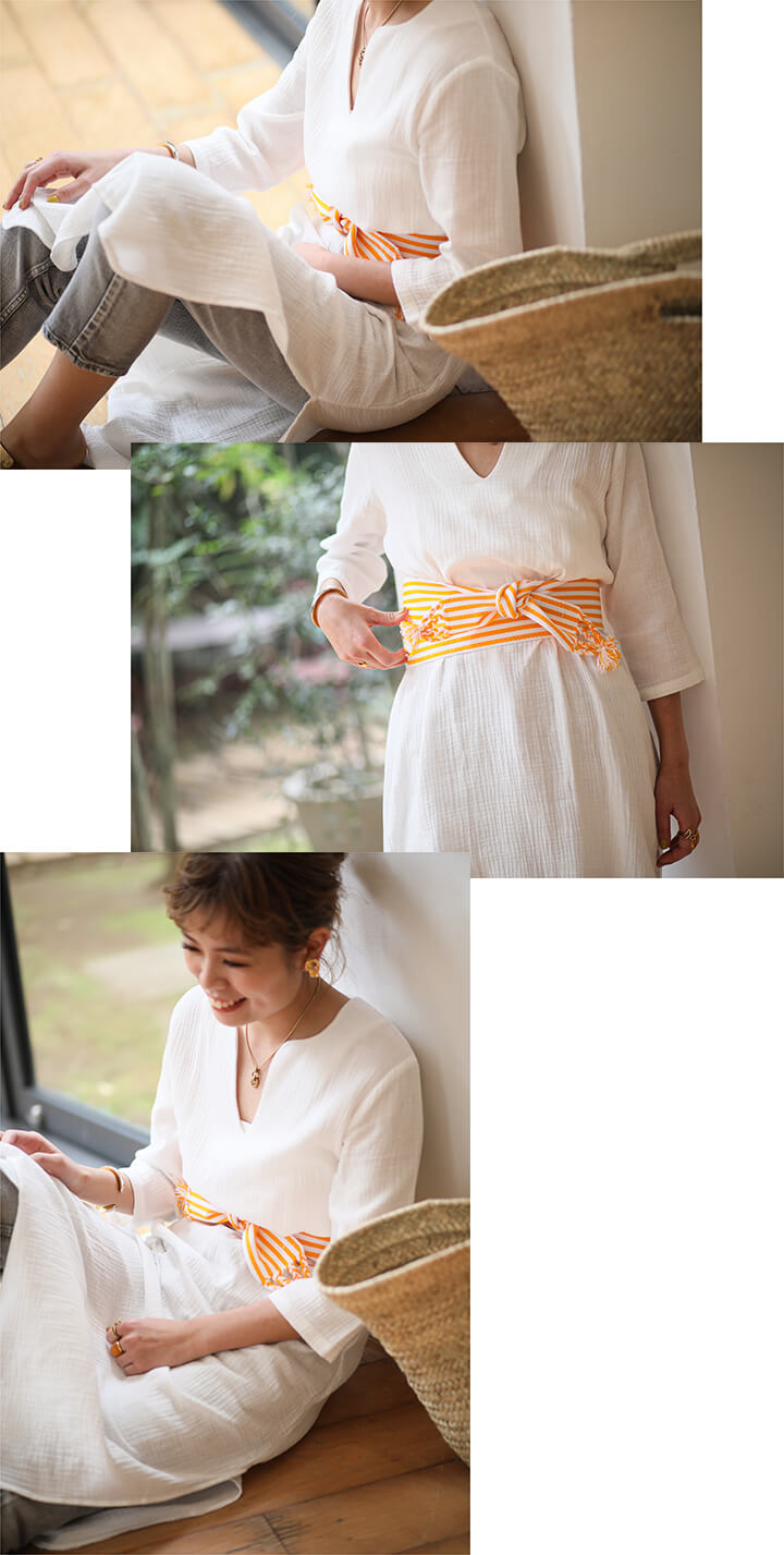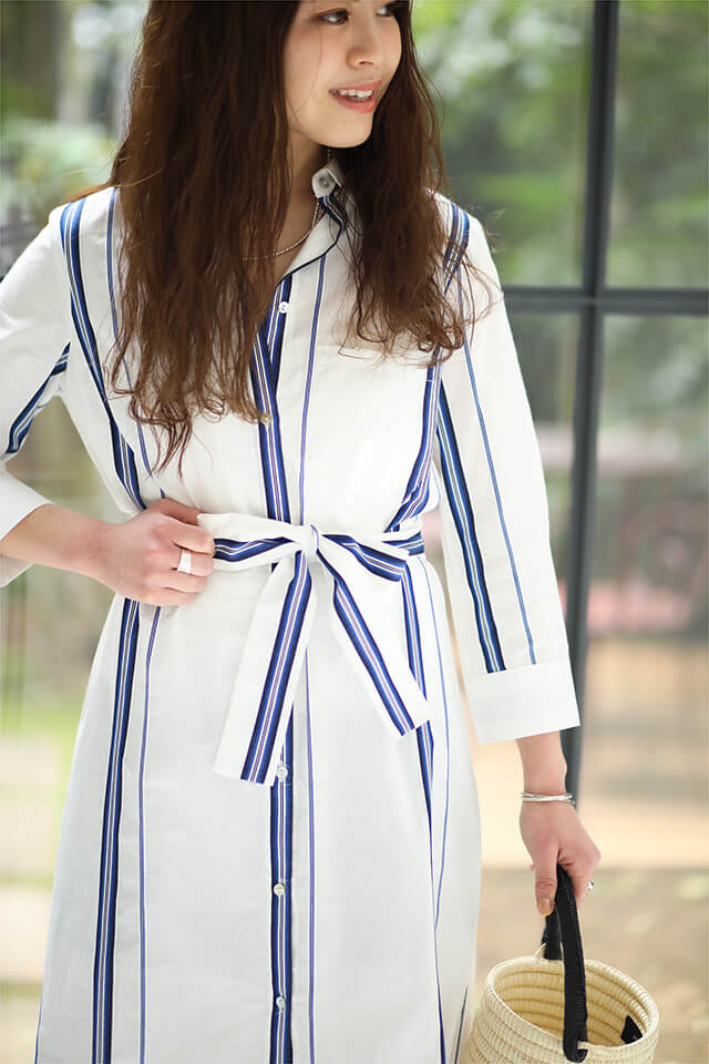 1枚でさらっと着こなすのはもちろん、ウエストをサッシュ風にリボンマークしてスタイルに抑揚を加えるのも◎。