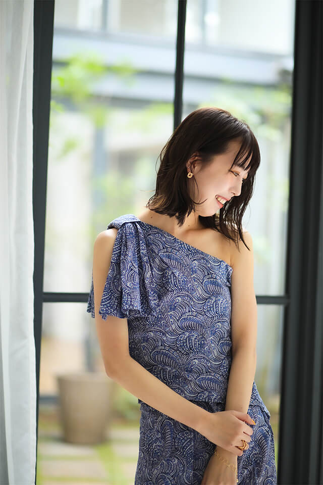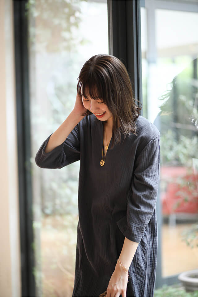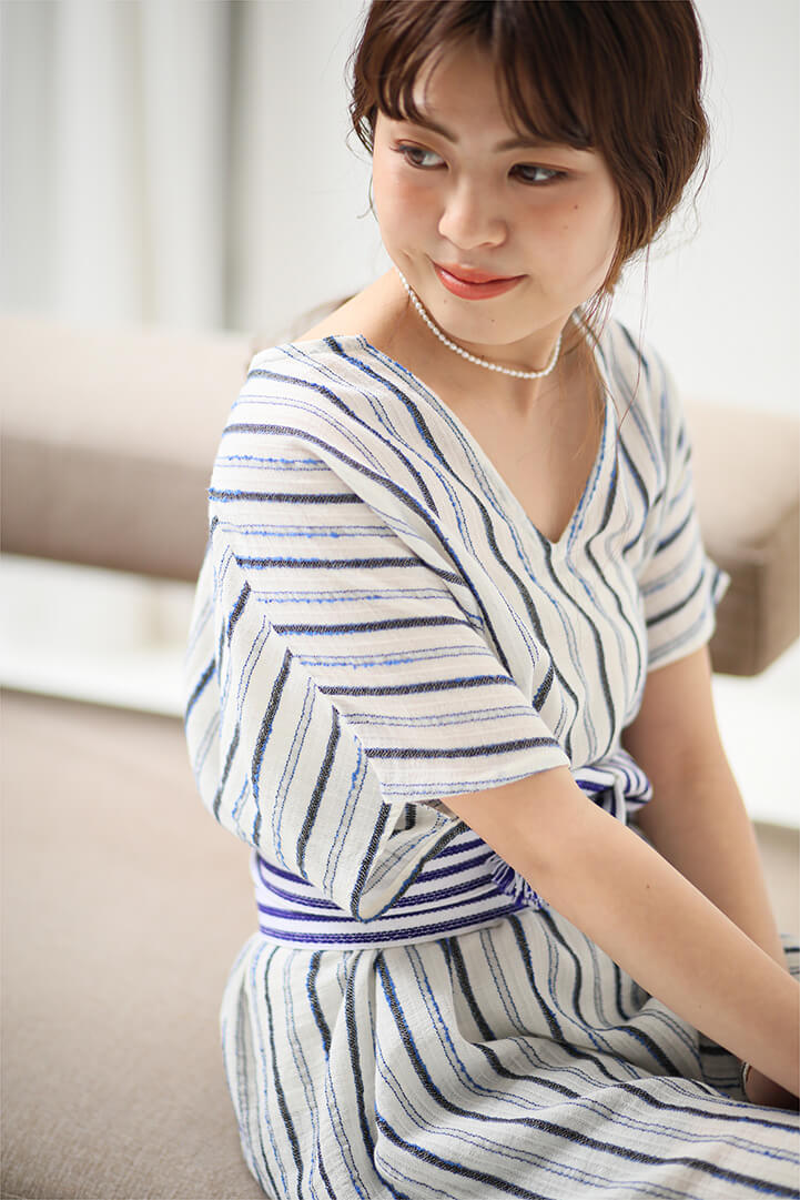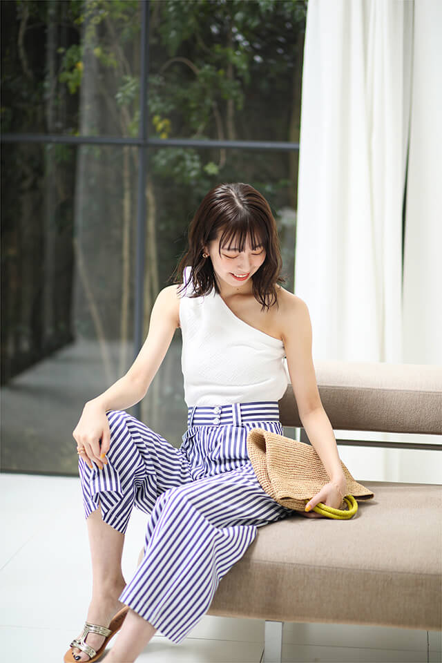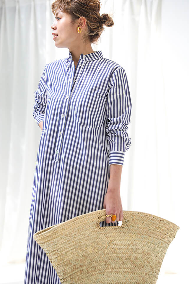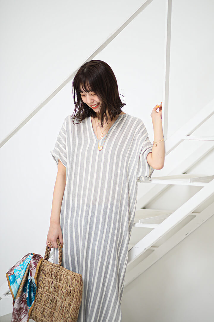 1枚でさらっと着こなすのはもちろん、ウエストをサッシュ風にリボンマークしてスタイルに抑揚を加えるのも◎。