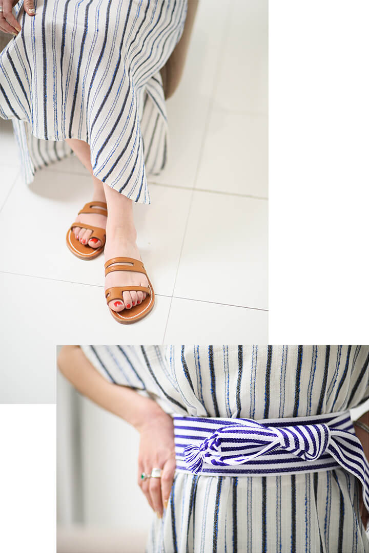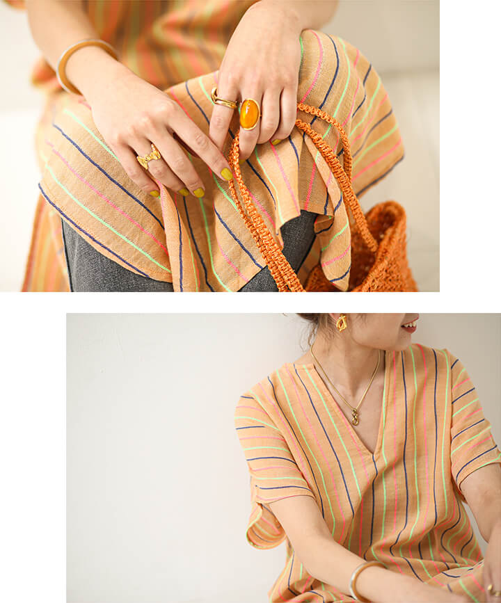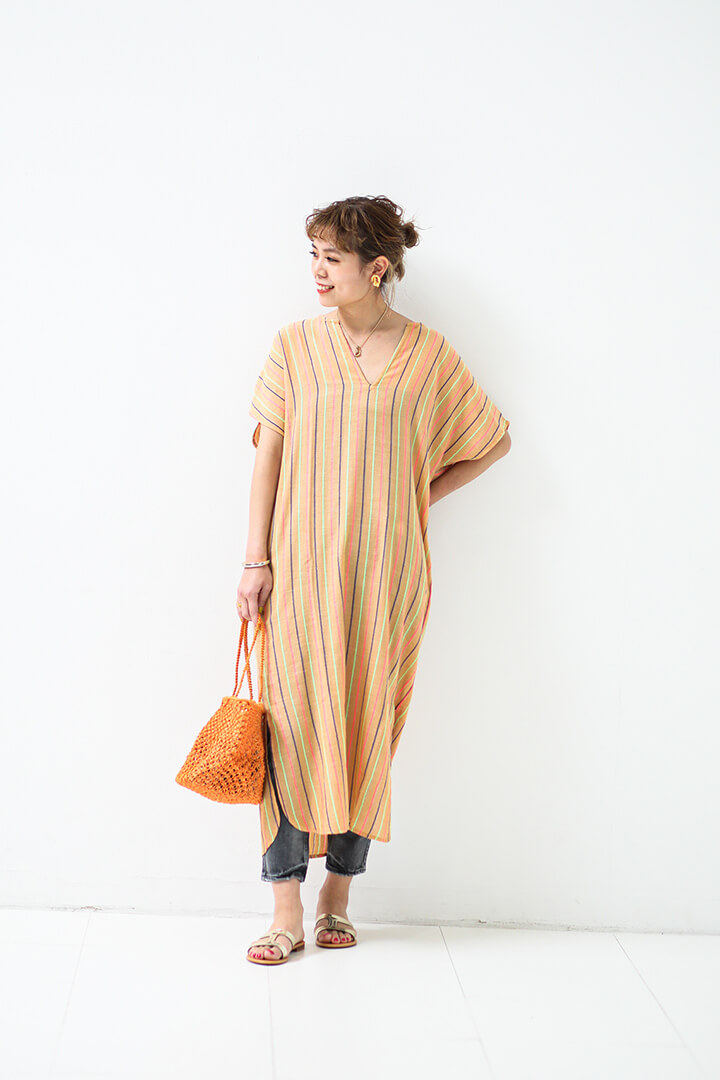 チアフルなオレンジがハッピーな気分になる、爽やかなストライプのカフタンドレス。