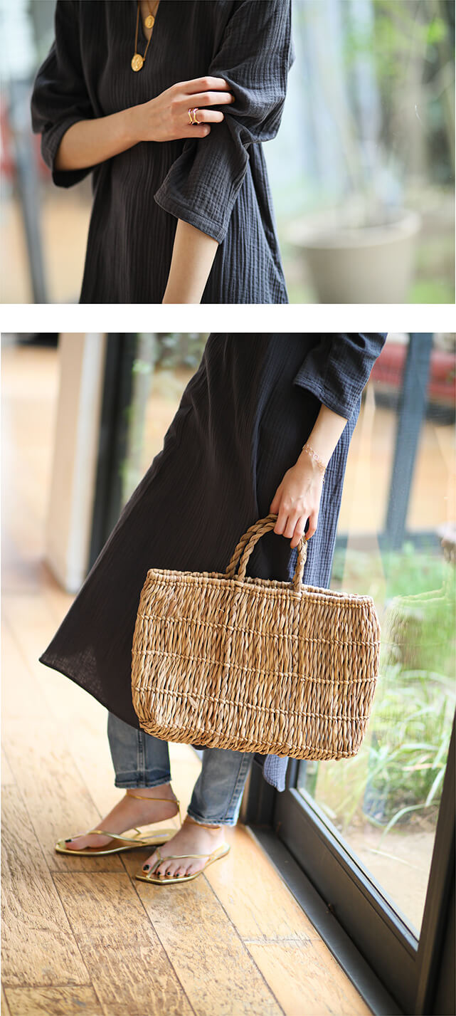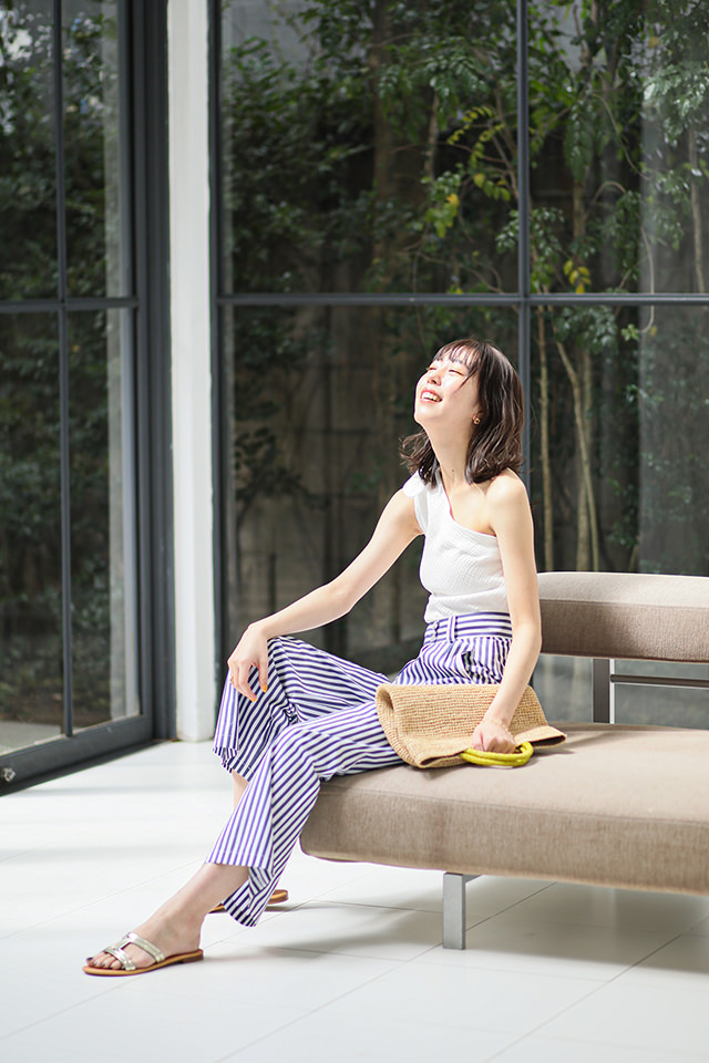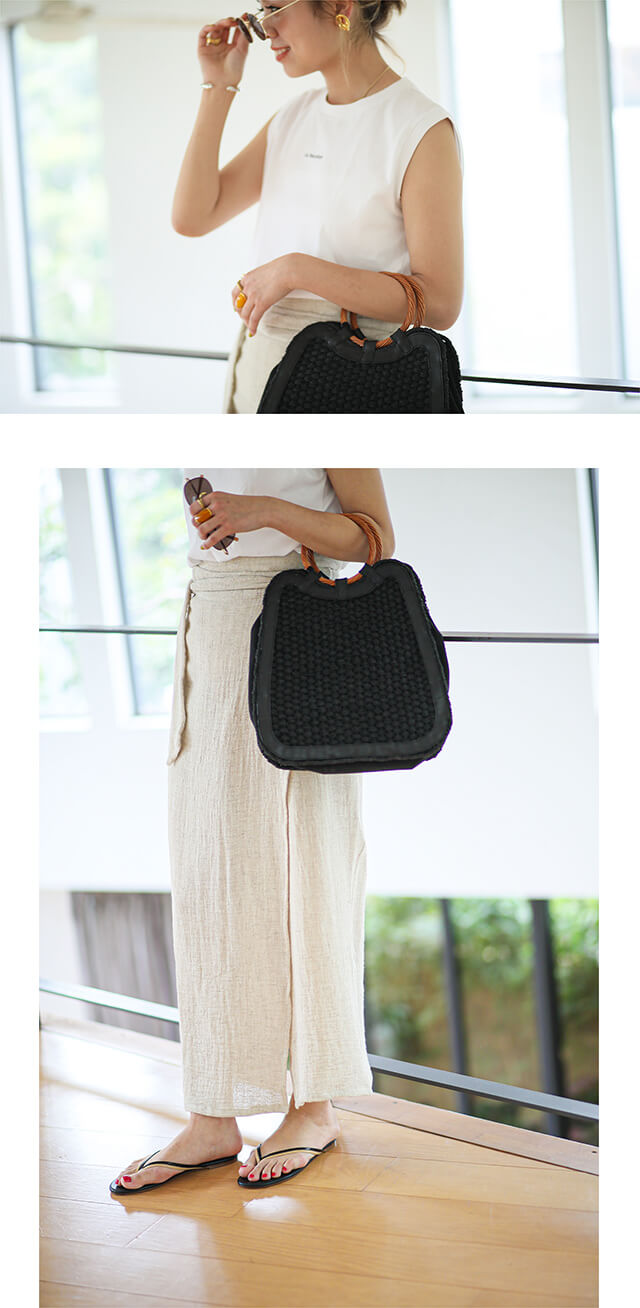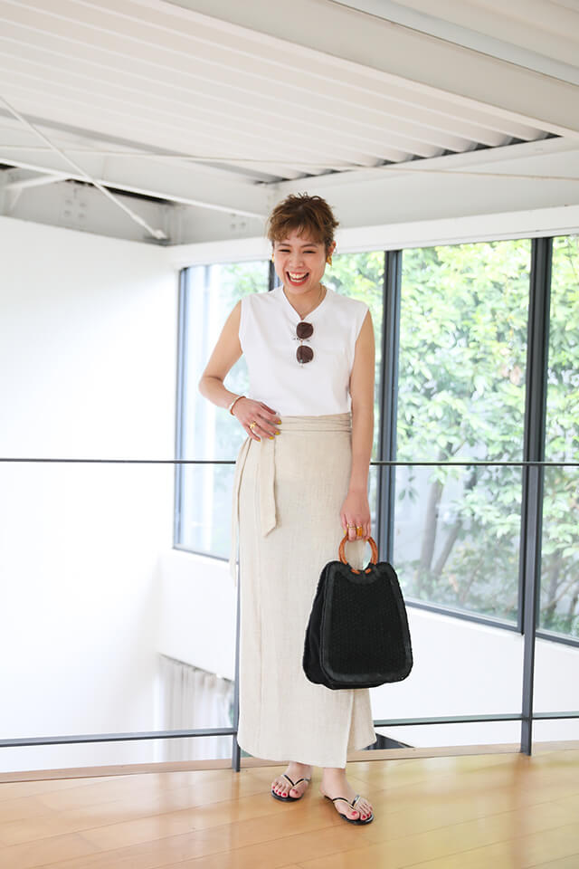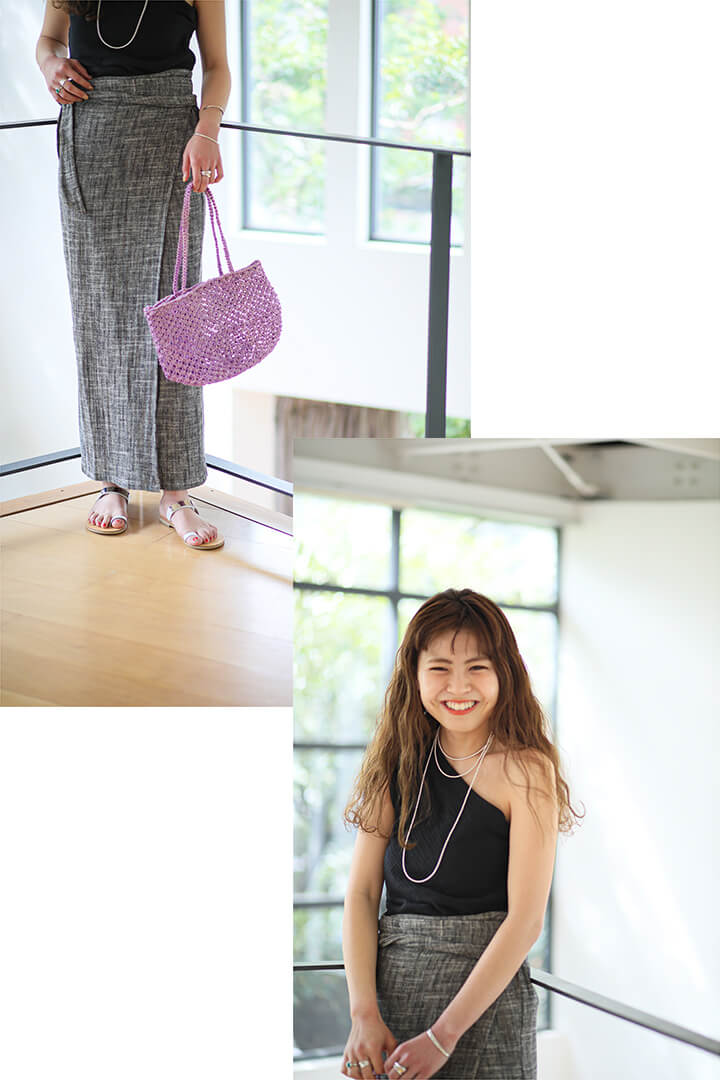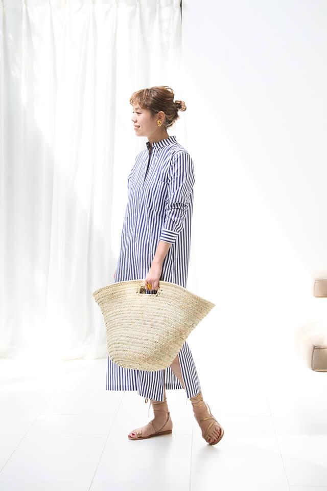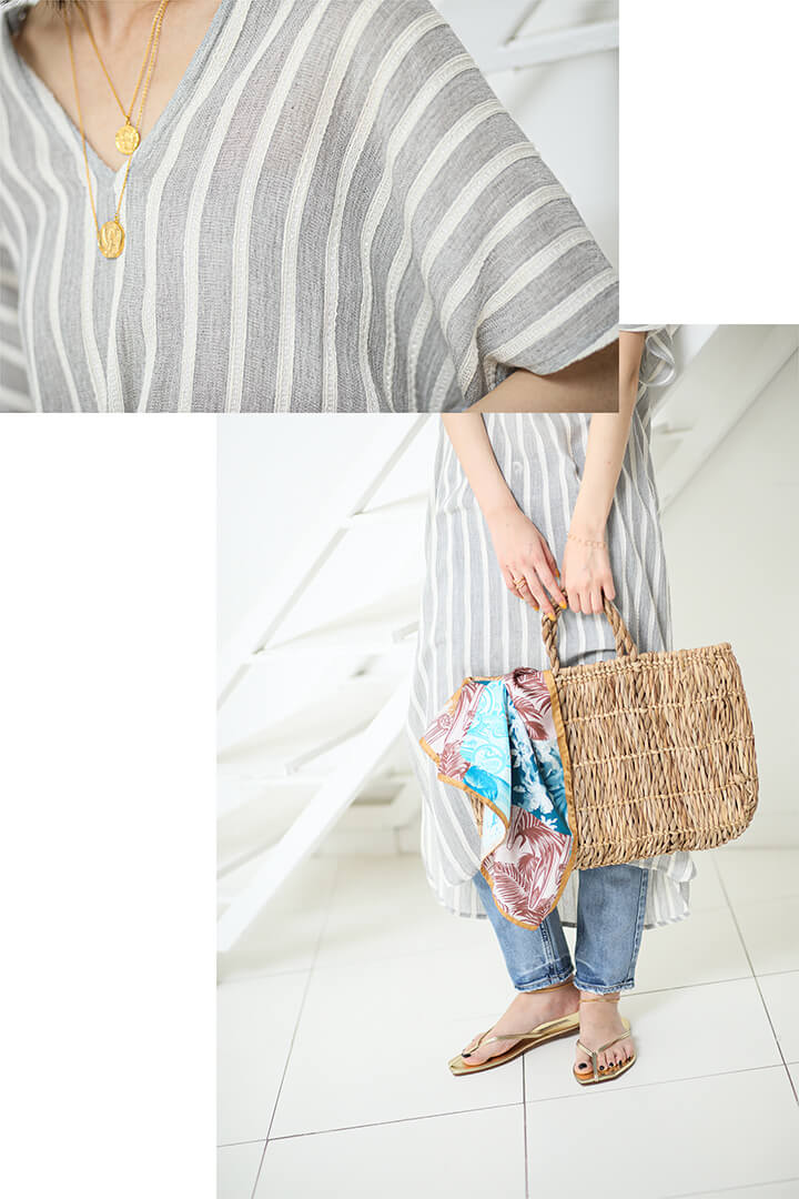 ナチュラル素材のバッグやモチーフネックレス、ゴールドのサンダルでリズムを加えたい。