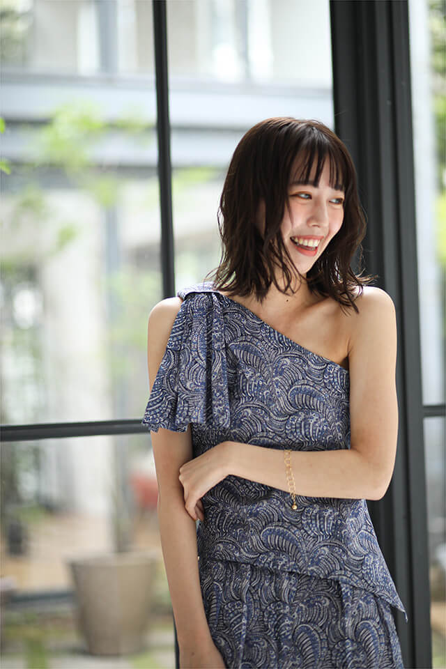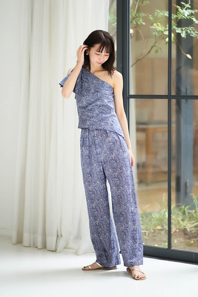 ヘルシーなワンショルダーブラウスを、シックなペイズリー柄で仕立てて使い勝手よくアレンジ。