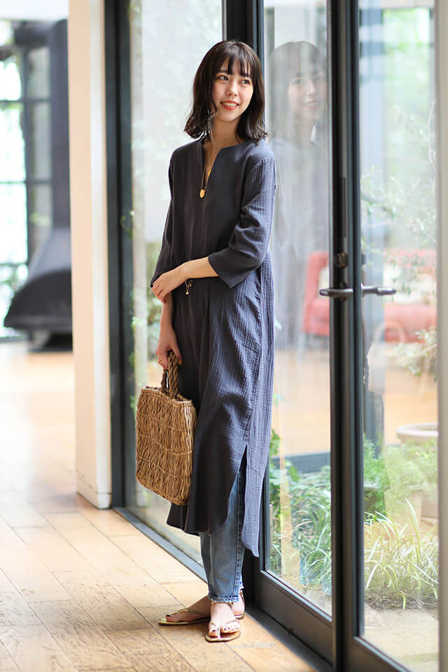 ナチュラルなコットンの風合いと、大人っぽくすっきりと着られるミニマルなデザインのカフタンドレス。ウエストにワンポイントを添えつつ、サイドのスリットからのぞくデニムでラフなムードに。