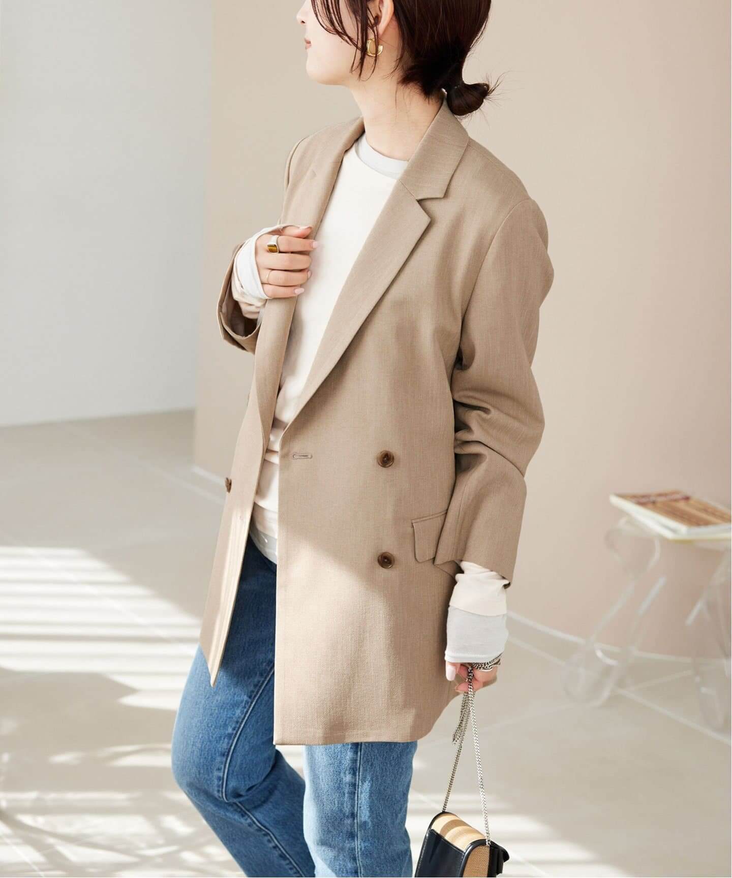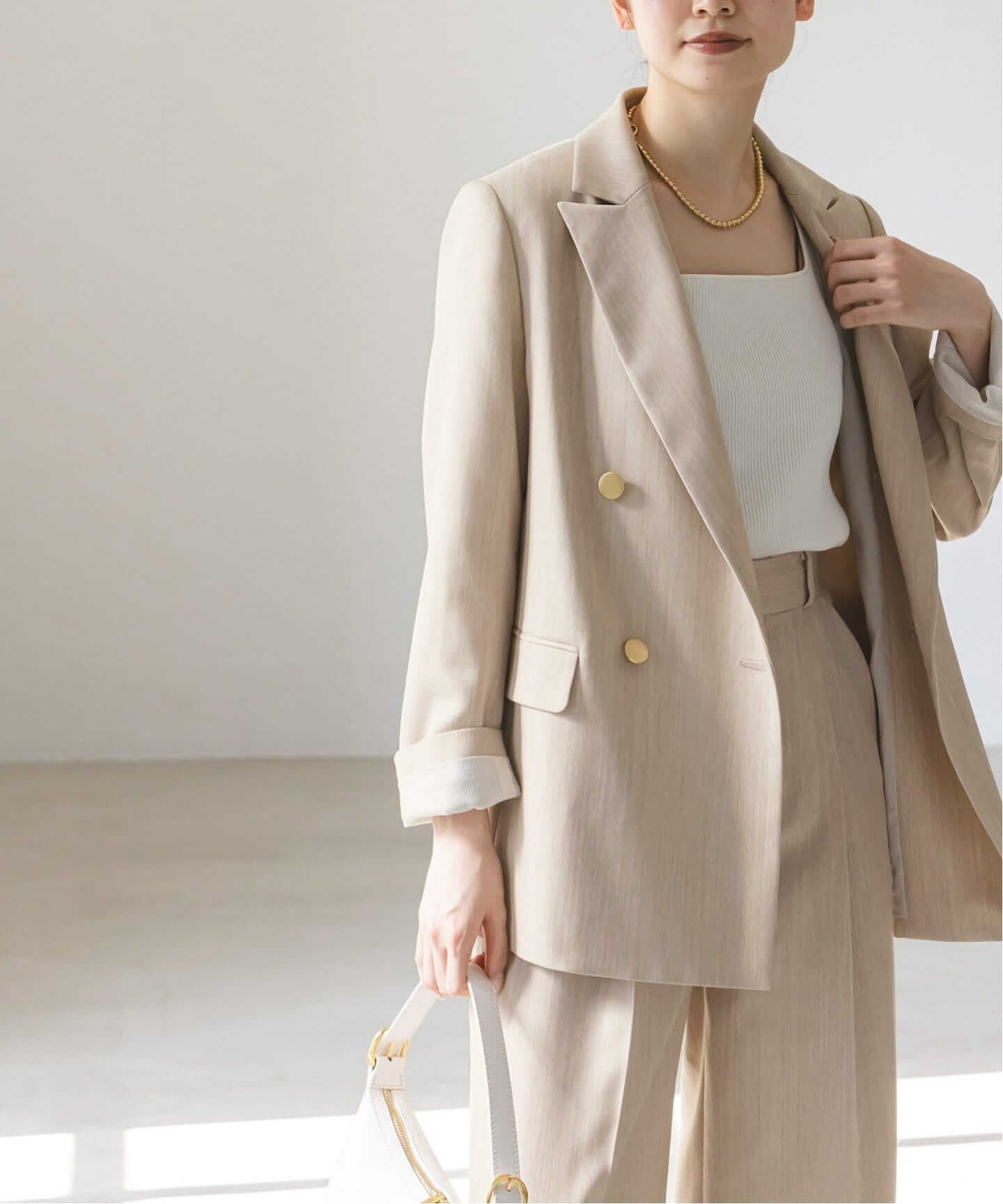 定番アイテムに高揚感のあるディテールをプラスゴールドボタンが華やかなアクセントになるDeuxieme Classeのクルーネックカーディガン。NOBLEはトリコチンピークドラペルジャケット。ツヤのある上品な素材でありながらカーディガン感覚で羽織れるストレスフリーな着心地。