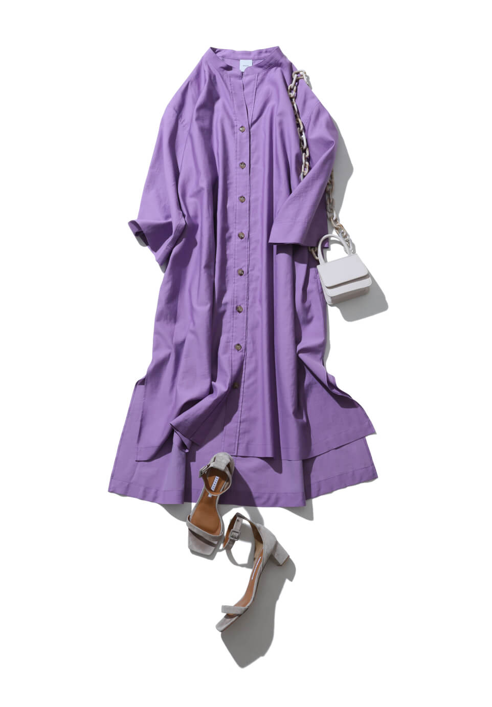 春らしいパープルのシャツワンピースをまとって印象を華やかに。スッキリしたバンドカラーや落ち感のあるゆったり袖、サイドに深めに入ったスリットなど、気負わずこなれ感のあるディテールで差をつけて。大振りのチェーンが目を引くショルダーバッグをコーデのワンポイントに。
