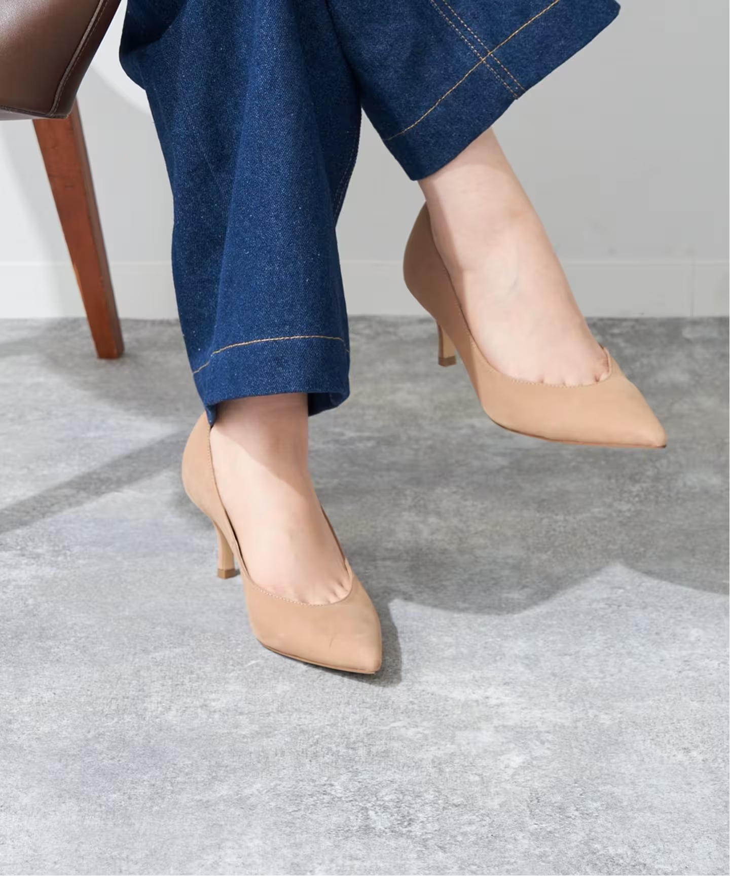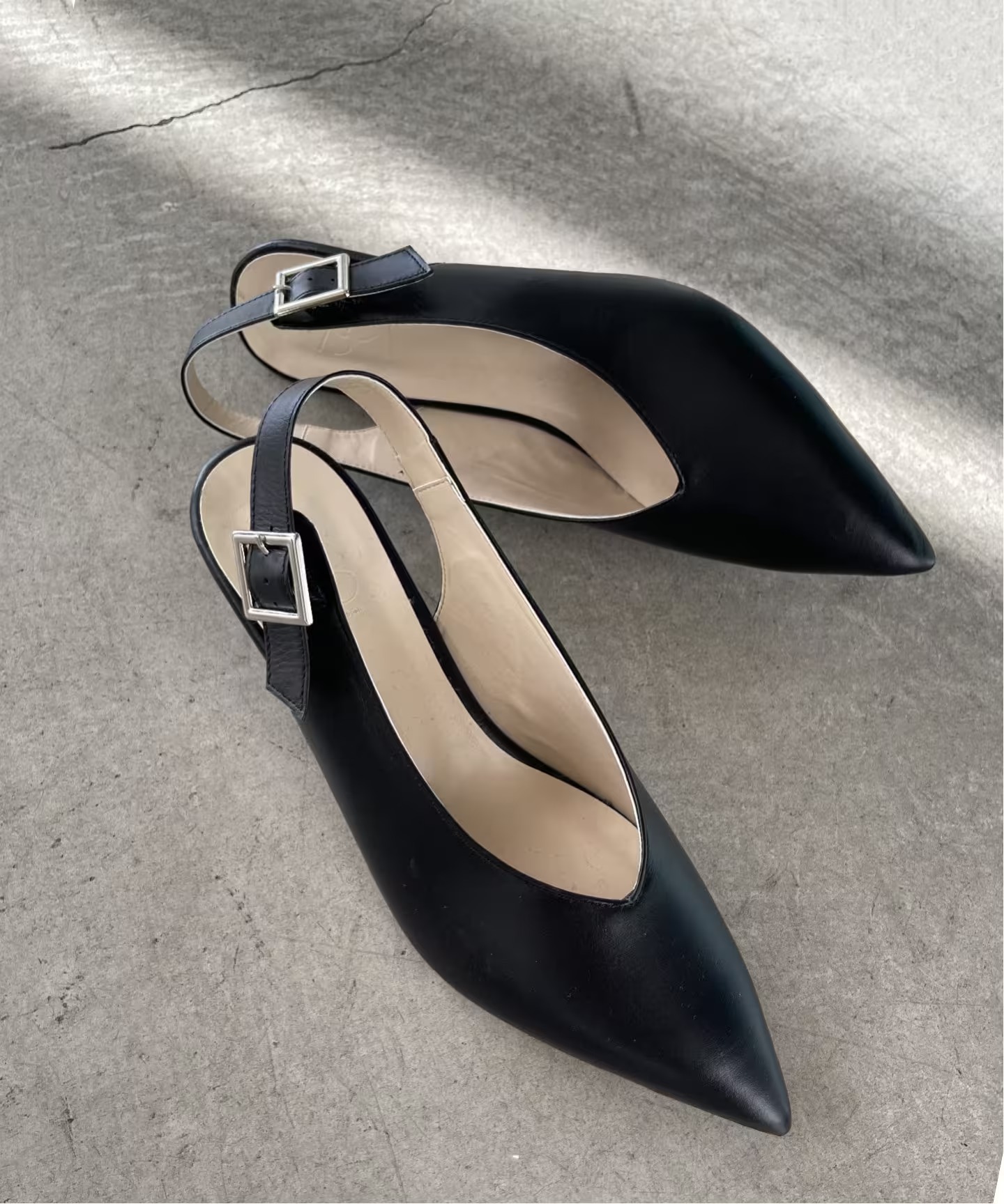 レディにキマるスクエアやラウンドといったトゥ人気が続いていたパンプスに、女性らしいムードを高めるポインテッドが復調の兆し。かかとが見えるスリンバックデザインなどで抜け感を加えて。