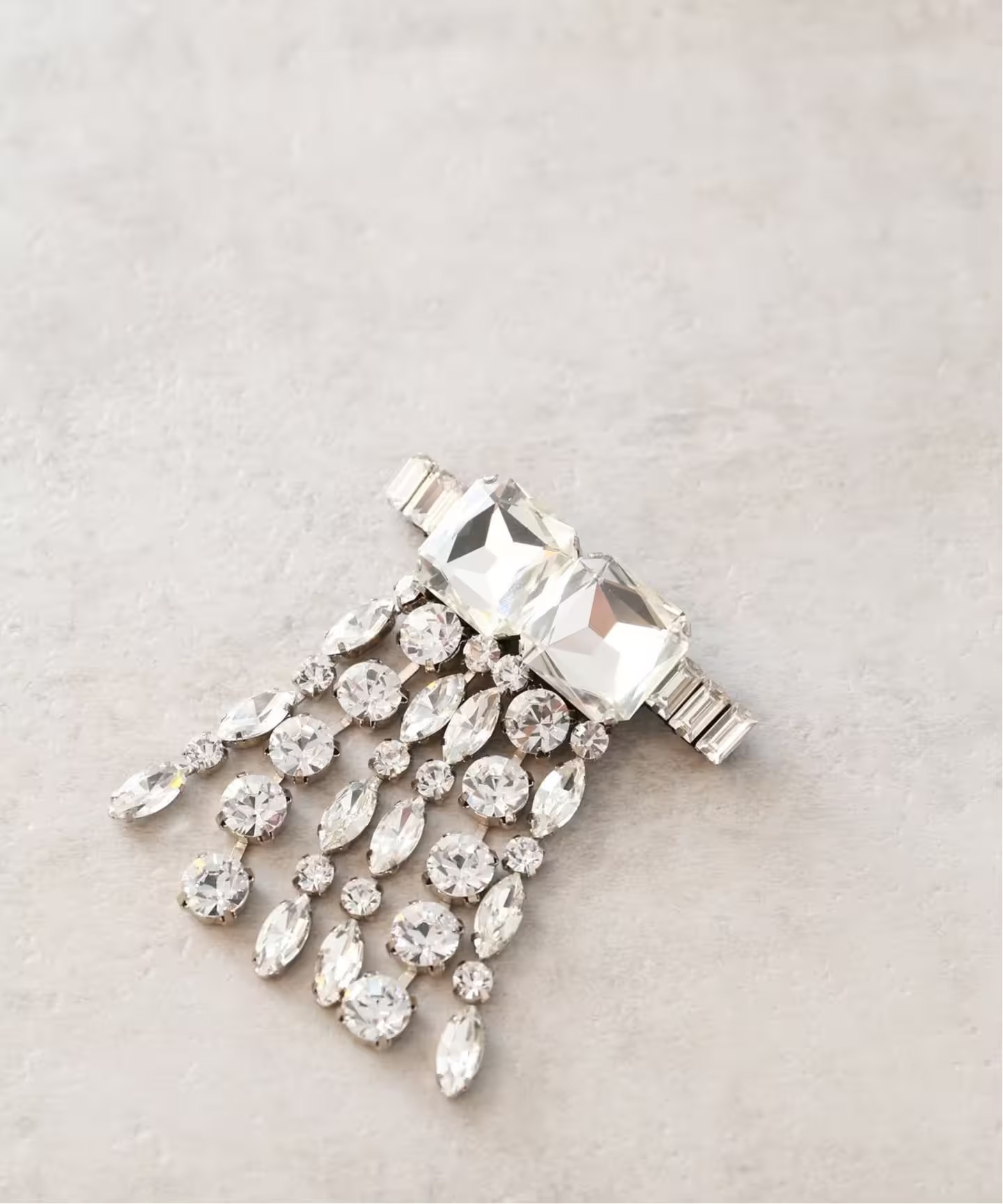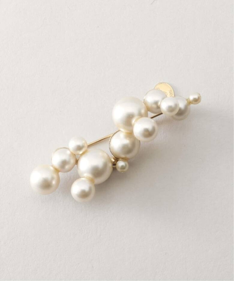 リュクスなブローチ&コサージュじわりじわりと人気をよんでいるブローチ。さまざまな大きさのパールが散りばめられたJunco Parisパールブローチは上品な存在感が◎。顔周りにモダンなアクセントをプラスして。