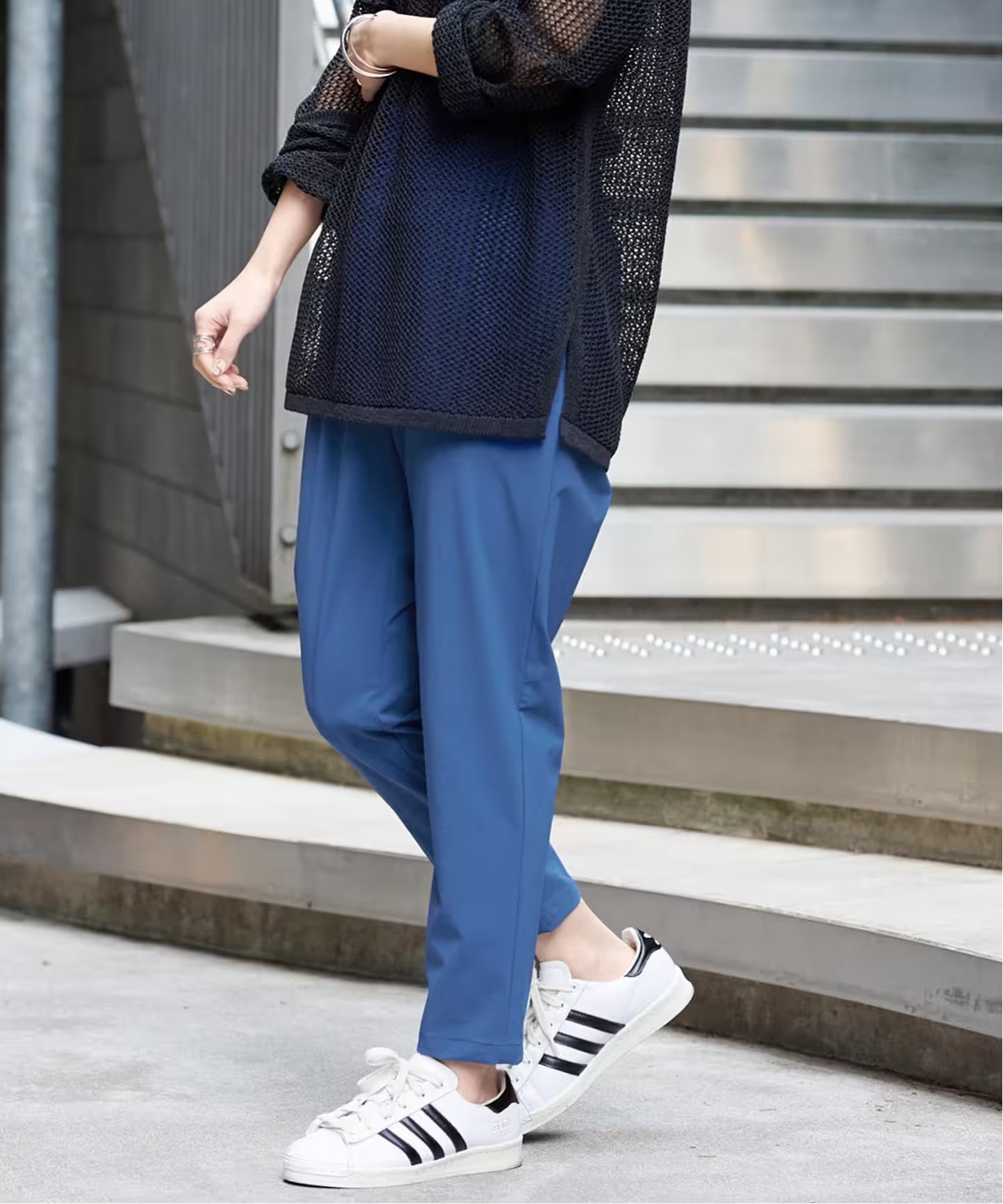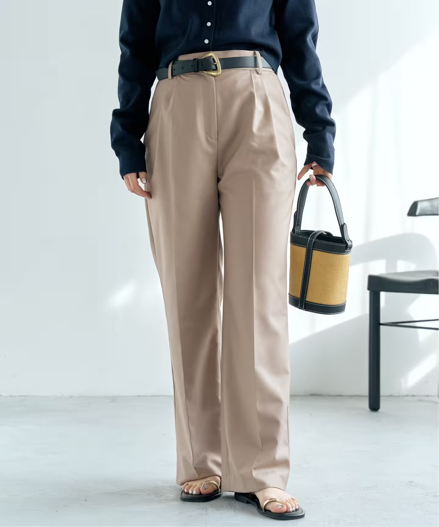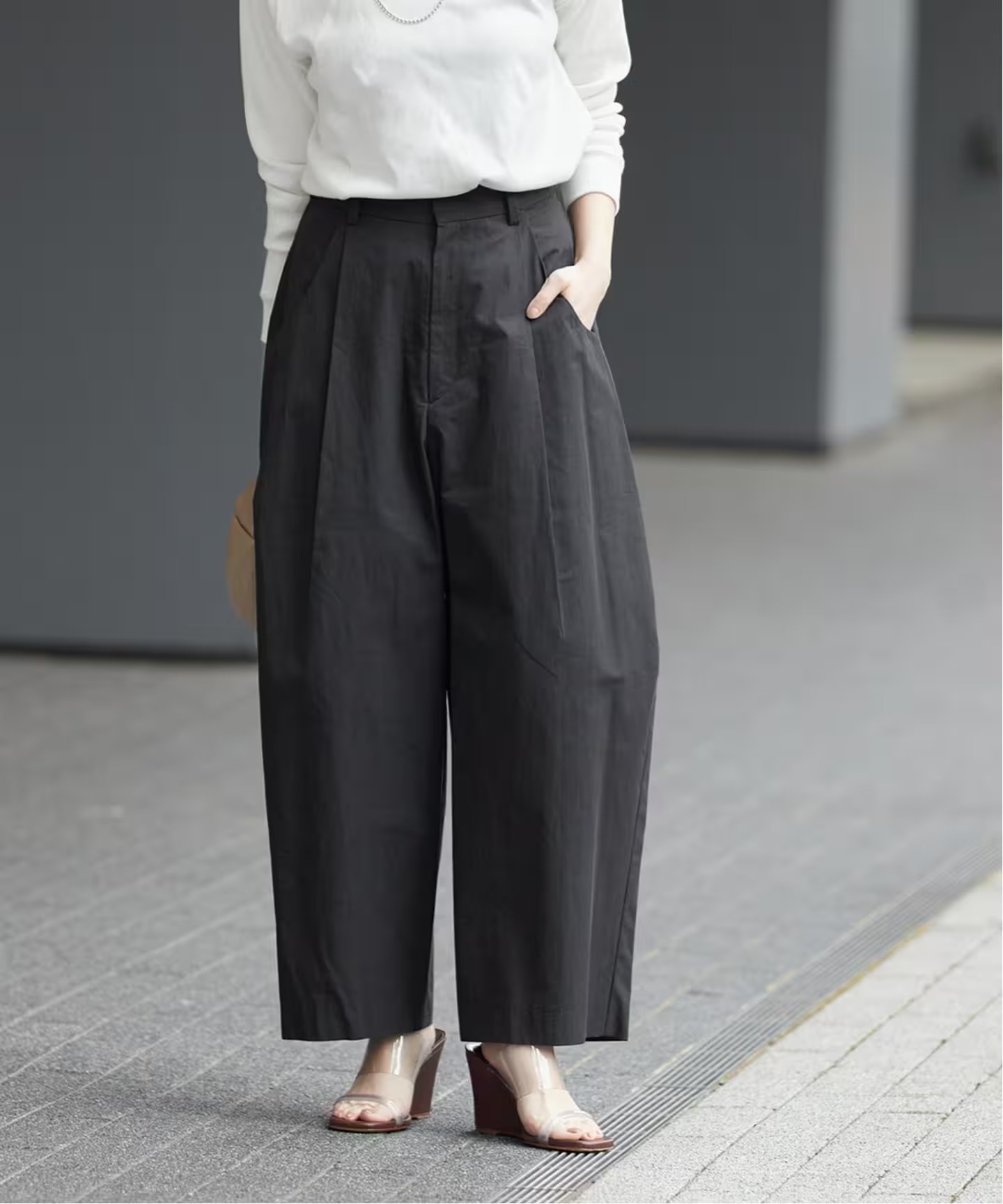 今っぽいイージーパンツはJOURNAL STANDARDナイロンストレッチパンツがお手本。カジュアルすぎない美シルエットが着回し力抜群。コーデの主役になるデザインならNOBLEのペーパーバッグタックワイドパンツ。
