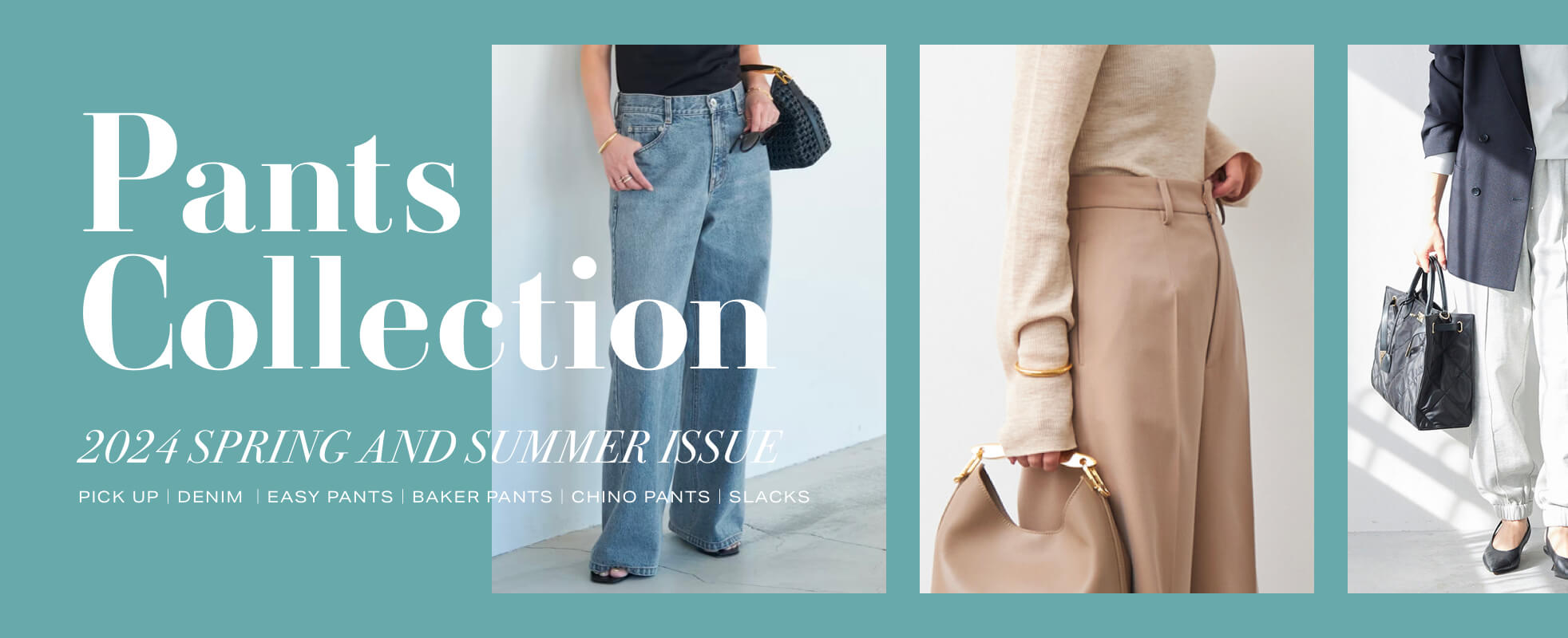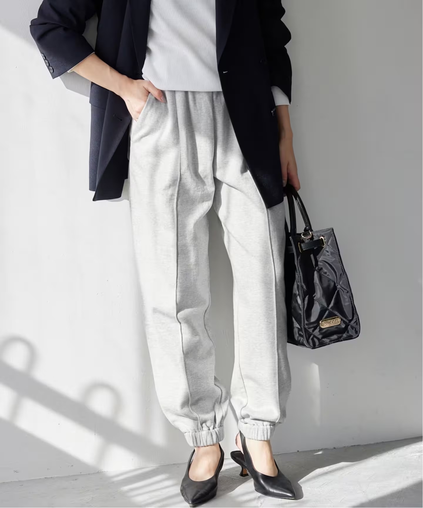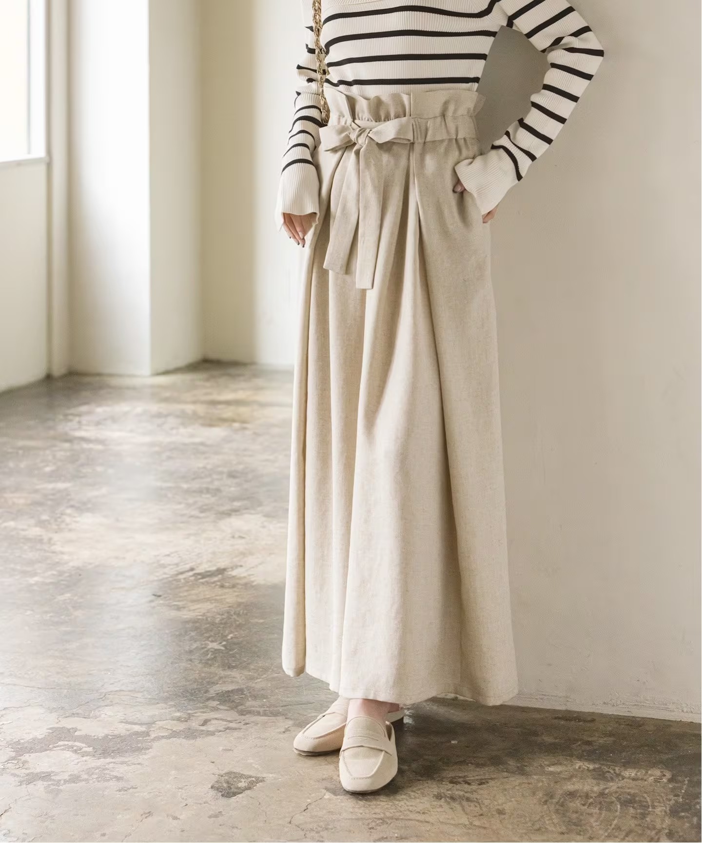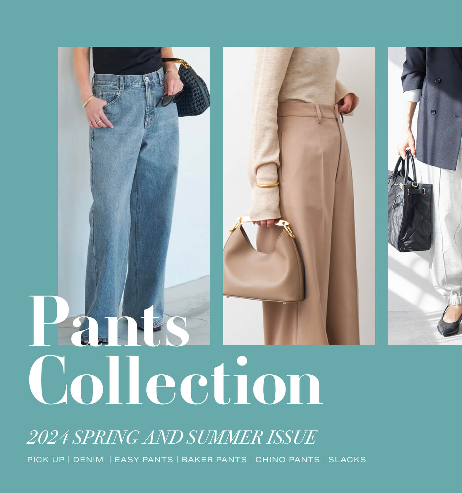今っぽいイージーパンツはJOURNAL STANDARDナイロンストレッチパンツがお手本。カジュアルすぎない美シルエットが着回し力抜群。コーデの主役になるデザインならNOBLEのペーパーバッグタックワイドパンツ。