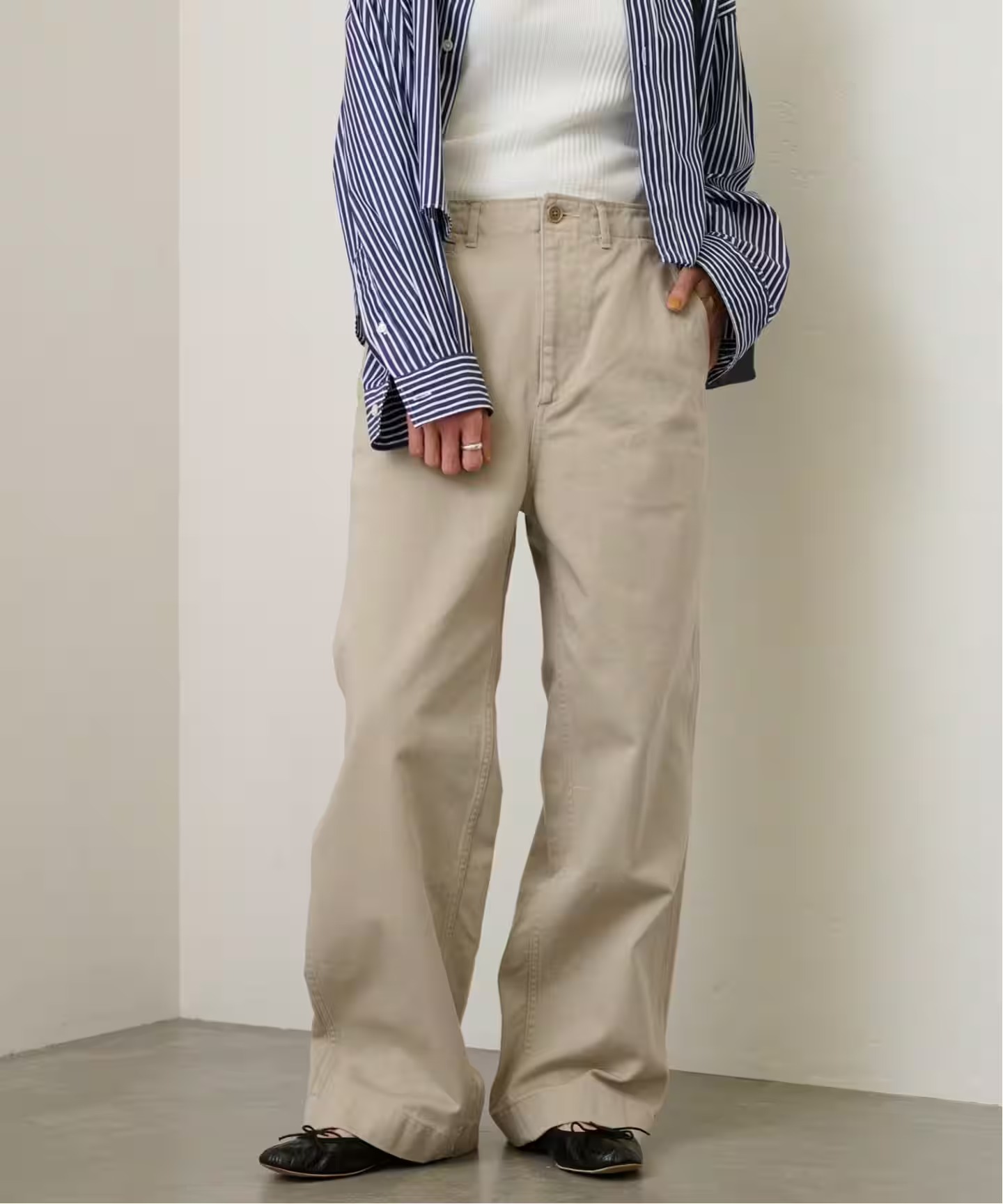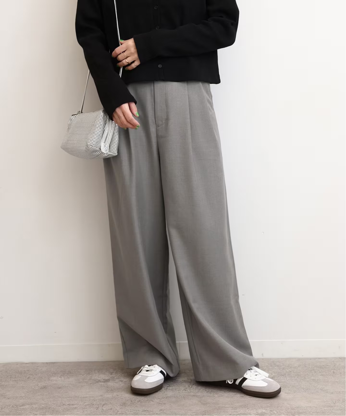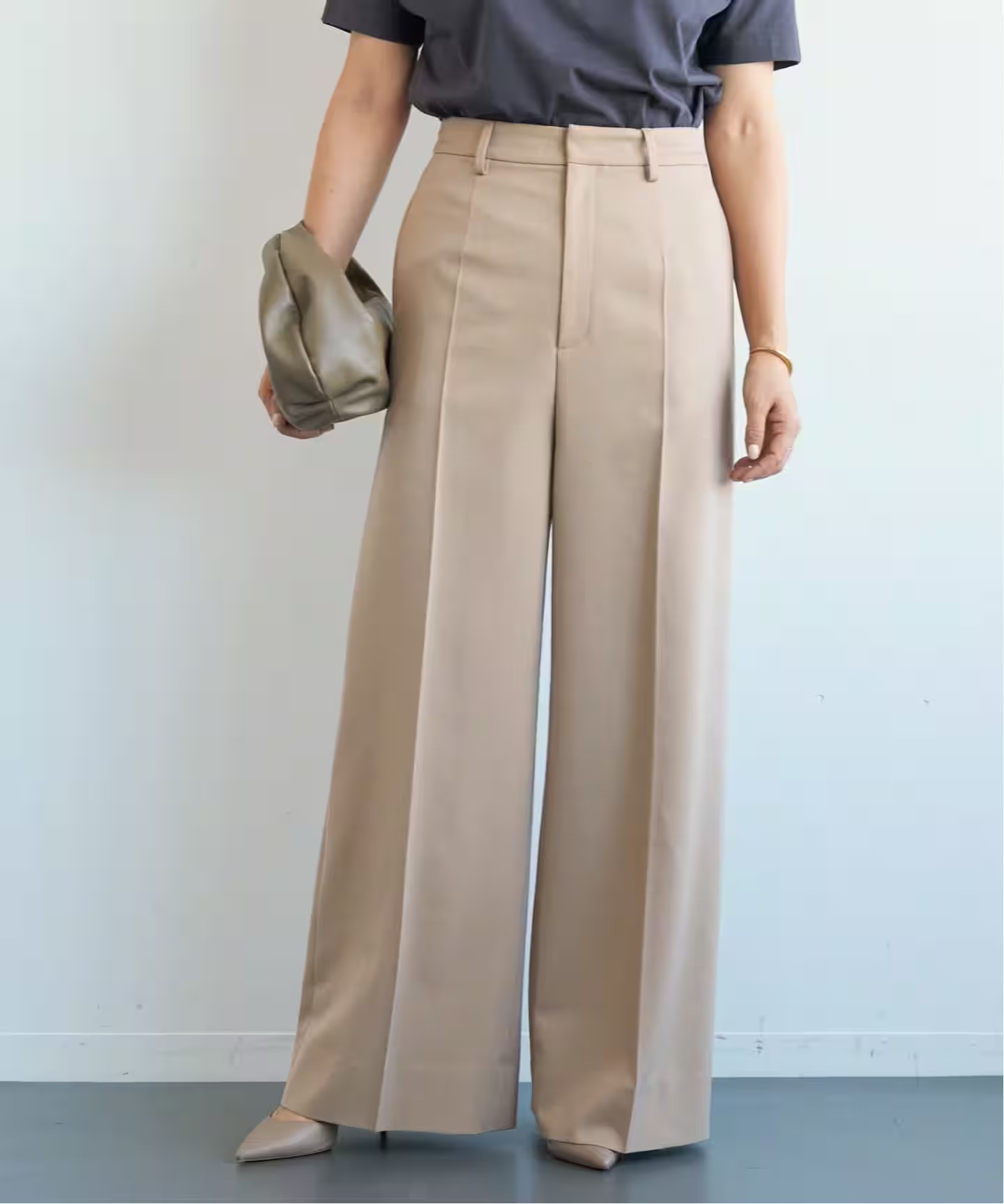 SLOBE IENAのセンタープレスチノパンツは、カジュアルすぎないセンタープレス入りのテーパード。relumeのワイドベイカーパンツも細見えして、上品&クラシカルなフェミニンコーデにグッドバランス。