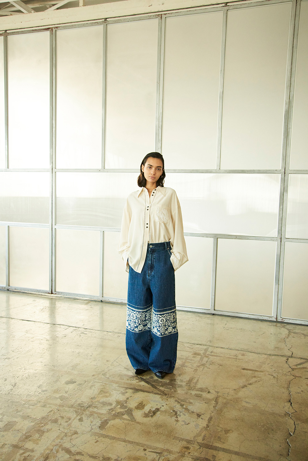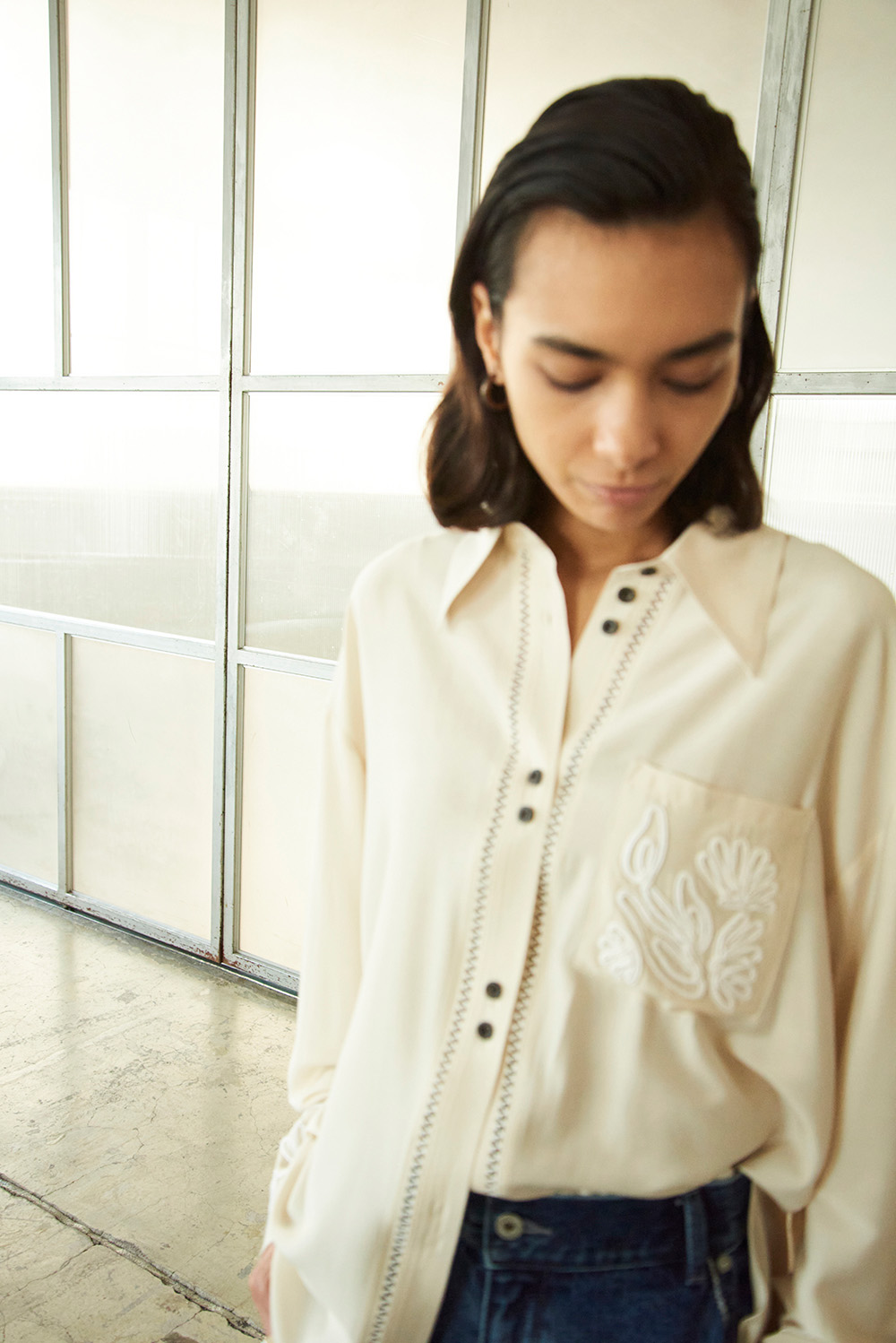 胸もとと袖口にコード刺しゅうを施したマニッシュなシャツは、ウエスタンシャツのようなハンサムさがポイント。表情が異なる2素材での展開で、軽さのある繊細なストライプ素材と、薄手でとろみのある微光沢素材がある。シンプルな見た目ながら細部へのこだわりに注目。