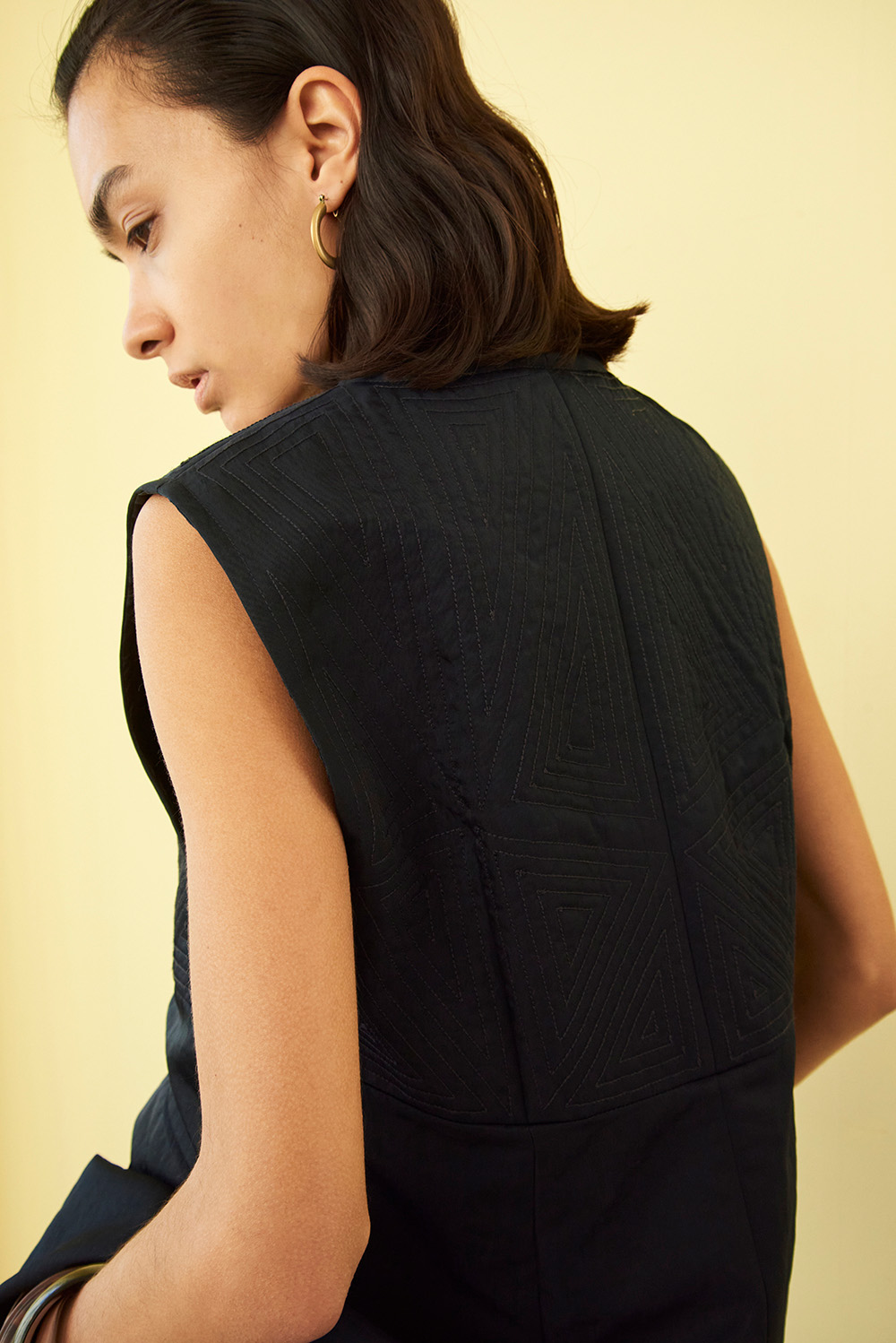 上半身に幾何柄のステッチを施したモードな印象のベスト。ボクシーなシルエットでマスキュリンな見た目ながら、胸もとのキーネックを曲線的なカッティングにして女性らしさも同居。フロントジップで前を開けても締めても着用でき、ダブルジップでシルエットに変化もつけられるようになっているのでボトムスを選ばず取り入れやすい。