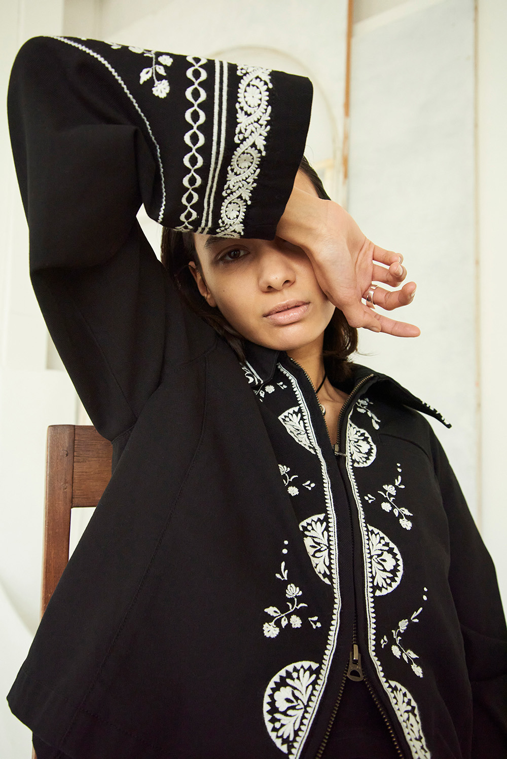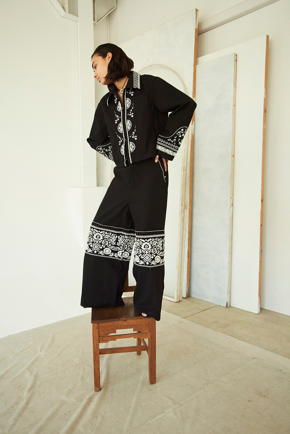 オリエンタルな刺しゅうがポイントのショートジャケットとパンツ。主張がありながらも柔らかい印象になるよう主に曲線的な植物モチーフを多く用い、アジアや東欧の刺しゅうに見られる大ぶりのモチーフなどを組み合わせたオリジナルのデザイン。シンプルな装いにプラスするだけで様になるデザインは、セットアップ着用もおすすめ。
