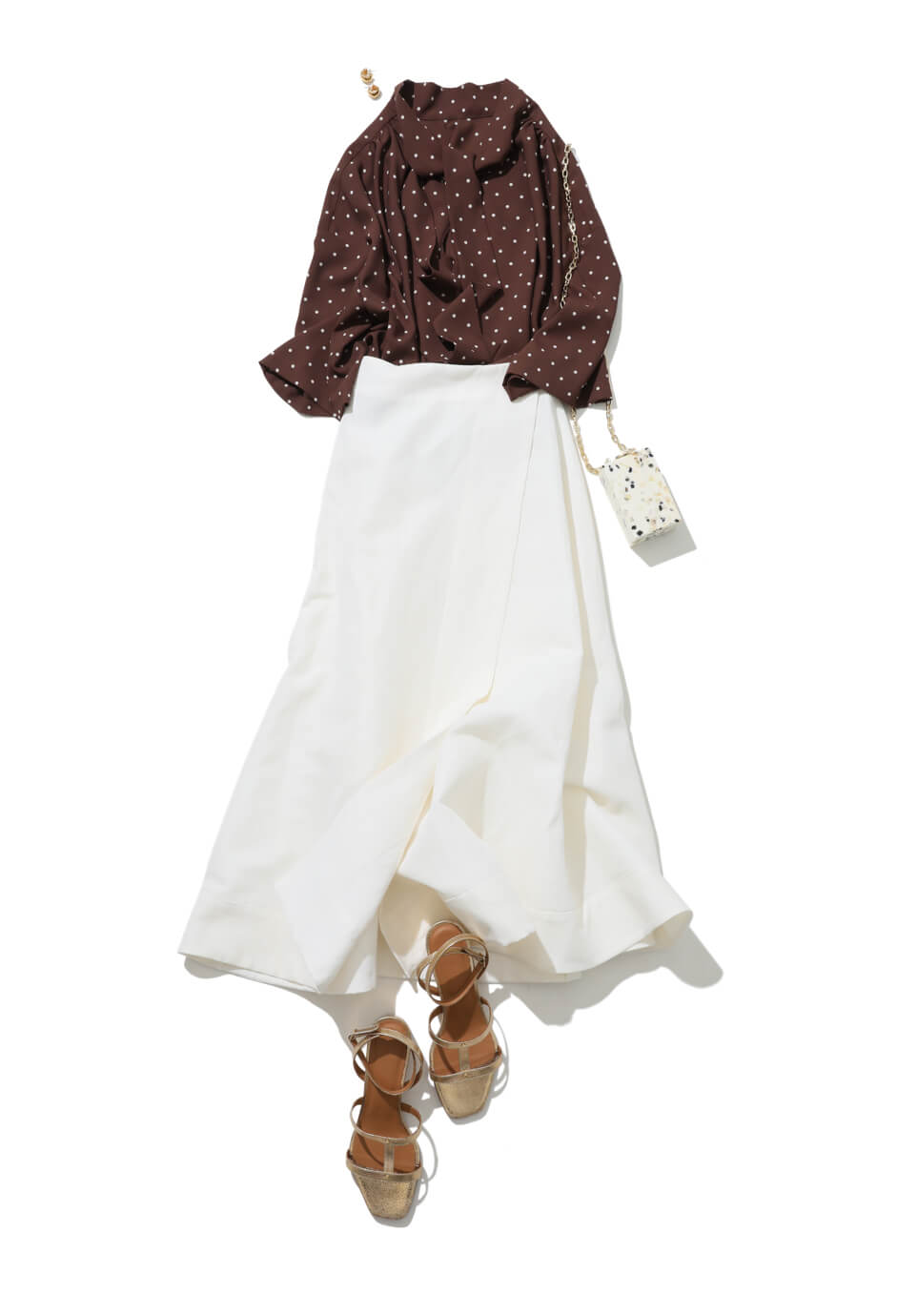 楽しい週末明けで憂鬱になりがちな月曜日は、思わず2度見されること間違いなしのロマンティックコーデで気分を上げて出勤。ふんわり揺れる爽やかな白スカートに合わせたのは、レトロムードたっぷりなドットボウタイブラウス。甘くなりすぎないよう、深めのブラウンで大人っぽく。ゴールドのサンダルがテンションを上げるスパイスに。