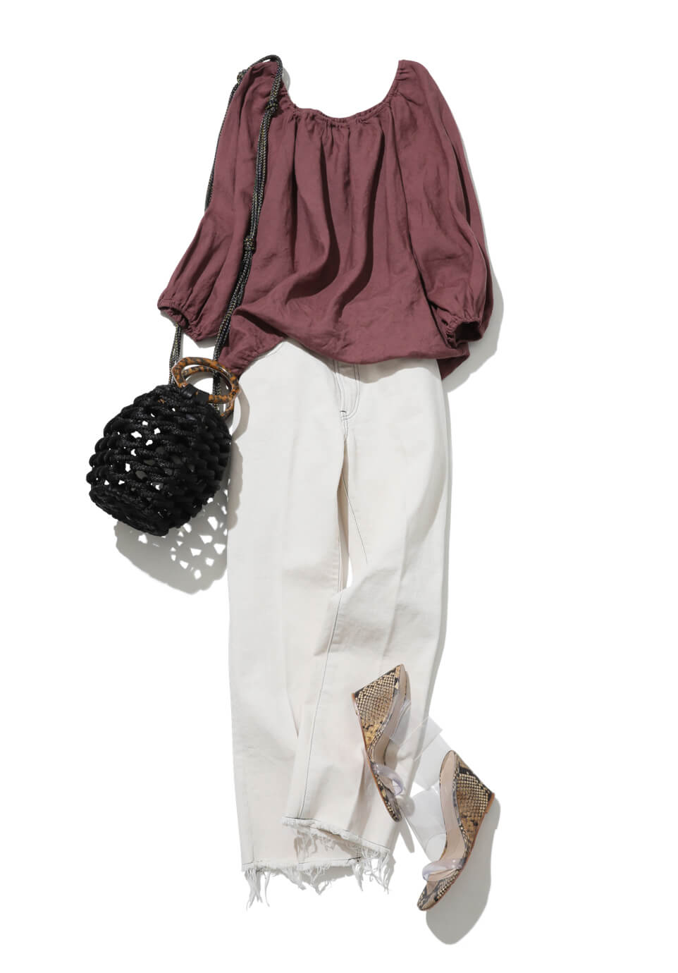 ワンウォッシュを施すことでこなれ感が増したリネンブラウスに切りっぱなしのホワイトデニムで、こなれた大人カジュアルをメイク。女性らしいギャザーたっぷりのブラウスはラフさも相まってデイリーに着まわせるアイテム。ころんとした形が愛らしいバケツ型バッグとクリアサンダルでさらにお洒落度が加速。