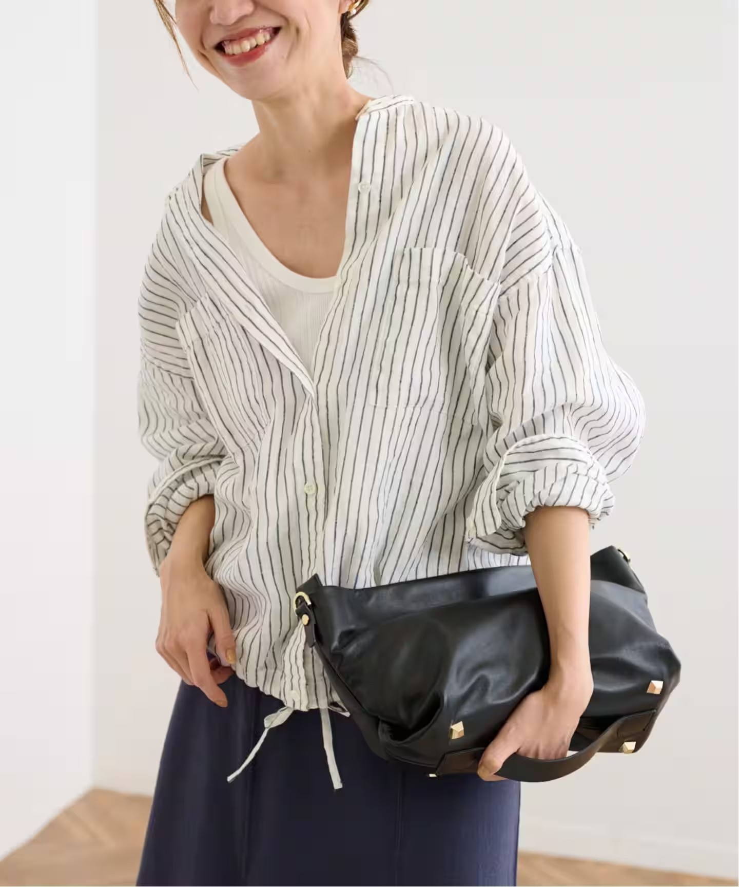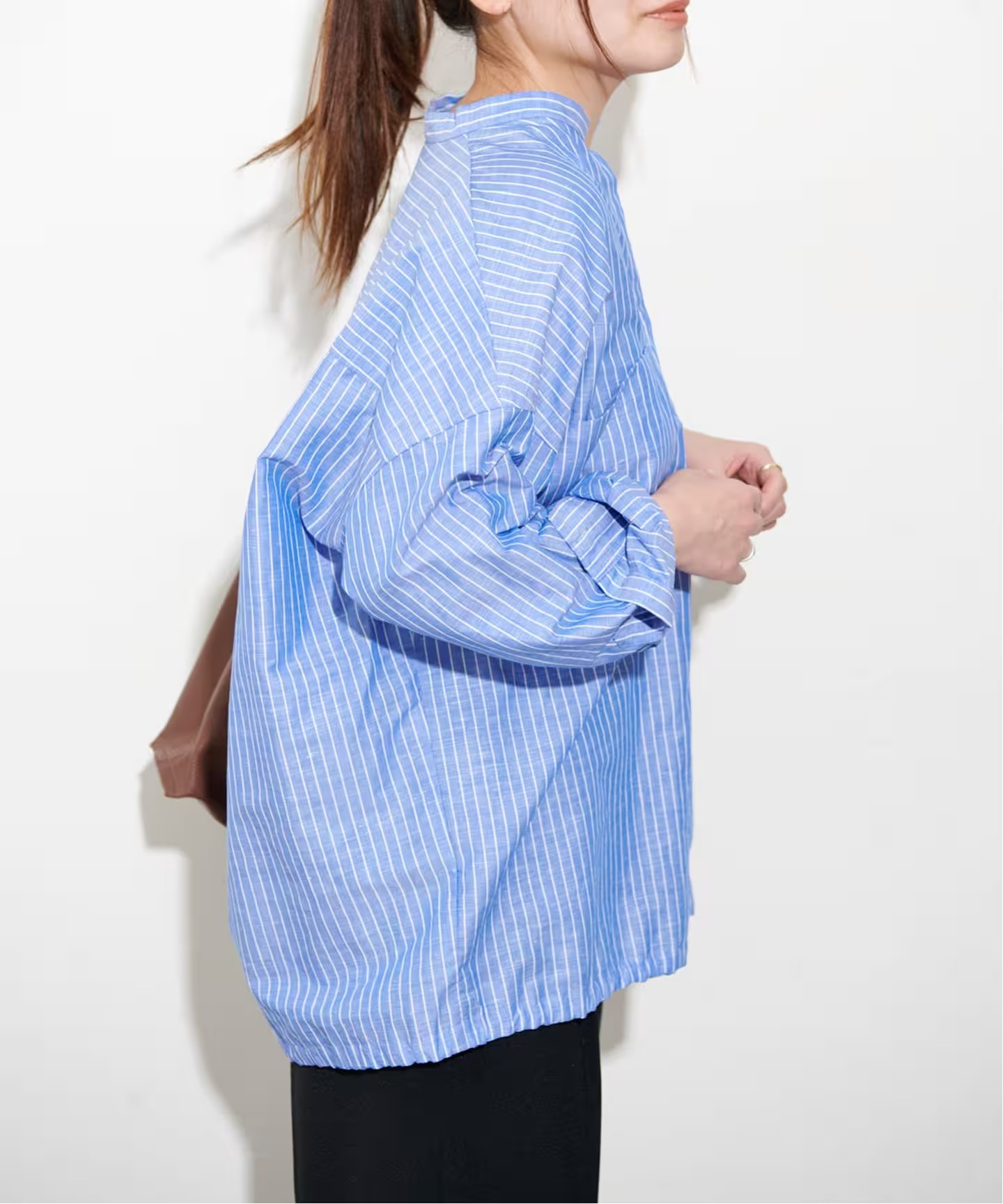 ストライプシャツで春の風を吹かせて2024年春トレンドの一つであるブルーストライプシャツ。JOURNAL STANDARDのハードマンズリネンコットンスキッパーシャツのように首元がスッキリ開いたスキッパー襟のデザインなら、一気に鮮度が上がって春らしいスタイルに。
