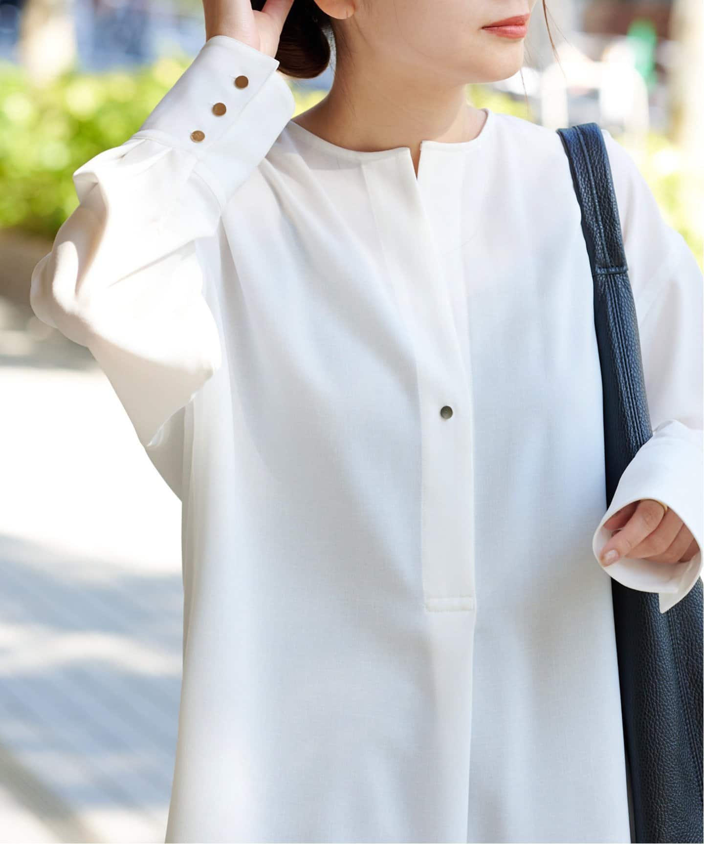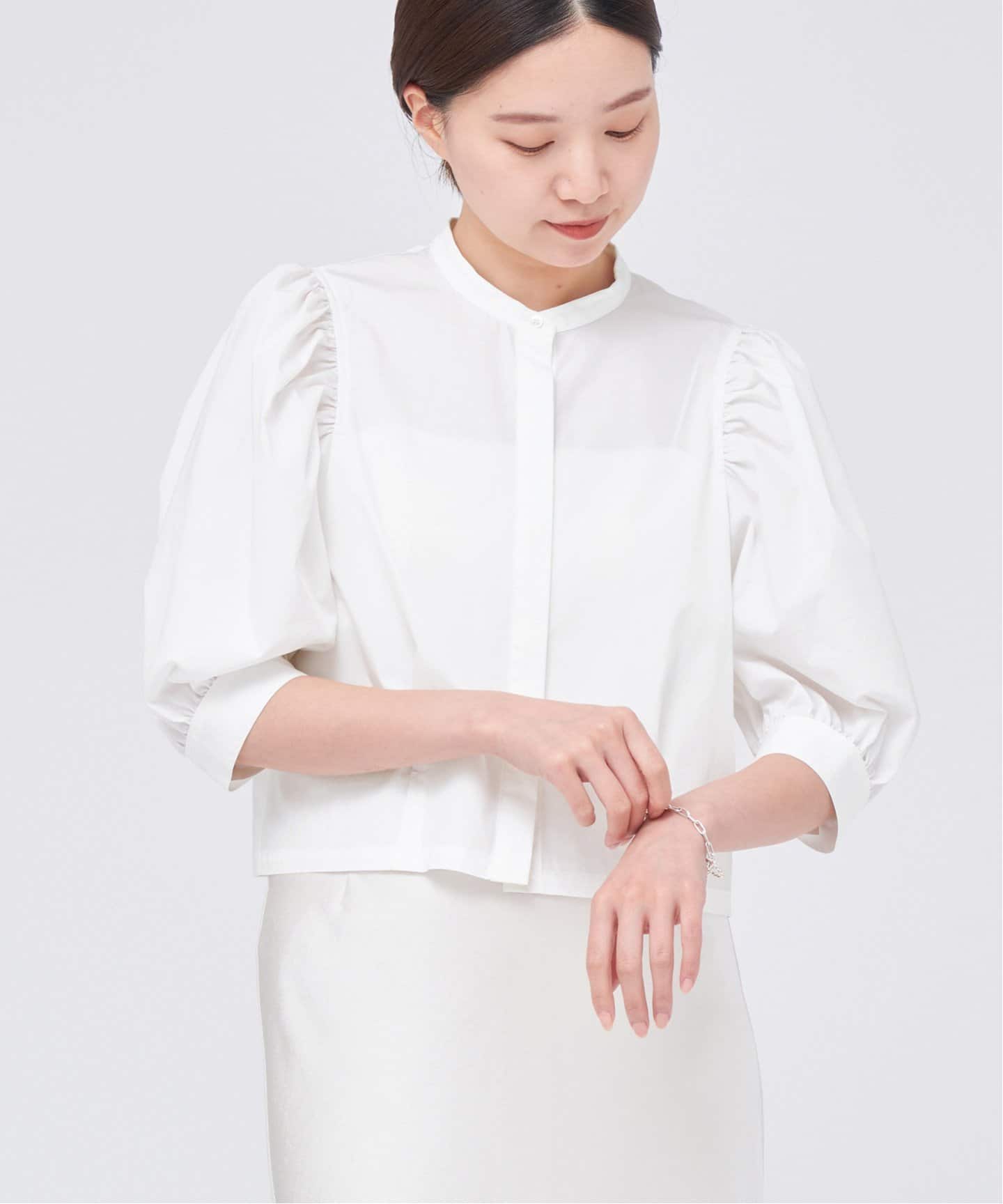 主役ブラウスパフスリーブがアイキャッチなIENAのcottonデザインショートブラウスのように、着映えるデザインのブラウスがあると便利。オンのきちんとシーンにも、オフのカジュアルシーンにも洒落見えするフェミニンなディテールがポイント。