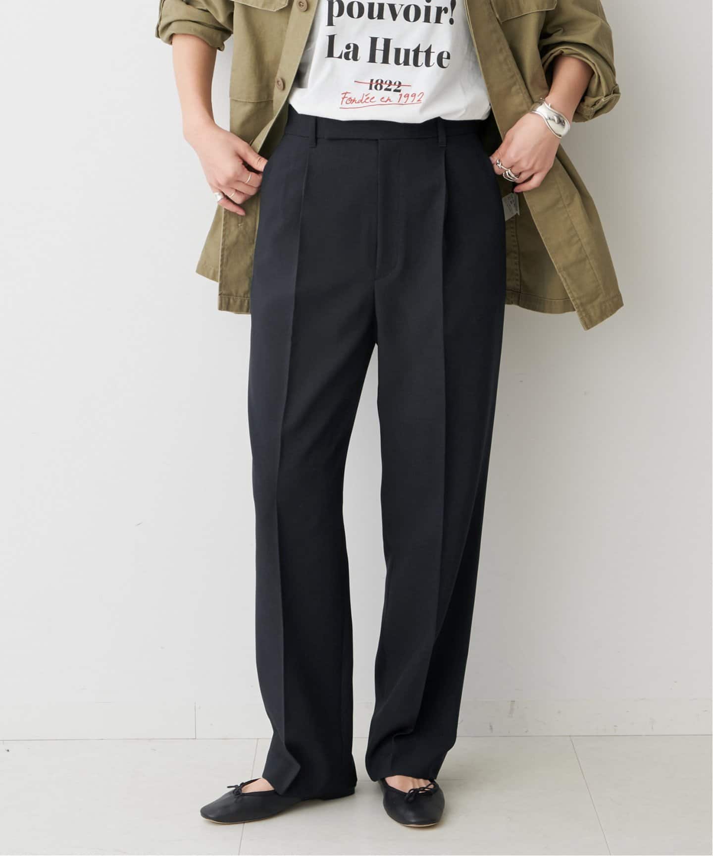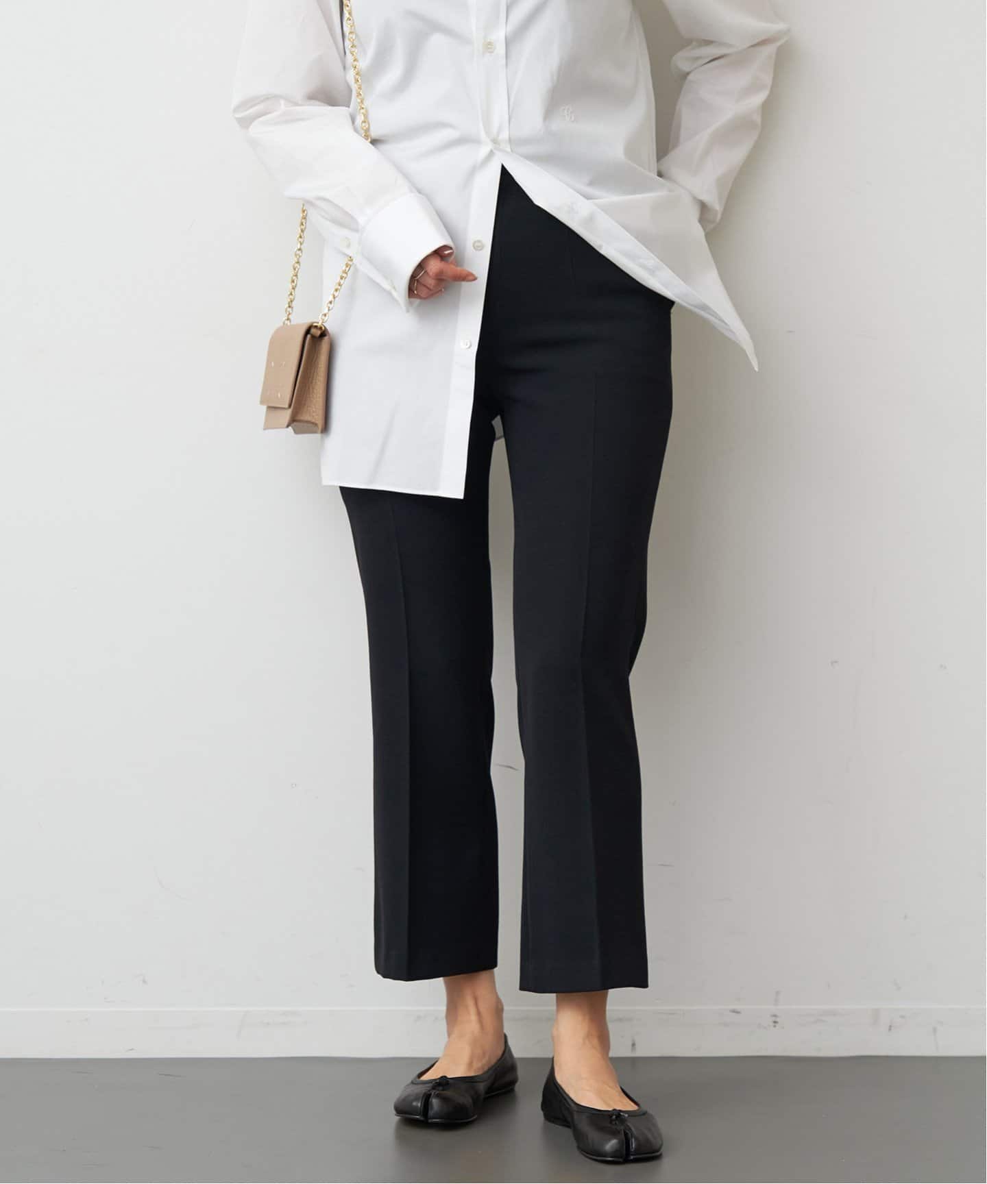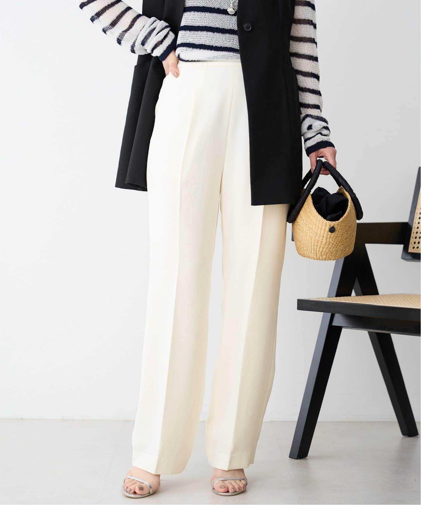 イージーパンツを頼ってシーンレスに活躍するパンツはIENAのジョーゼットイージーパンツが筆頭。落ち感のあるスッキリしたストレートシルエットがキレイ見えしつつ、履き心地は楽ちん。Deuxieme Classeのクロップドパンツで足首を見せて抜け感を出すのも手。