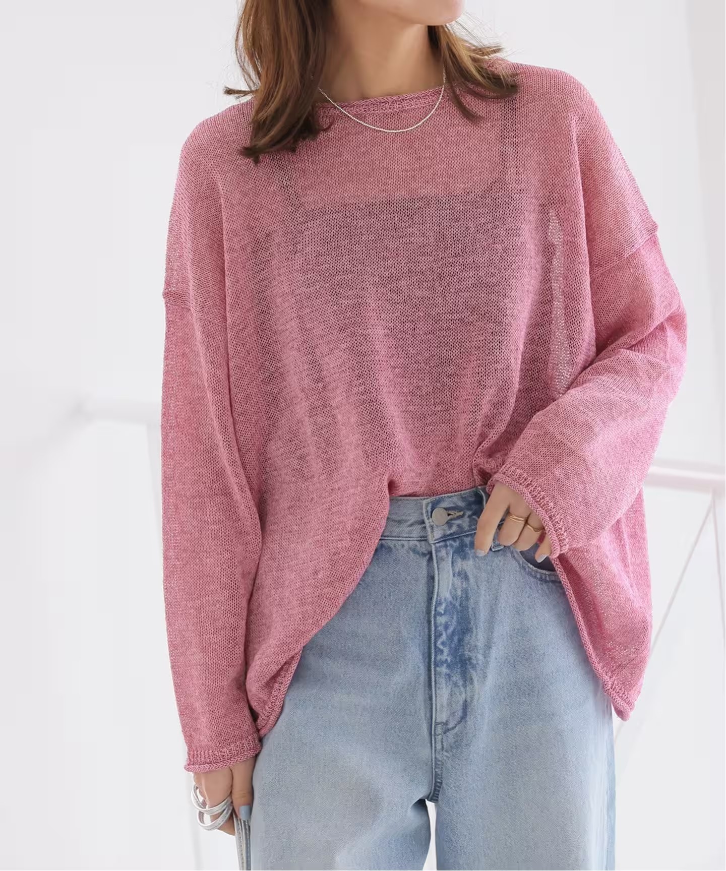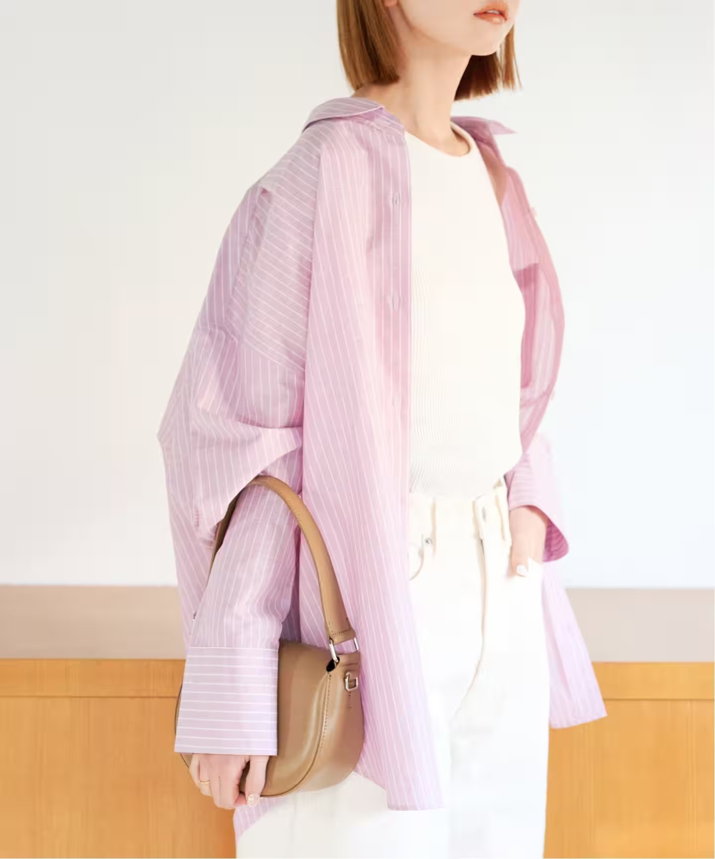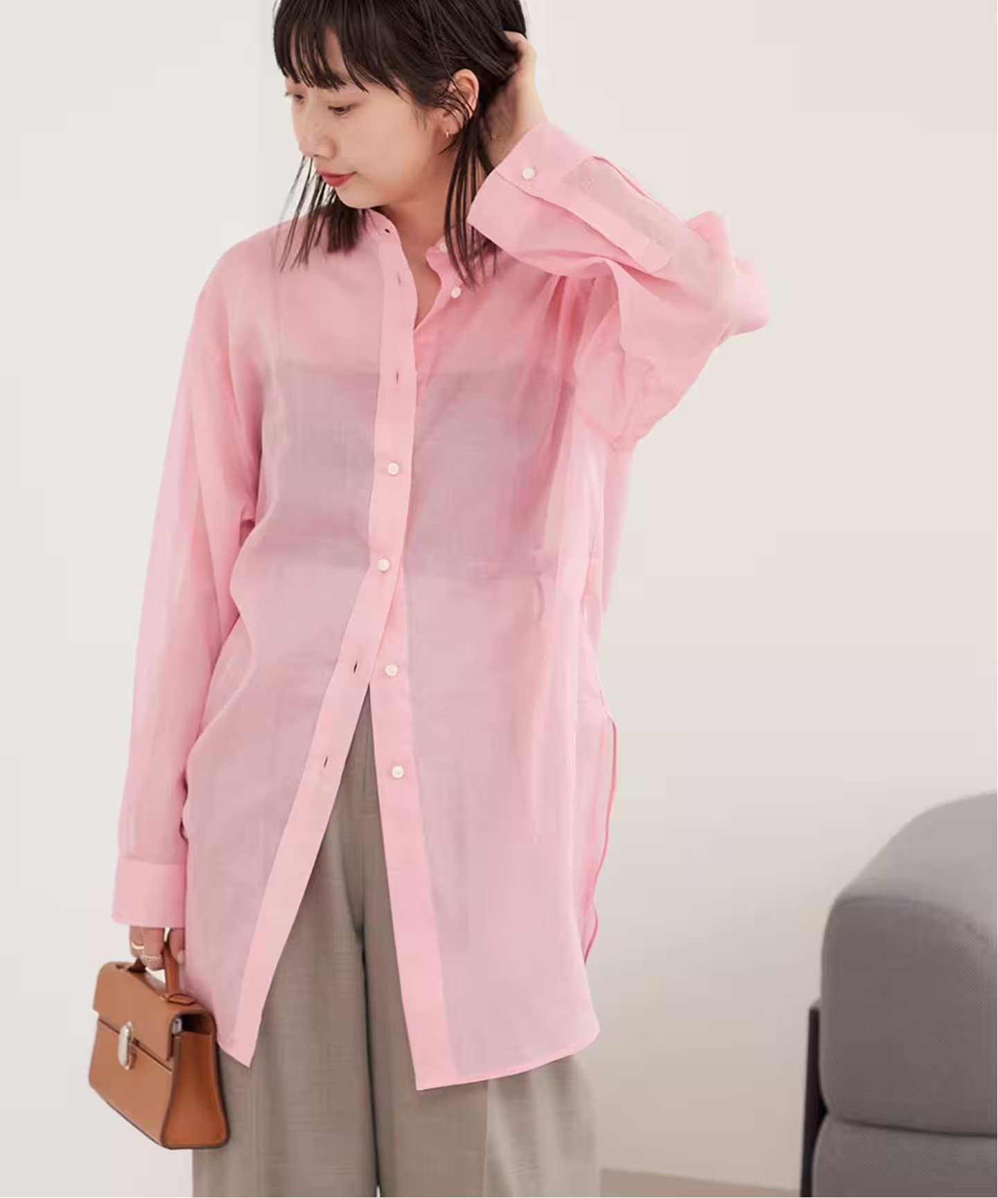 大人のフェミニンを堪能今季トレンドのシアートップスならピンクアイテムを甘すぎない繊細なニュアンスにアップデート。Plageのシアーバンドカラーシャツが好事例。relumeのPEリネンルーズプルオーバーはルーズなシルエットがこなれ感も上乗せ。