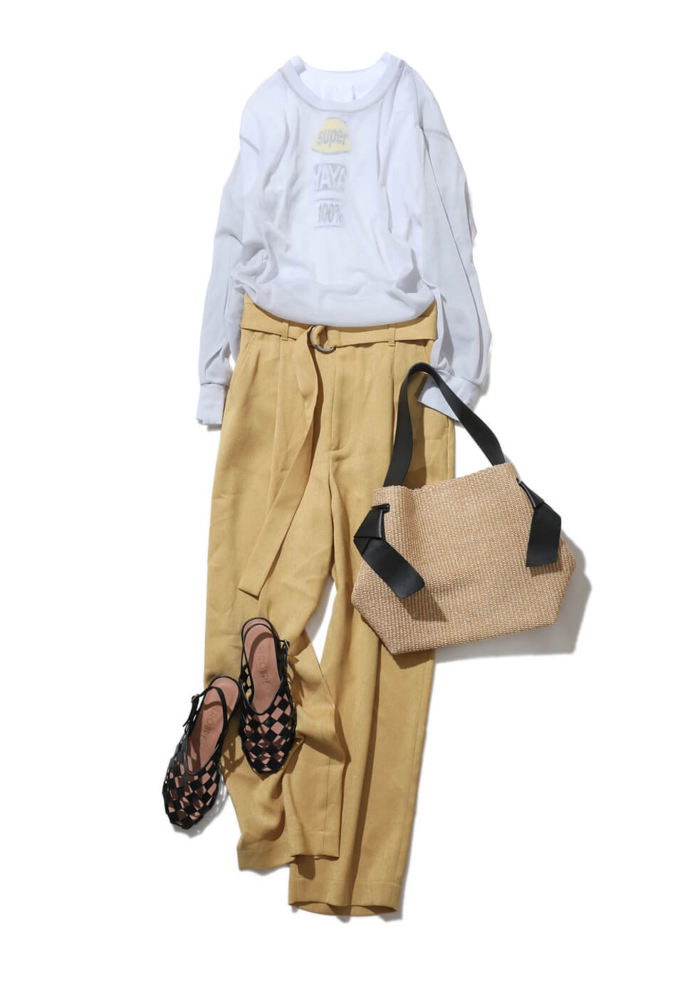 ゆったりしたシルエットとリネンのような風合いがリラクシングな雰囲気を醸すワイドパンツ。トレンドのイエローをまとってお洒落度アップ。トップスは、ロゴTを差し込んだシアートップス。ほんのり透けるインナーが頑張りすぎないお洒落を演出して、モードなパンツコーデが完成。