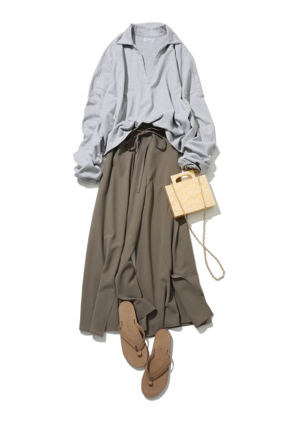 トップスは、ボリュームたっぷりのメンズライクなスキッパーシャツ。体が泳ぐくらいのゆるさが、逆に華奢なラインを際立たせて◎。フロントだけボトムスにインして、袖はあえてくしゅくしゅとラフにまくるくらいがこなれ感アップのポイントに。対してボトムスはキレイめなラップパンツ。仕上げにレジンバッグのアクセントをプラス。