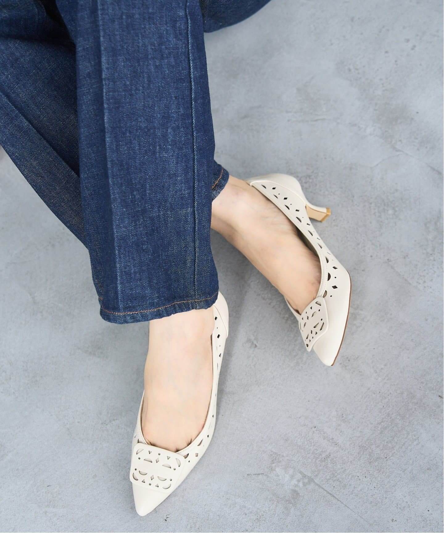 最旬パンプス今年らしいパンプスはLE TALONの4.5cmポインテッドネットパンプスや、パンチングで柄を描いた5.5cmカットワークオーナメントパンプス。ソックス合わせで雰囲気が変わる、ニュアンスのあるデザインが魅力。