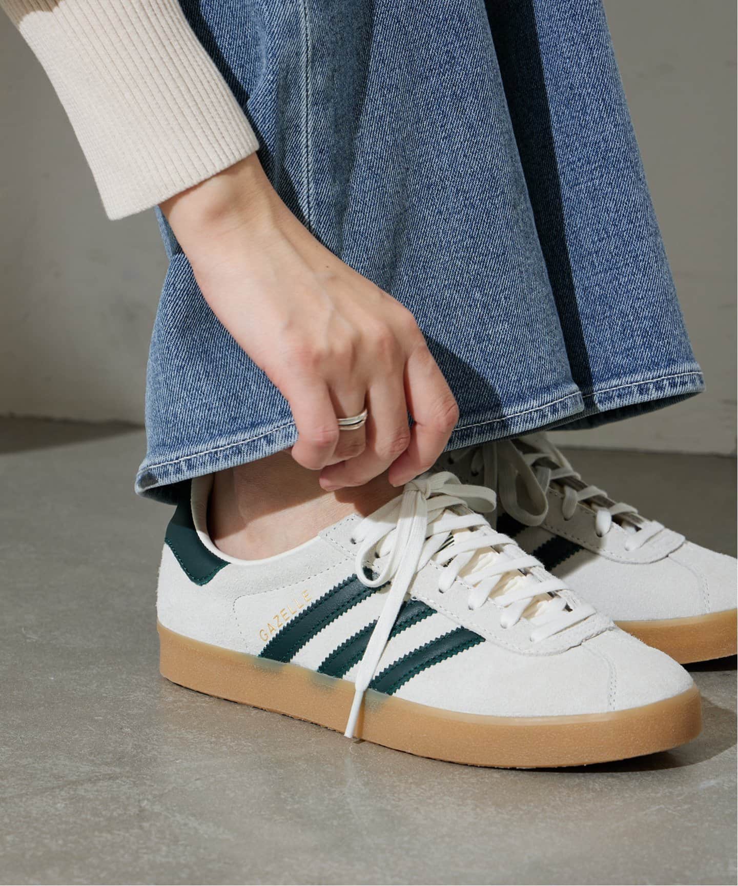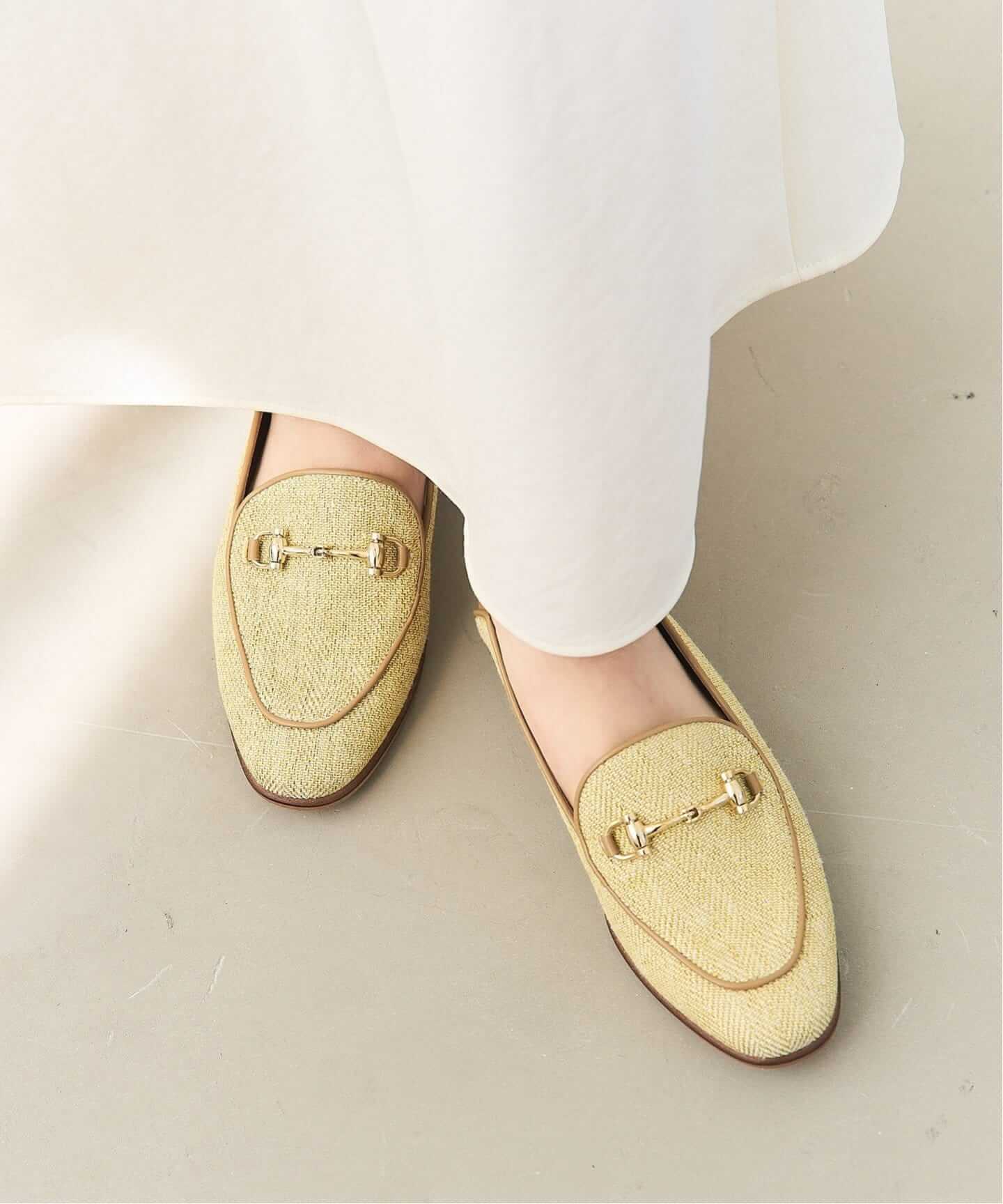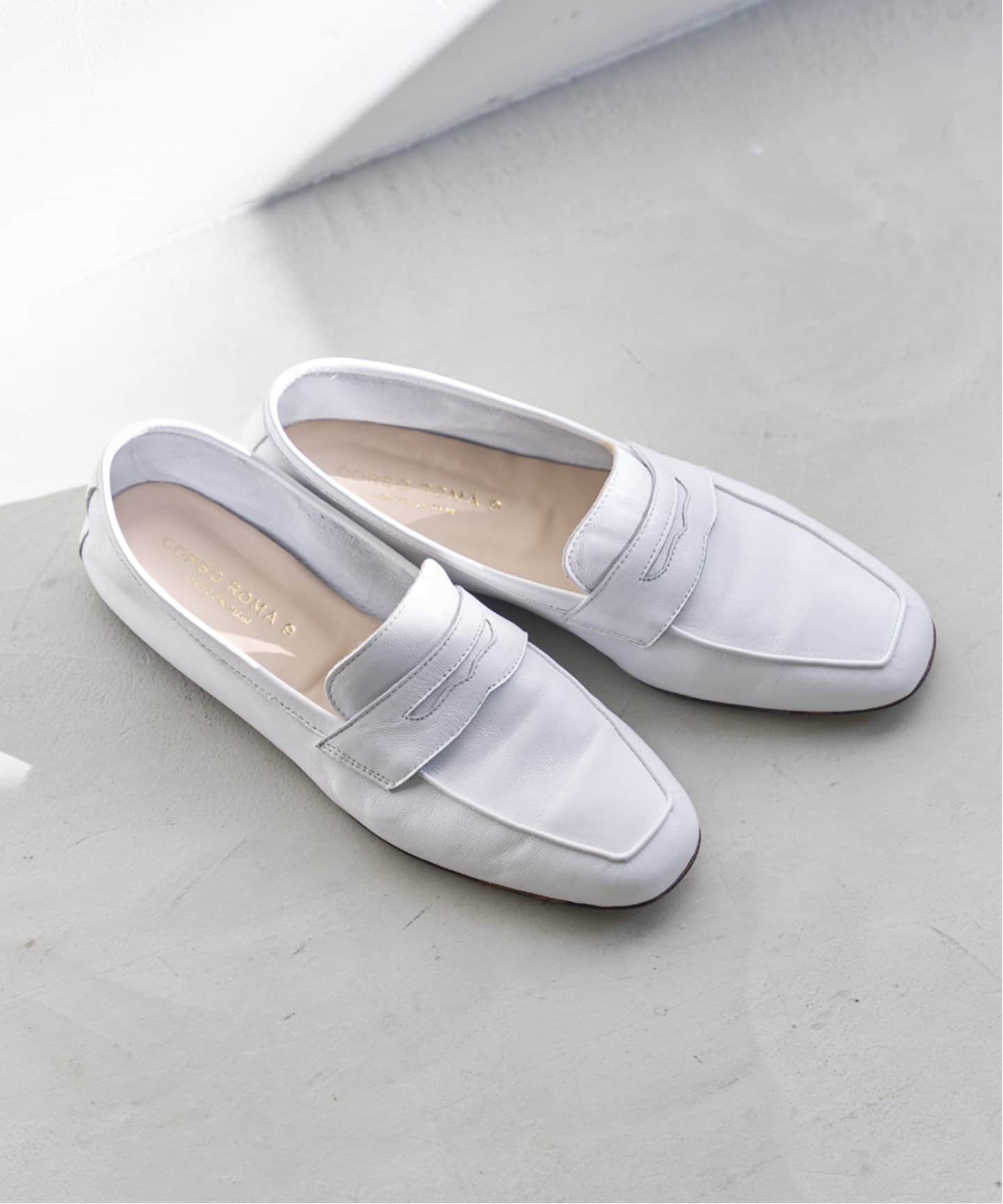 足元から軽やかに素足に履きたいLETALONハイショクビットバブーシュ。バブーシュのようにかかとを踏んでも履くことができて、新緑のように瑞々しいグリーンのカラーもグッド。CORSO ROMA 9のホワイトローファーも春らしい。