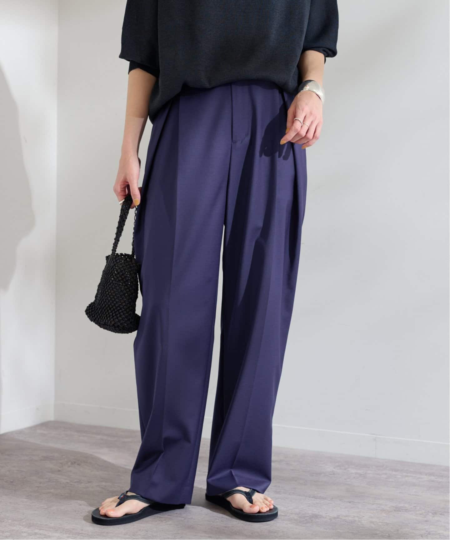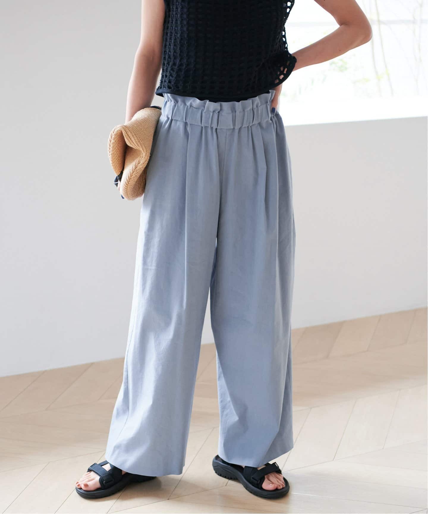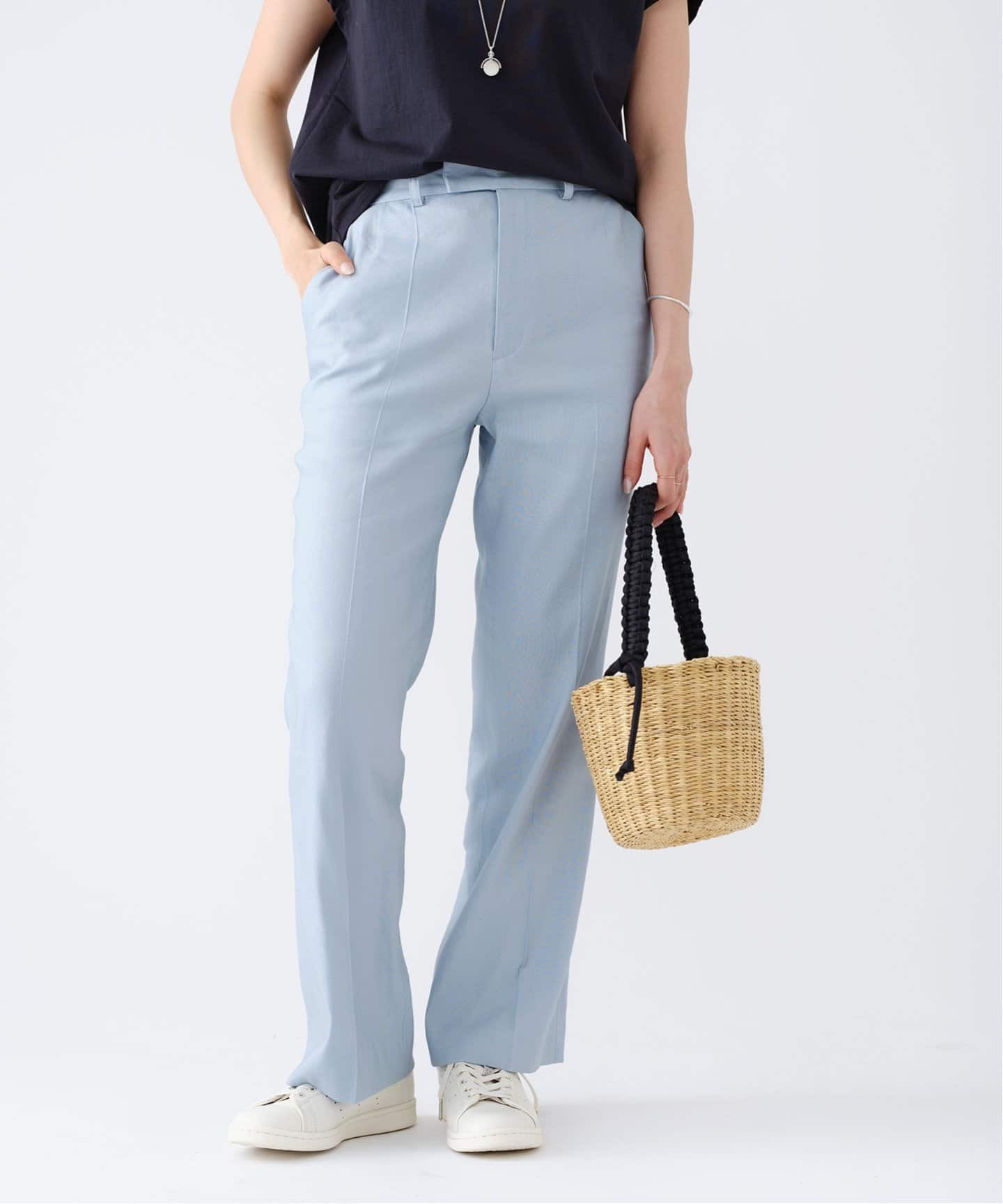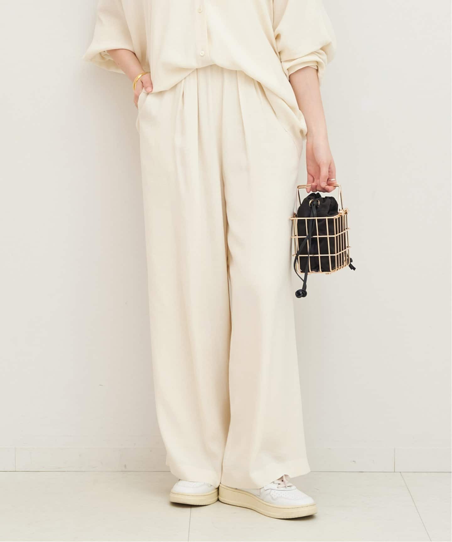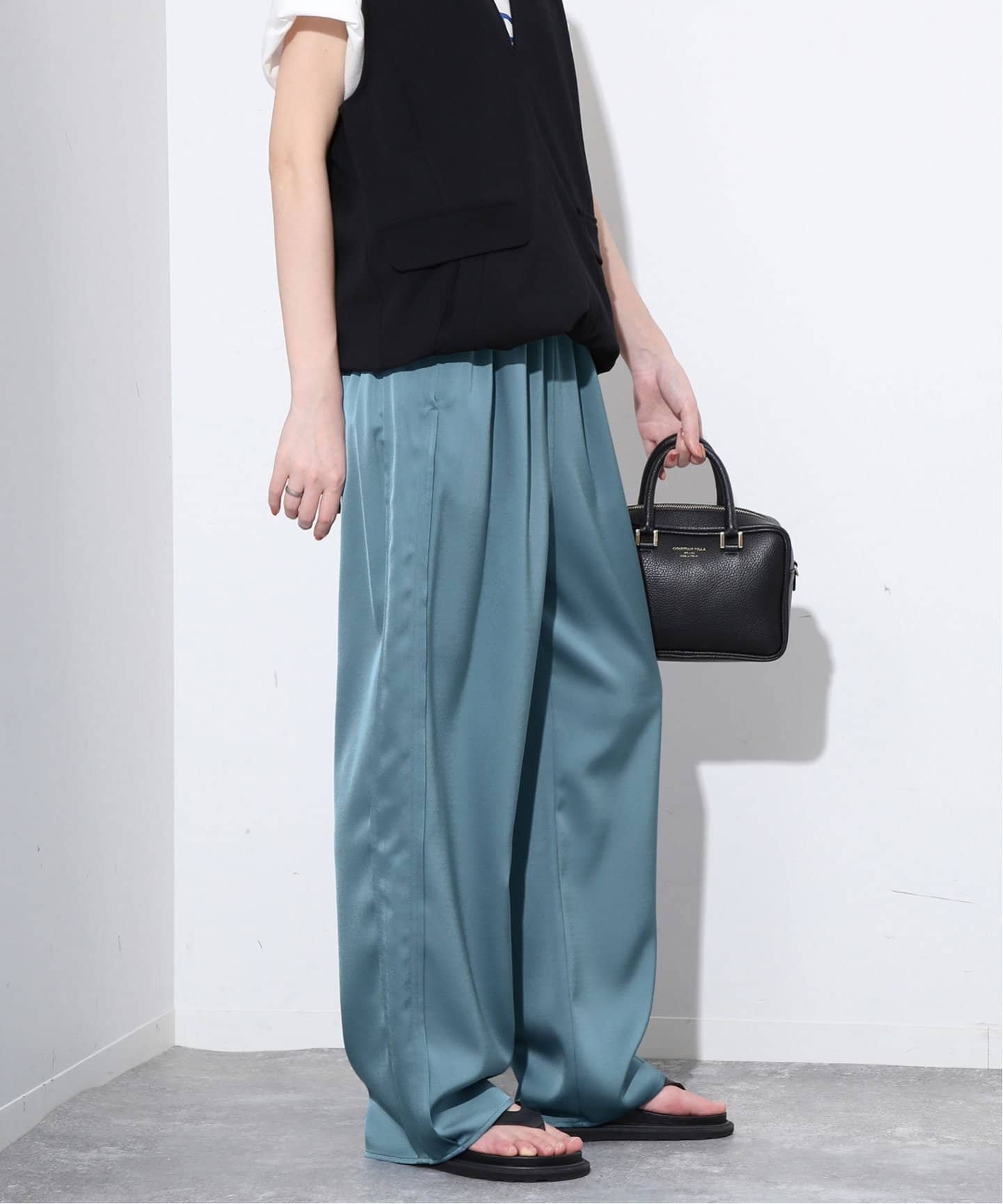 パンツコーデの感度高まるあえてサックスブルーとブルーの“中間色”や、グレーが混じった“くすみ色”を狙えば、まわりと差がついてお洒落感度が急上昇。SLOBE IENAのヘビーサテンイージーパンツは光沢素材ならではの上品さも兼備。