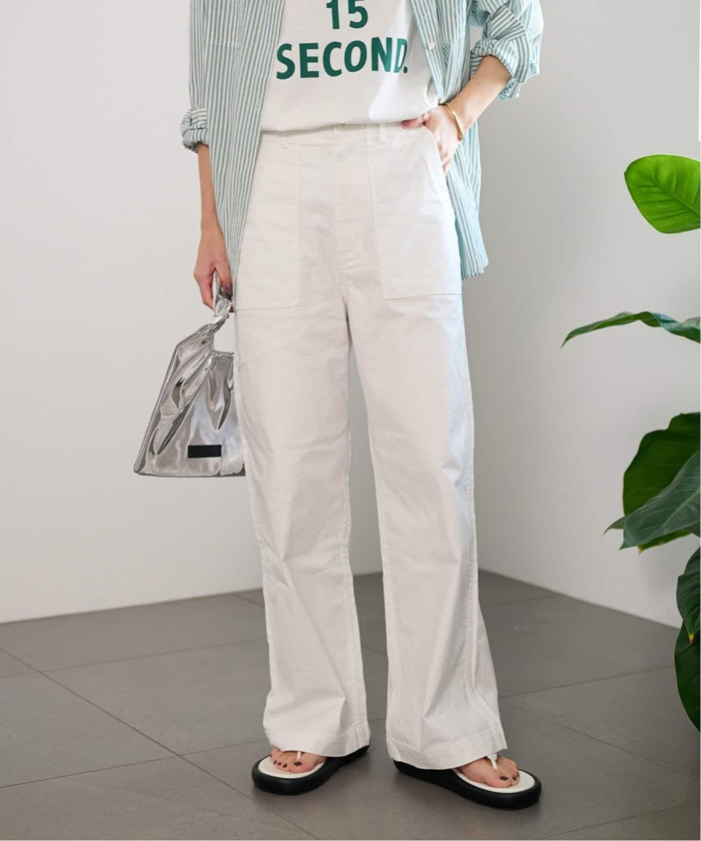 ホワイトを頼ってこの春も人気のミリタリー&ワークパンツ。relumeのベストセラーパンツであるワイドベイカーパンツは、野暮ったく見えずスッキリと大人っぽくキマる美脚シルエットが人気。クリーンなホワイトなら、さらに好印象に。