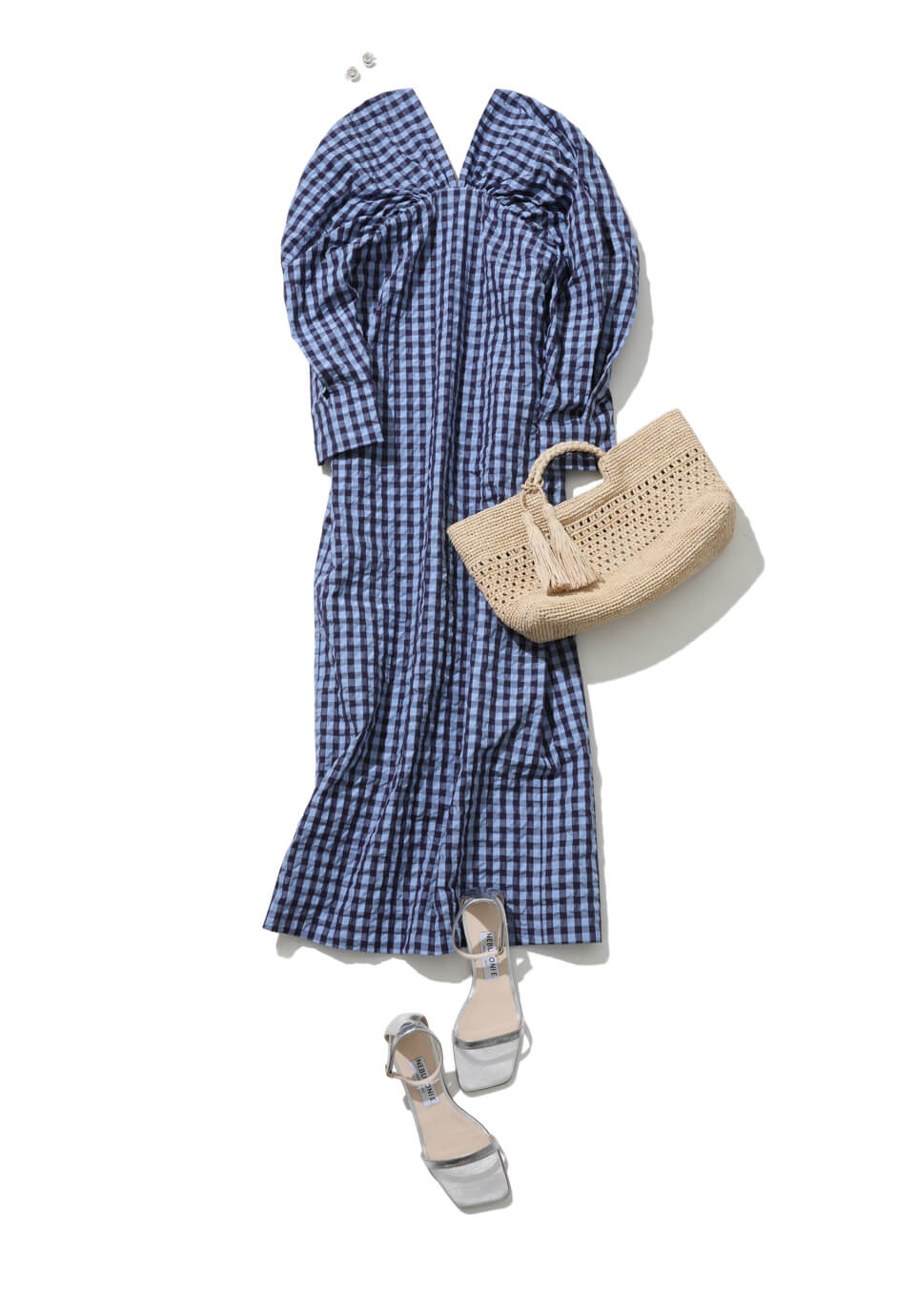 テレワークにも慣れてきた今日この頃。オンラインのミーティングでは、デコルテまわりがパッと映える色柄アイテムが必須。気持ちもアガるドラマティックなチェックワンピースが月曜日にぴったり。涼感漂うブルーと大人なVネックが甘さを押さえてクールダウン。お気に入りのラフィアバッグとも好相性。