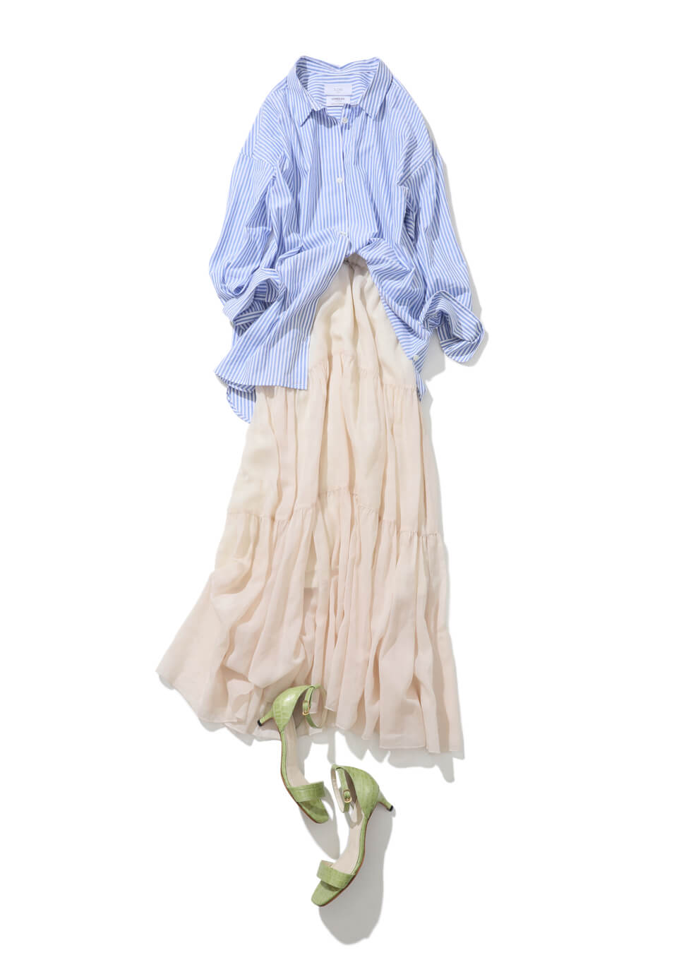 体をすっぽり包むビッグシルエットが今っぽいシャツで、ゆったりと。家でも気持ちをオンにするために、あえてデニムやカジュアルパンツではなくフェミニンなティアードスカートを合わせて、スイッチを切り替えて。ふんわり揺れる女っぽいマキシ丈が、ストライプシャツの鮮度を高めてくれそう。