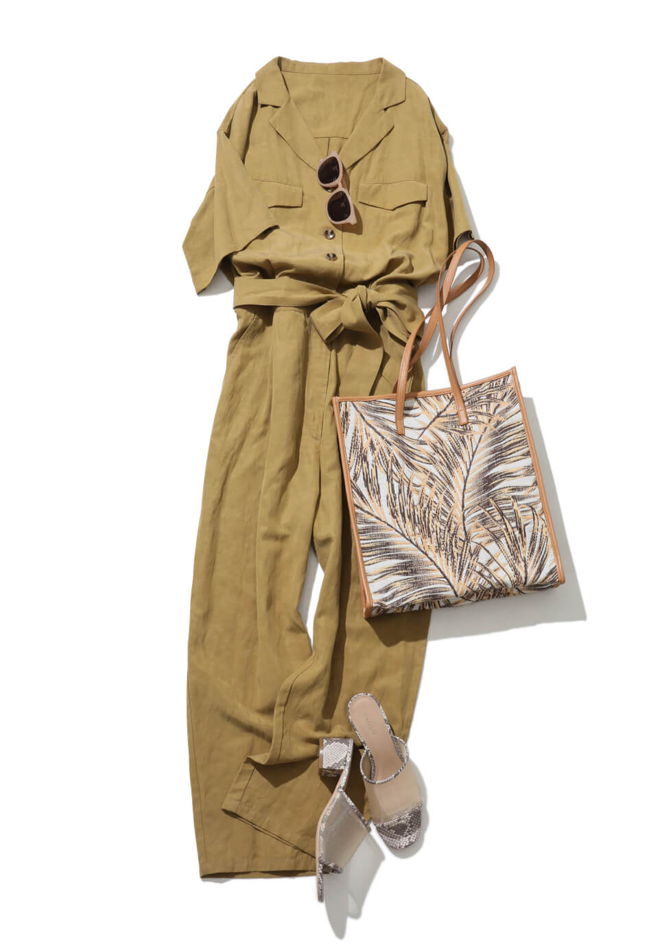 1枚でコーデが決まる楽アイテムはワンピースだけにあらず。こなれたムードに仕上がる大人なオールインワンがじわじわと人気を呼んでいます。大きめポケットがアクセントの襟付きオールインワンは、ウエストのリボンで女っぽディテールも。リーフ柄バッグやサングラスで都会的なサファリテイストにまとめて。