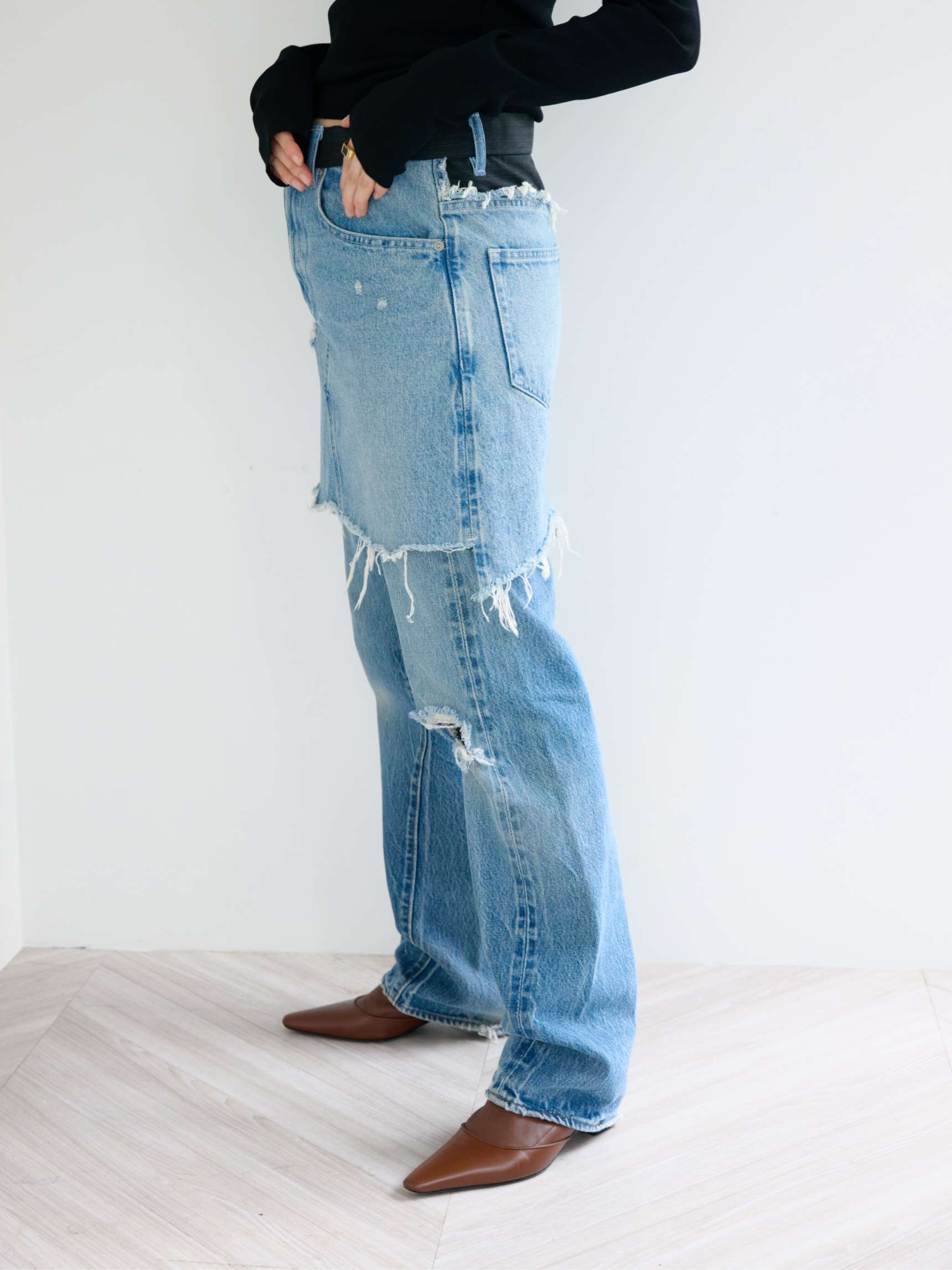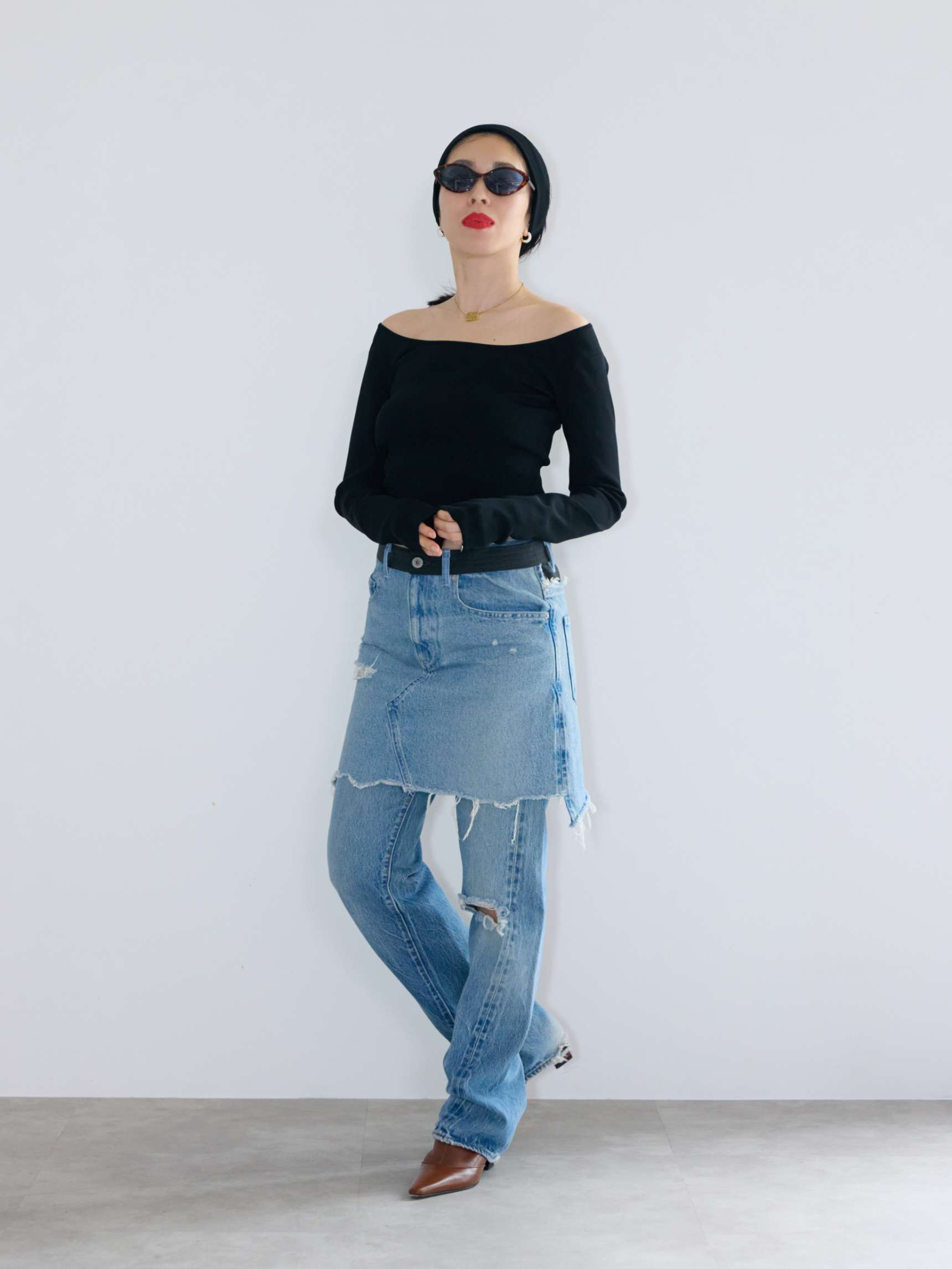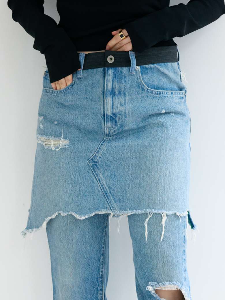 デニムパンツとスラックスパンツをリメイクして仕上げるようなイメージで作られたスカート。ランダムにカットオフされた裾やダメージ加工を施すことで、ヴィンテージの雰囲気を強調。デニム素材どうしのアイテムで合わせても変化が出る様に仕上げました。パンツとレイヤードしても、単品で着用しても様になるように計算されたサイズ感。直線的なパターンでメンズライクに仕上げました。環境にも配慮し染め上げられた糸を使用したデニム生地を使用。
