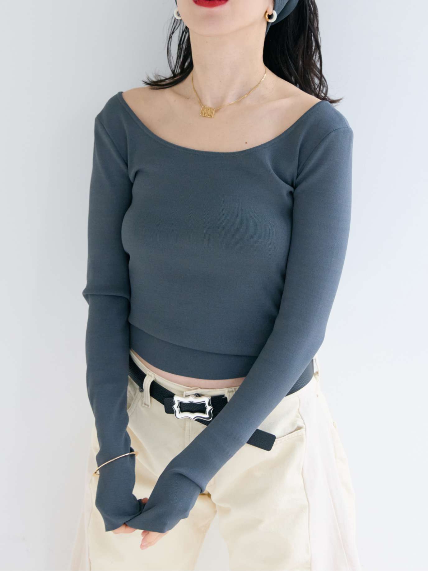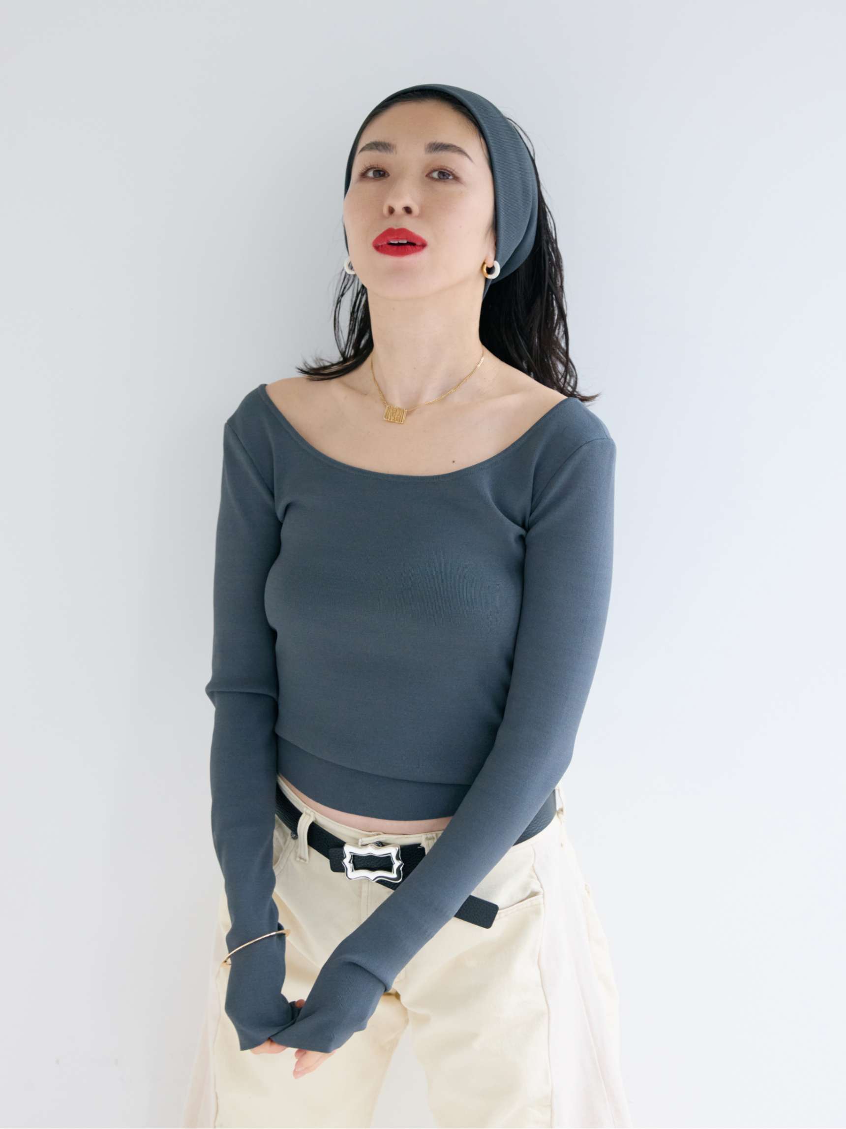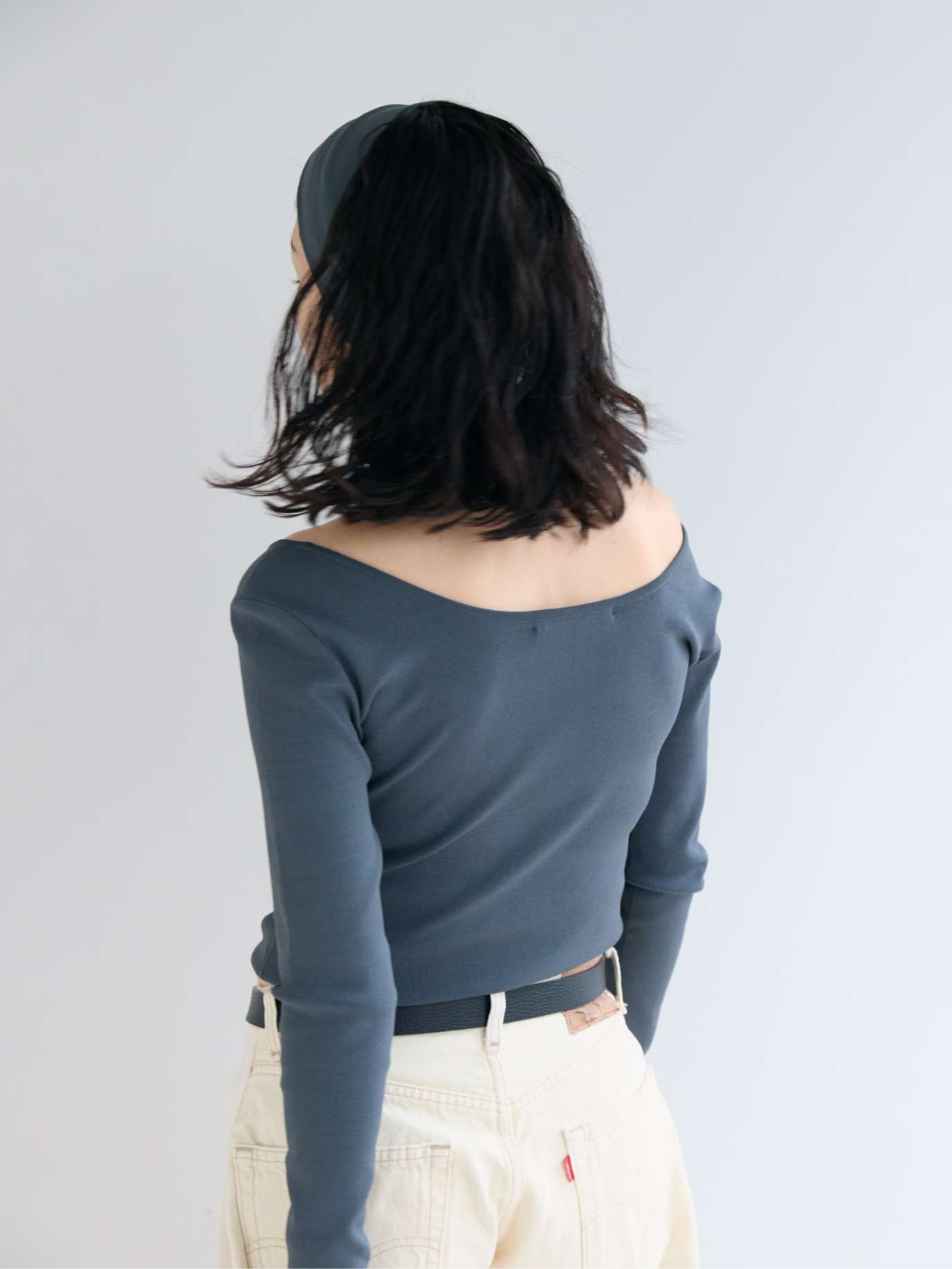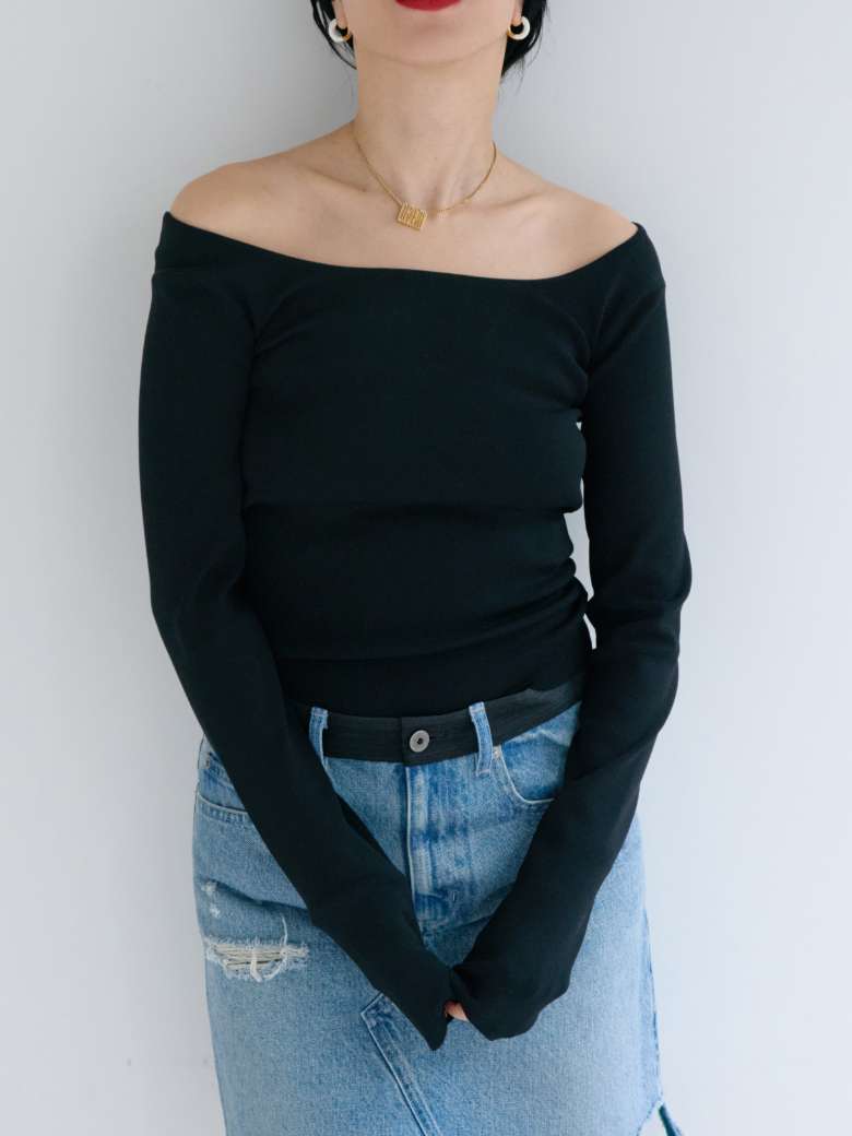 ストレッチヤーンの生地を使用した、ニットとカットソーの中間の様な軽やかな着心地のトップス。フラットな編地ながら、独特の風合いを持ち、より一層深く美しい、モードでクリーンな印象のブラックカラーに仕上がりました。大胆なデコルテのカッティングとぴったりと体に沿う美しいラインが女性らしさを強調。襟ぐりの開き具合や、長めの袖でニュアンスをつければ、デニムパンツと合わせてもレディな印象で着こなせます。