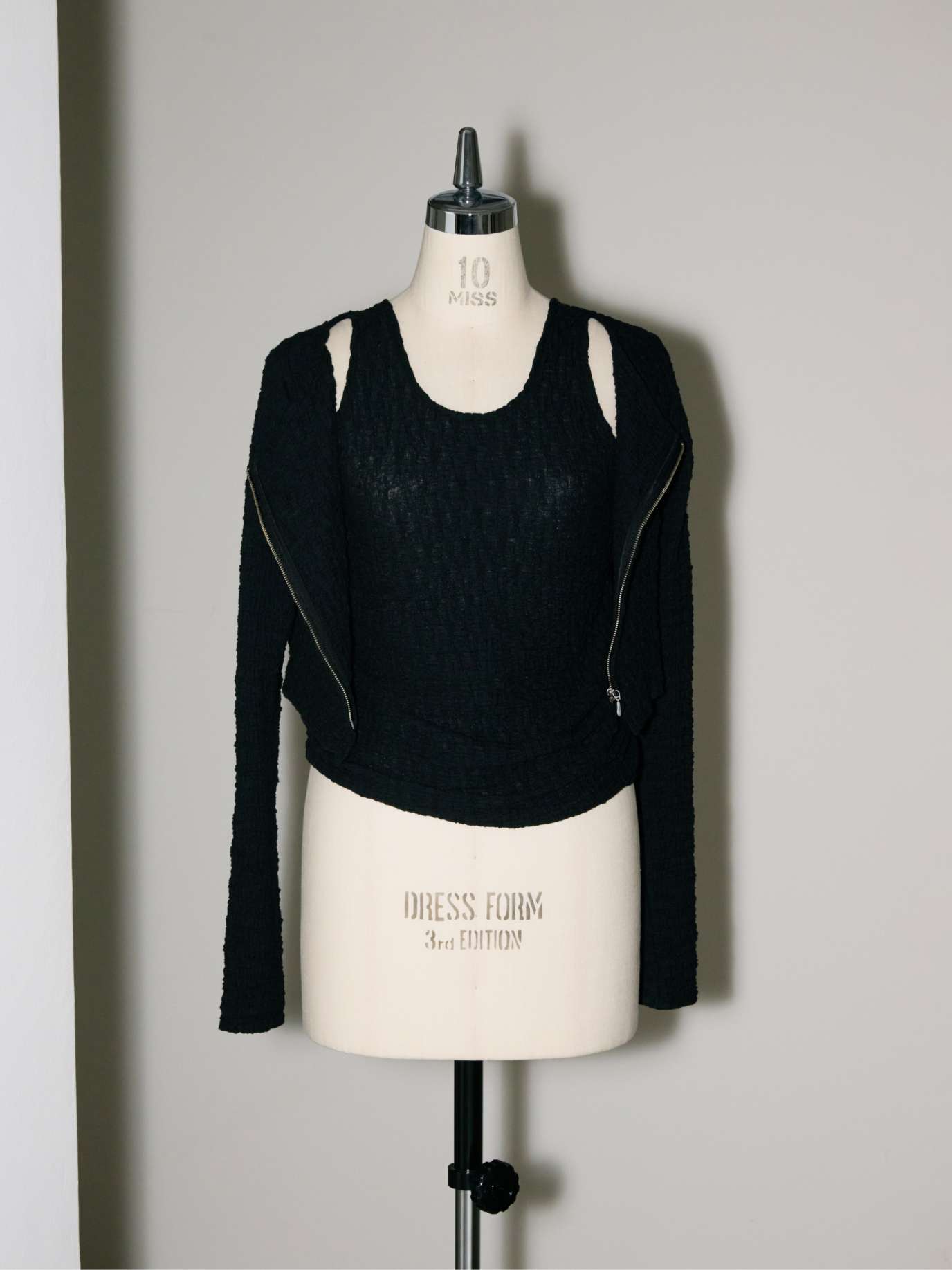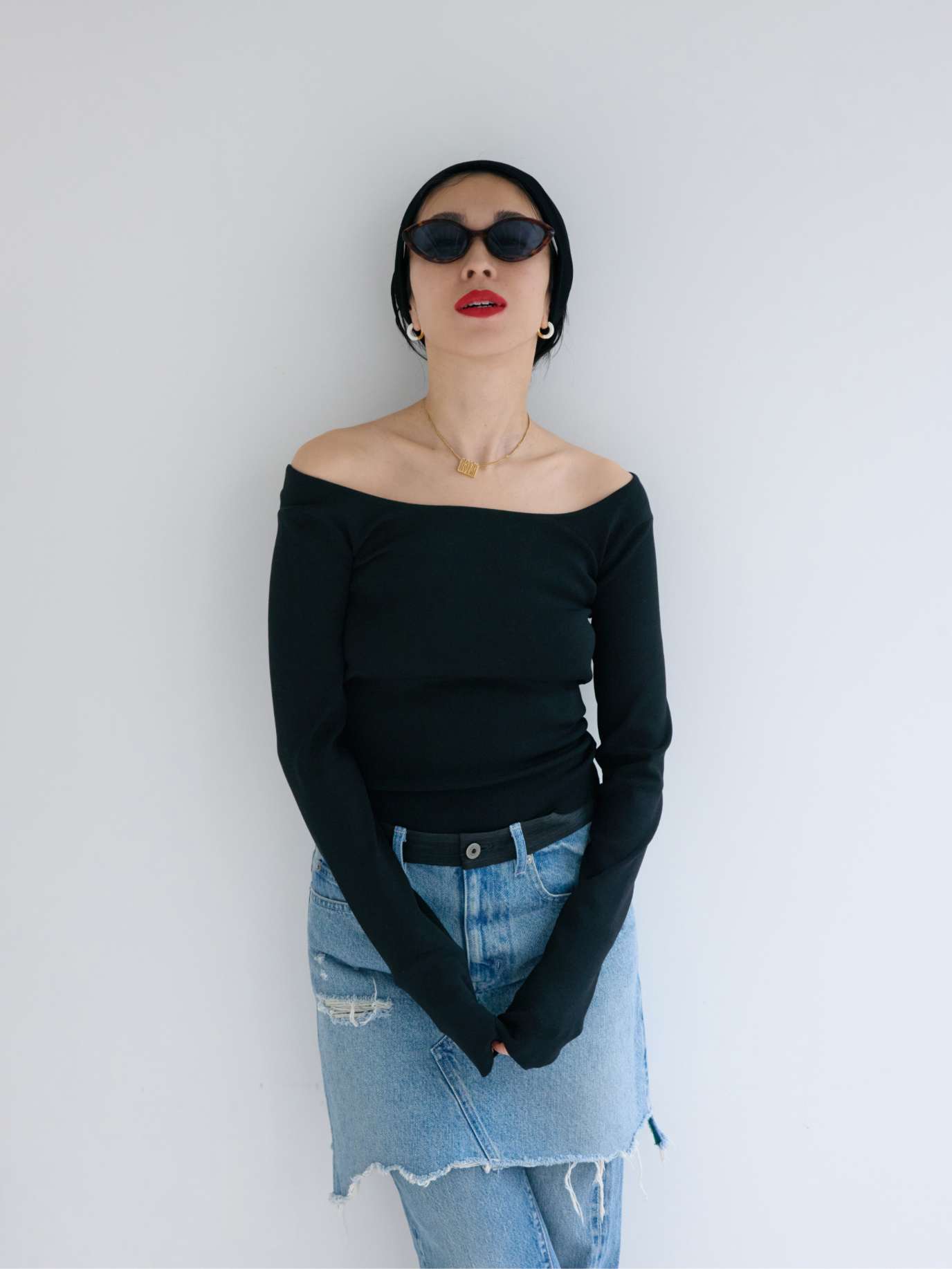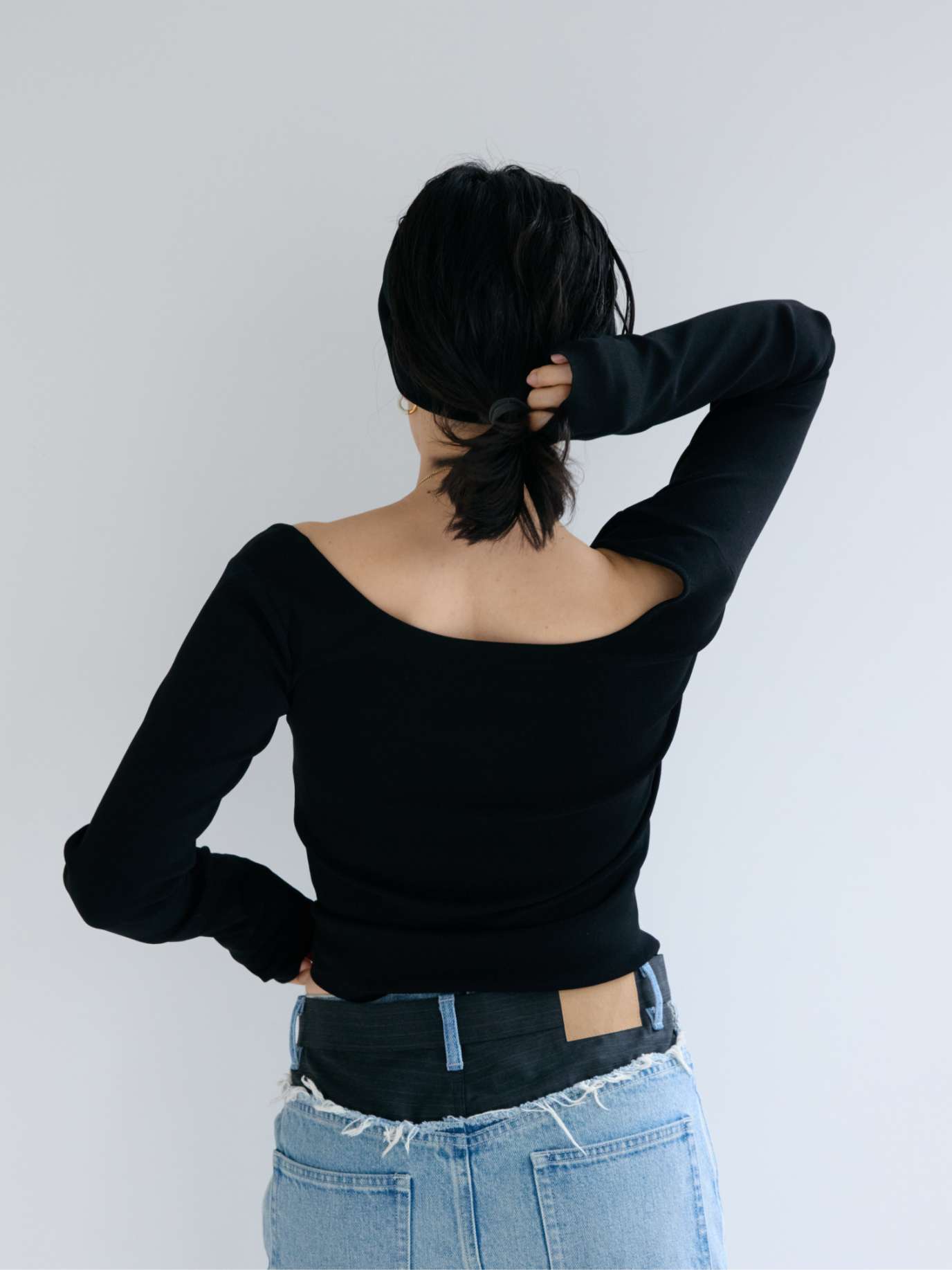 ストレッチヤーンの生地を使用した、ニットとカットソーの中間の様な軽やかな着心地のトップス。フラットな編地ながら、独特の風合いを持ち、より一層深く美しい、モードでクリーンな印象のブラックカラーに仕上がりました。大胆なデコルテのカッティングとぴったりと体に沿う美しいラインが女性らしさを強調。襟ぐりの開き具合や、長めの袖でニュアンスをつければ、デニムパンツと合わせてもレディな印象で着こなせます。