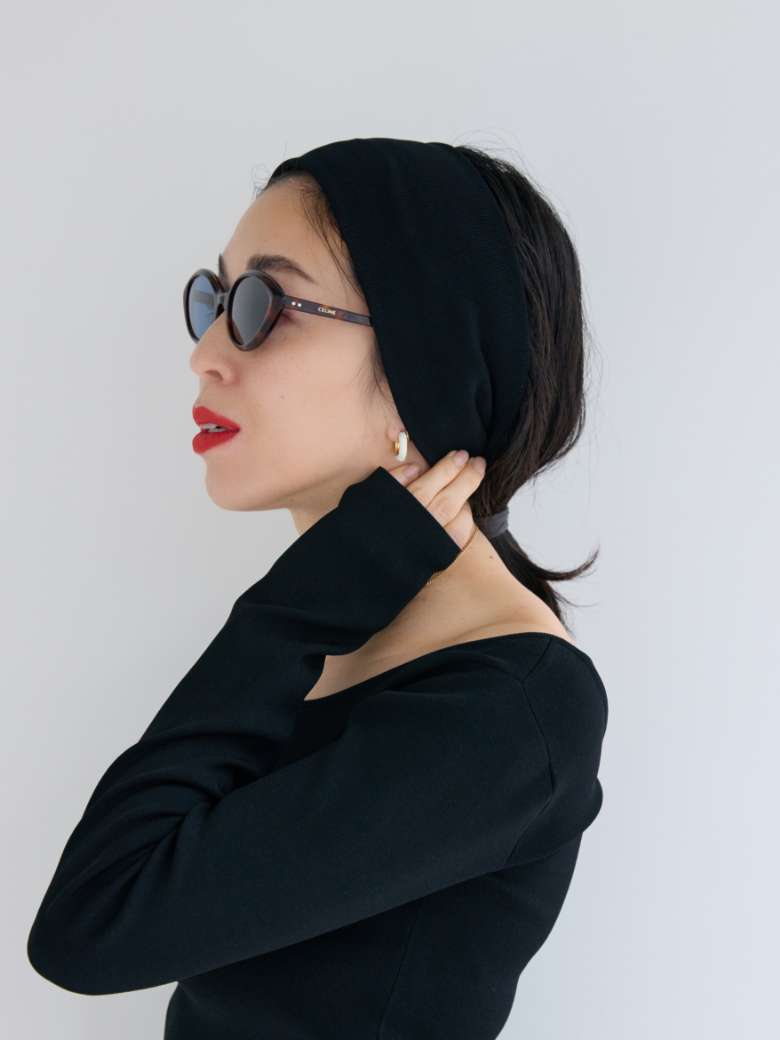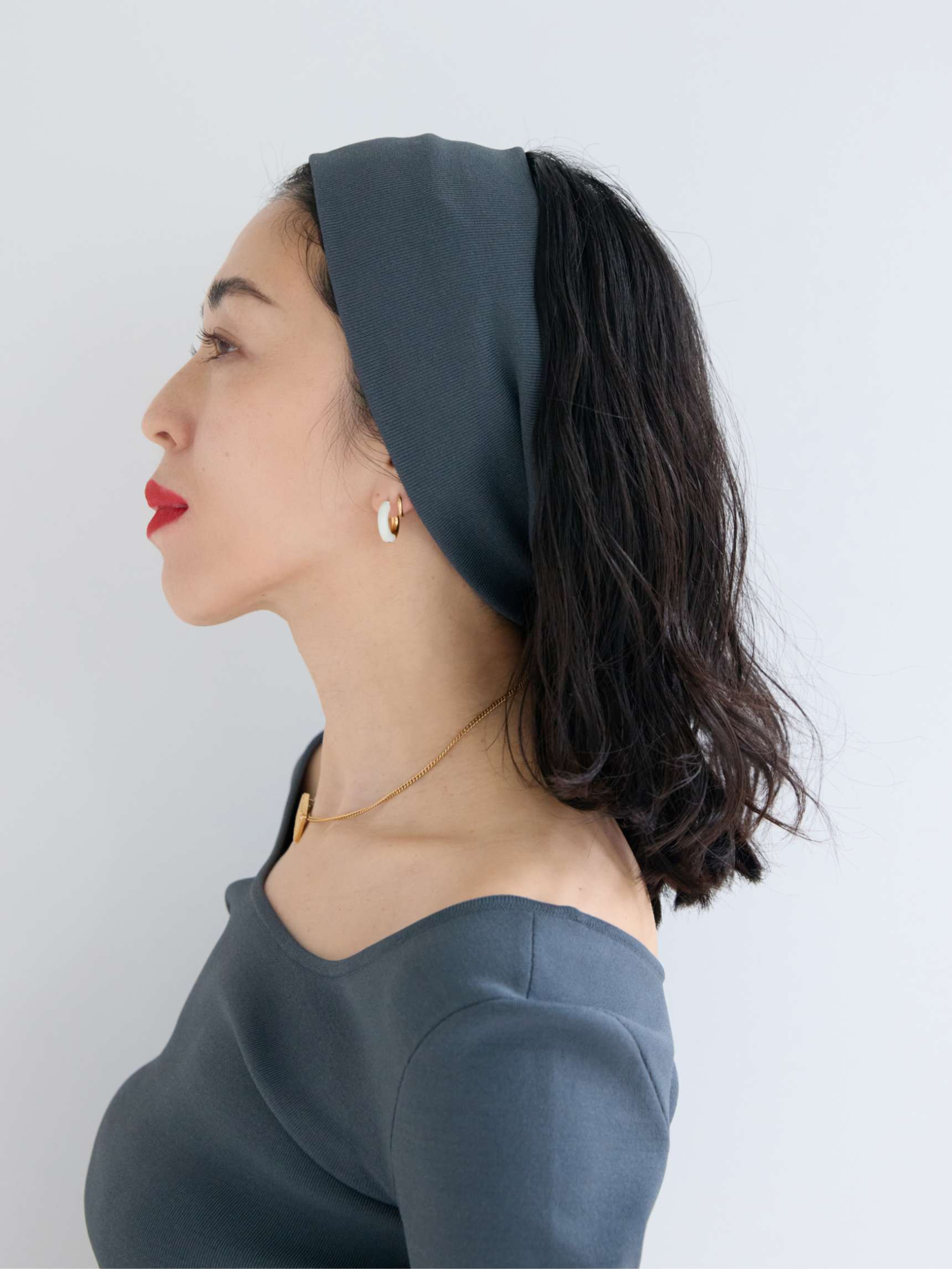デコルテトップスと同素材のストレッチヤーンの生地を使用したヘアバンド。フラットな編地ながら、独特の風合いを持ち、より一層深く美しい、モードでクリーンな印象のブラックカラーに仕上がりました。ハイゲージの美しい素材は程よくカジュアル感を残しながら、ラグジュアリーなニュアンスも感じさせてくれます。しっかりとしたストレッチと適度なホールド感で、顔周りを美しく見せてくれます。