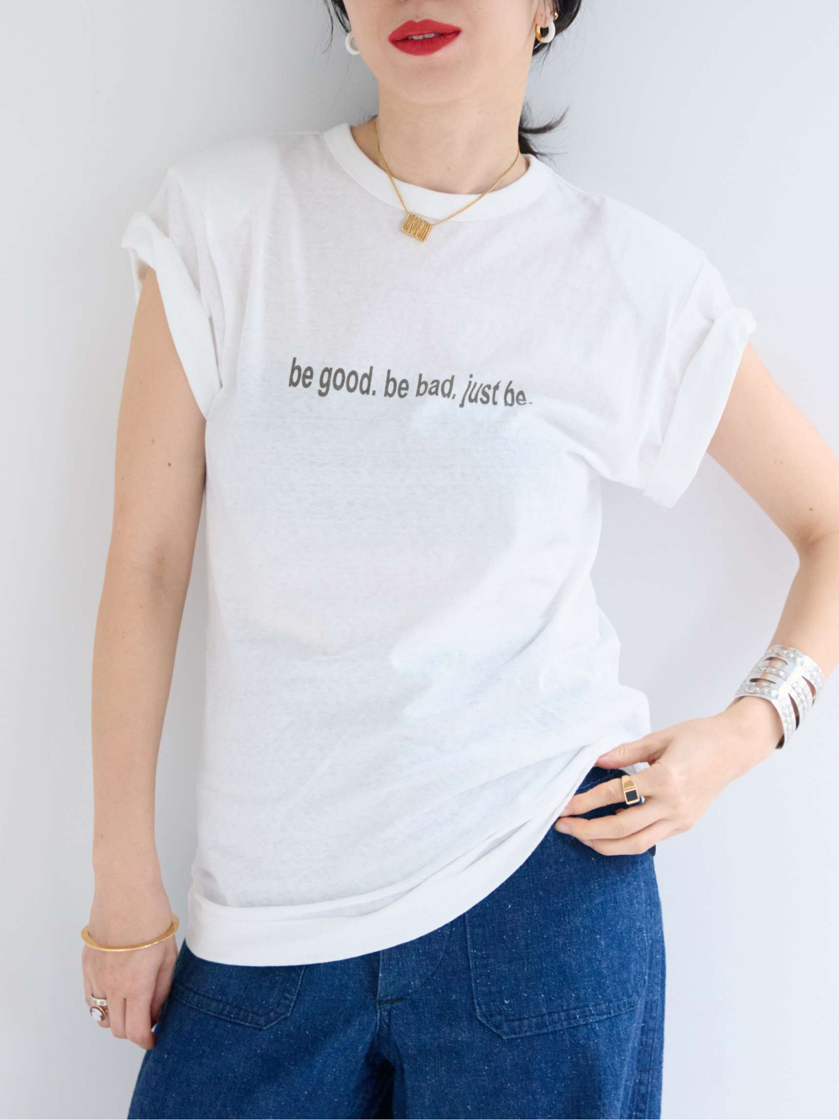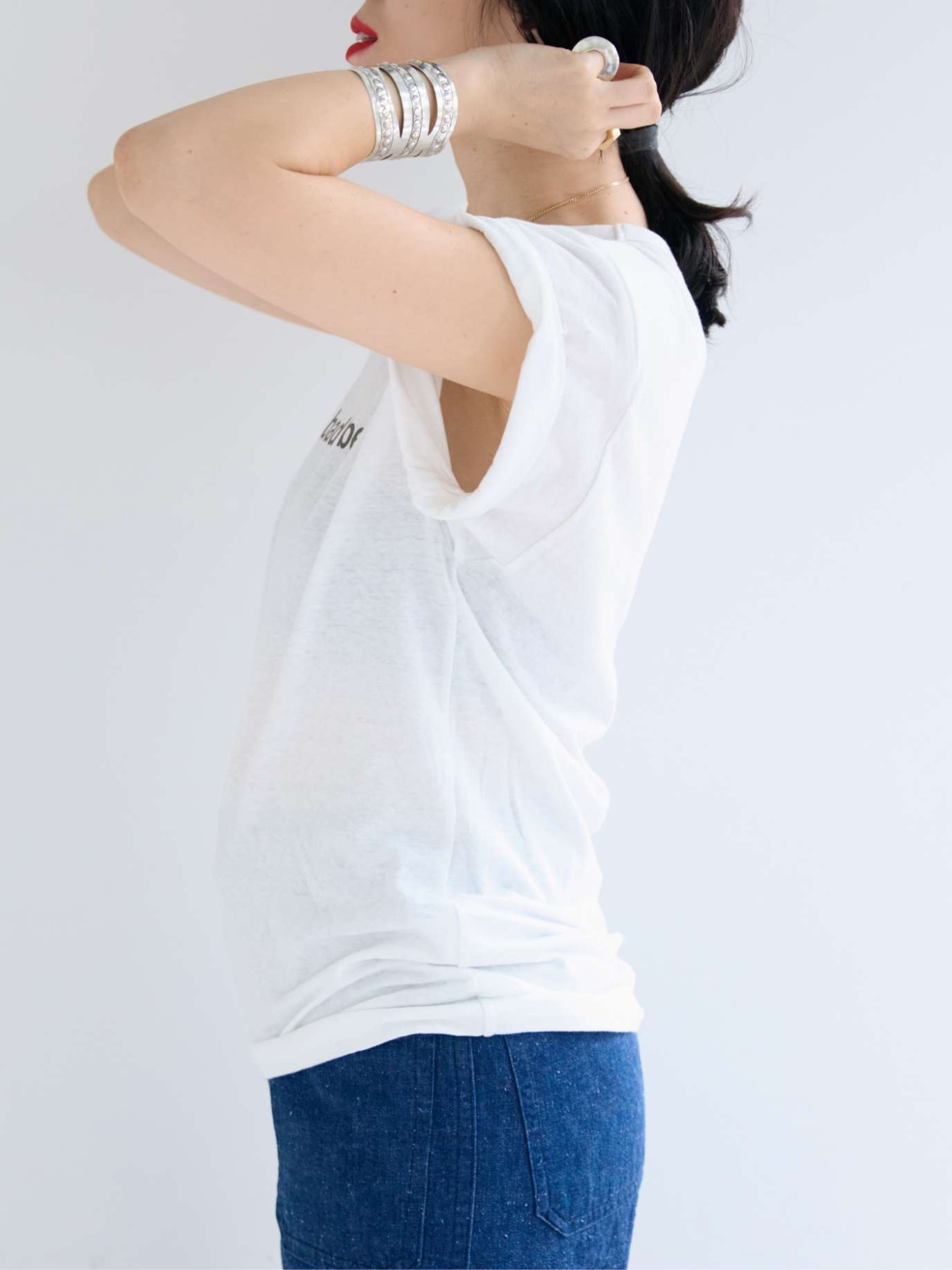 コットンの落ち綿から作られた、柔らかく風合い豊かなノイル天竺を使用したTシャツ。ナチュラルなムラがあり、洗うたびに風合いが増し、さらに表情が豊かに。生地のテイストに合わせて、ボディのフロントにはかすれたようなロゴプリントをオン。ヴィンテージの様な雰囲気を漂わせています。トレンドのパワーショルダーを採用。袖口がラフにロールアップされているので、こなれた印象に。