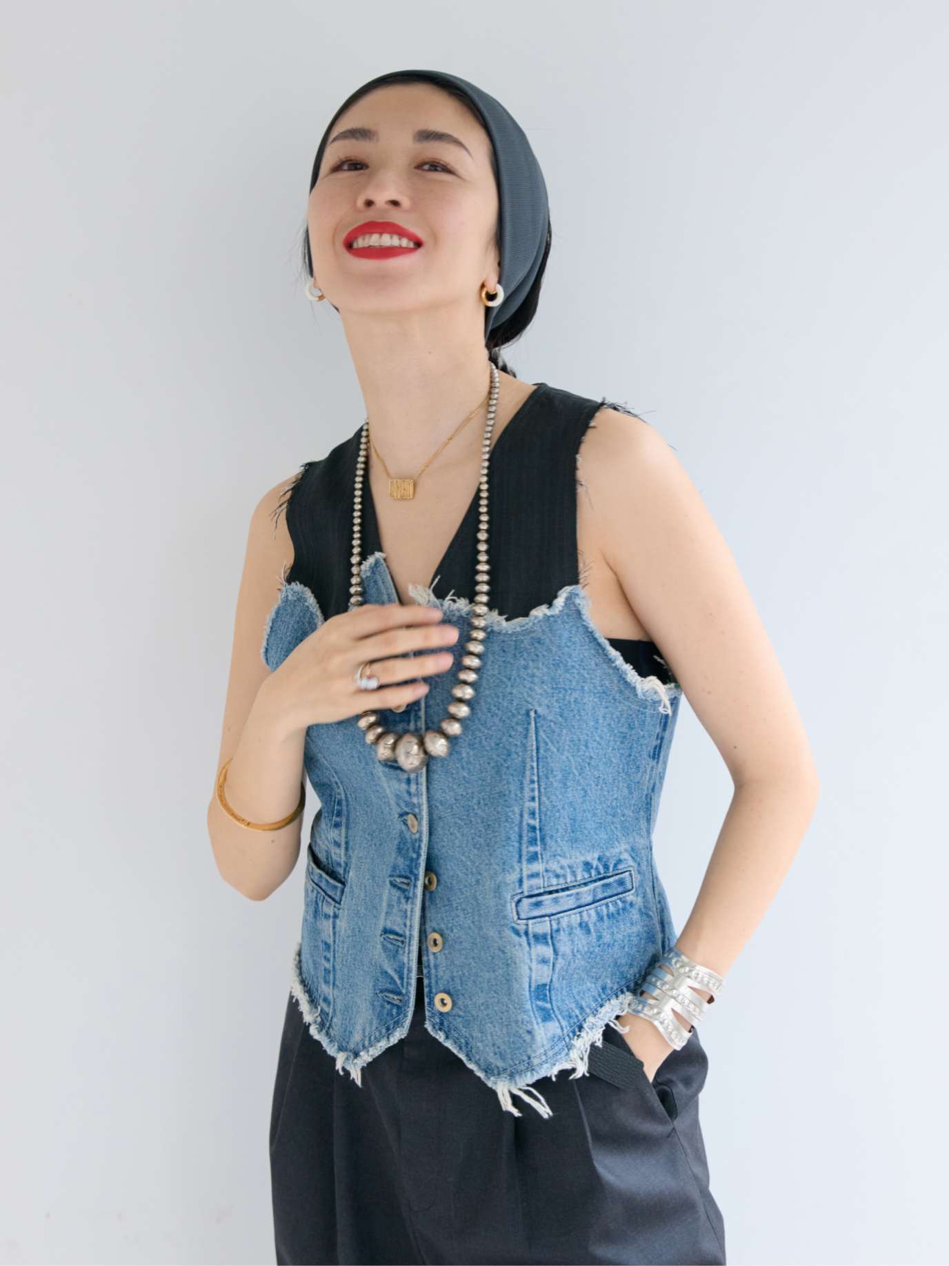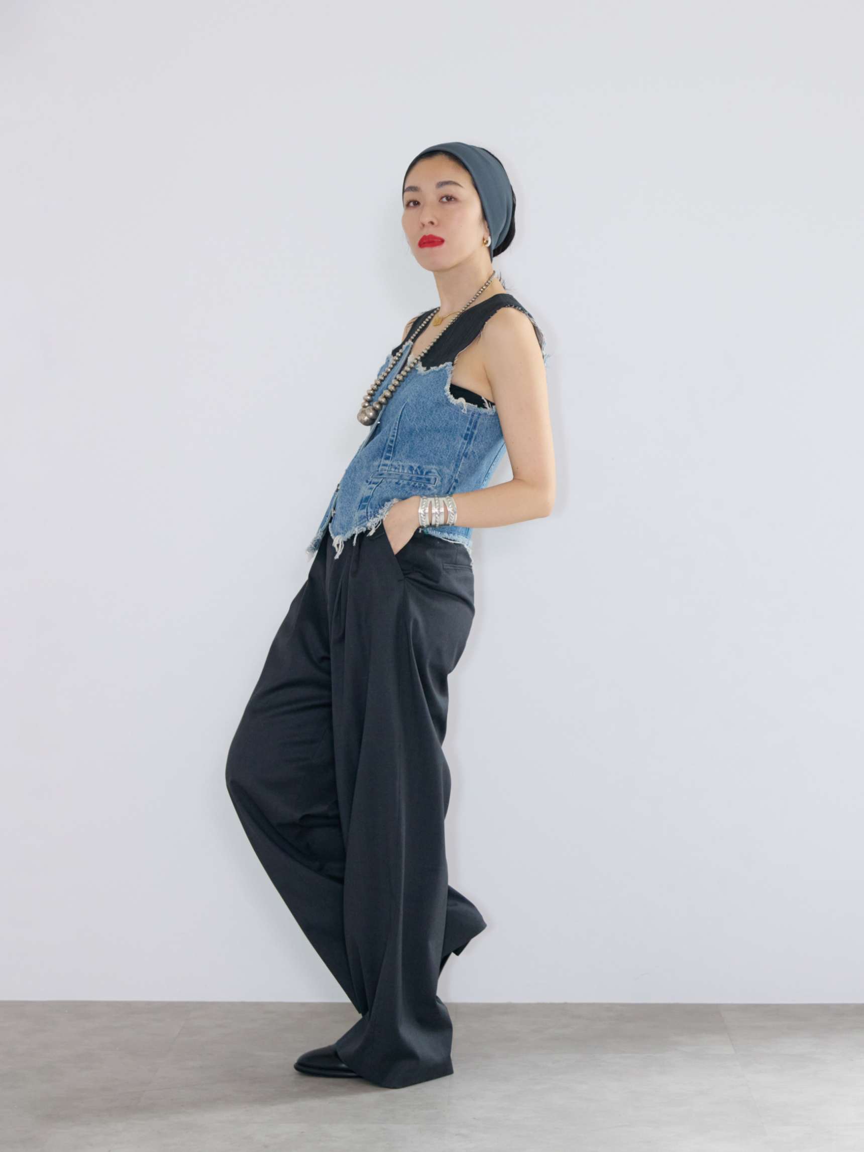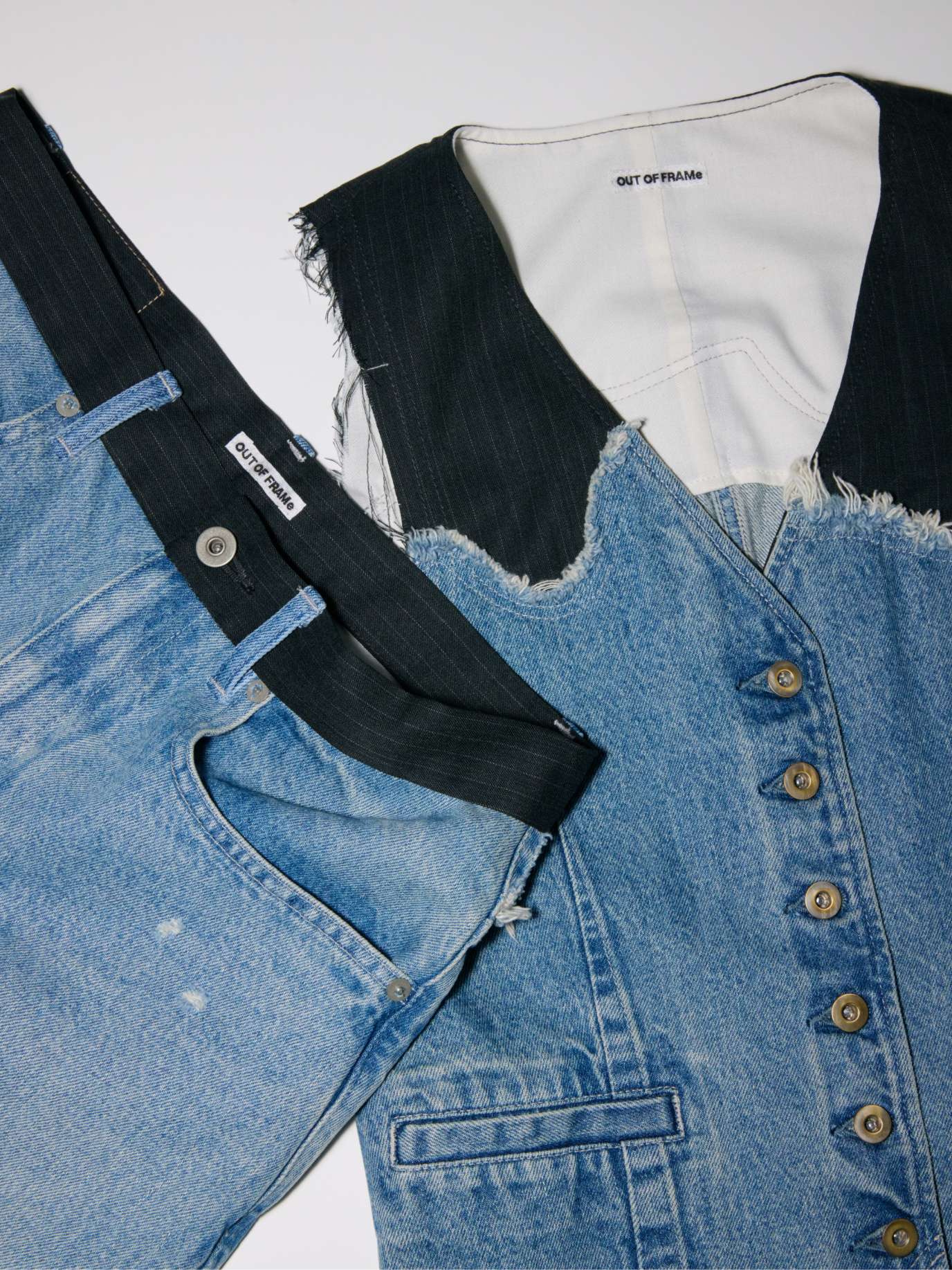 モダンで洗練されたデニムスタイルを提案する「THENIME」。オリジナリティあふれるデニムアイテムを得意とする「OUT OF FRAMe」に親和性を感じて、コラボレーションをオファー。パーツや素材選び、加工にもこだわったベストとスカートが完成しました。