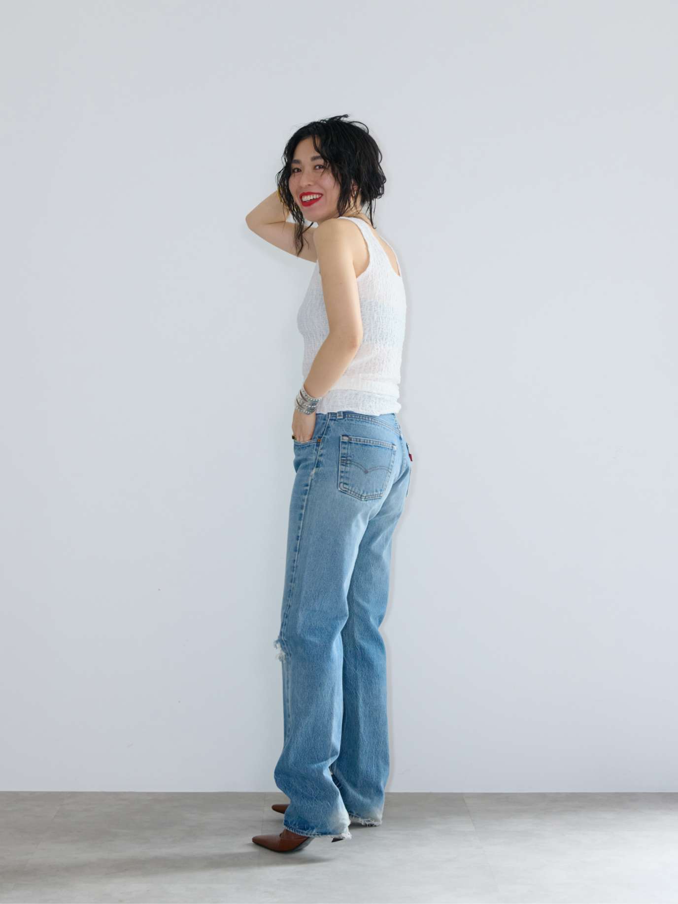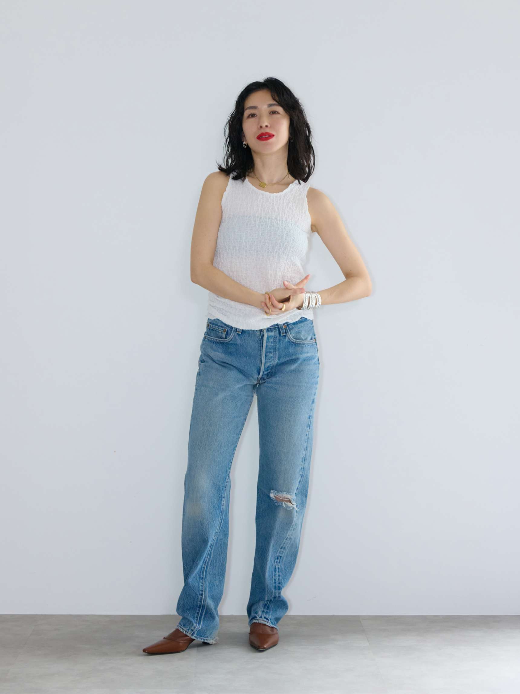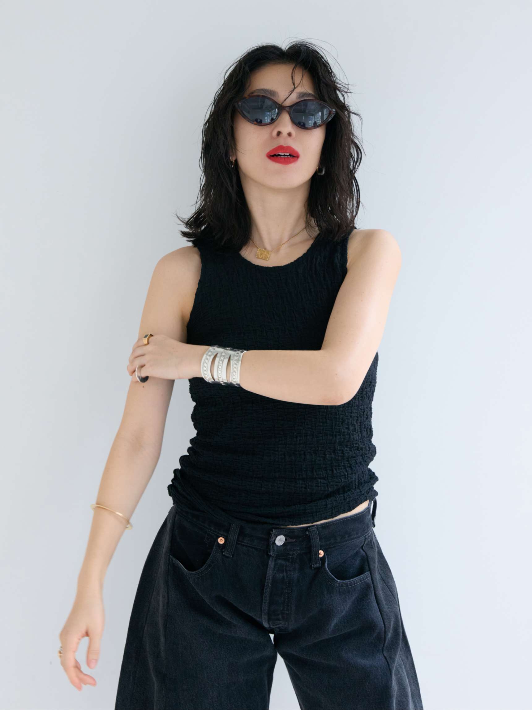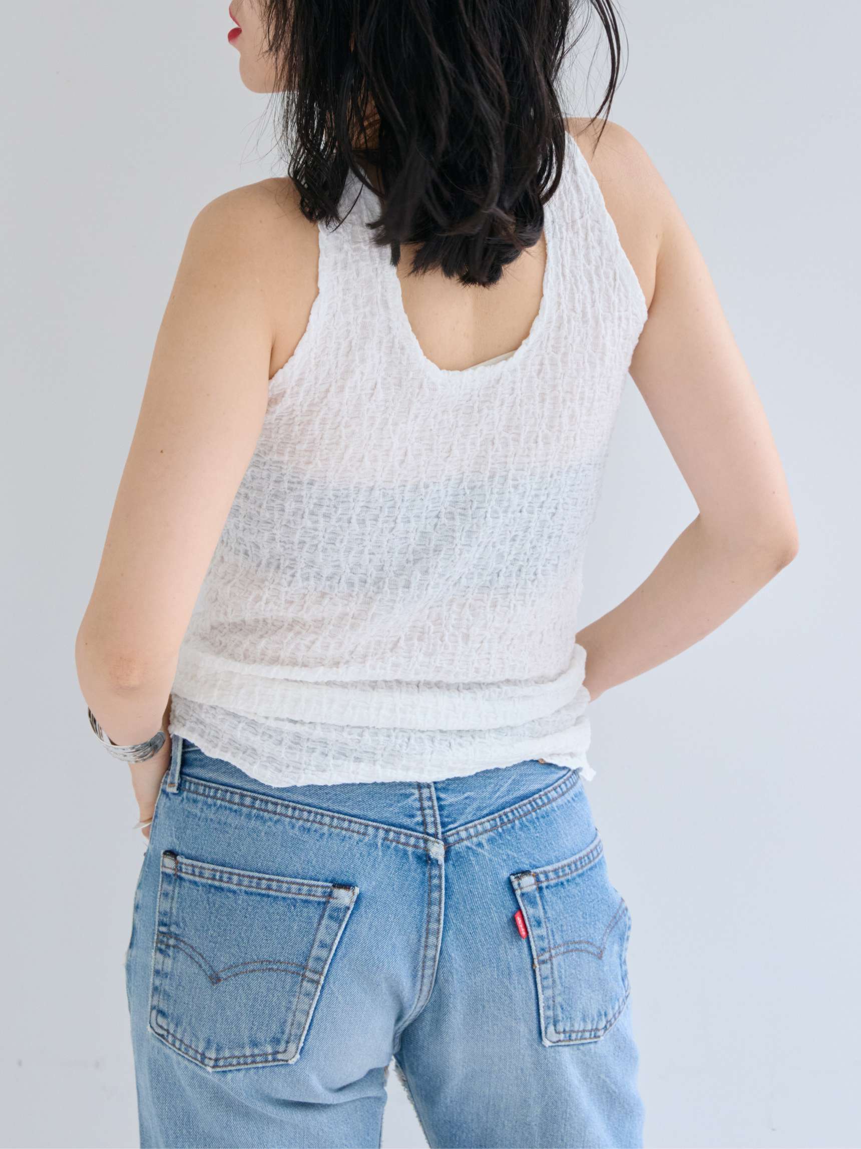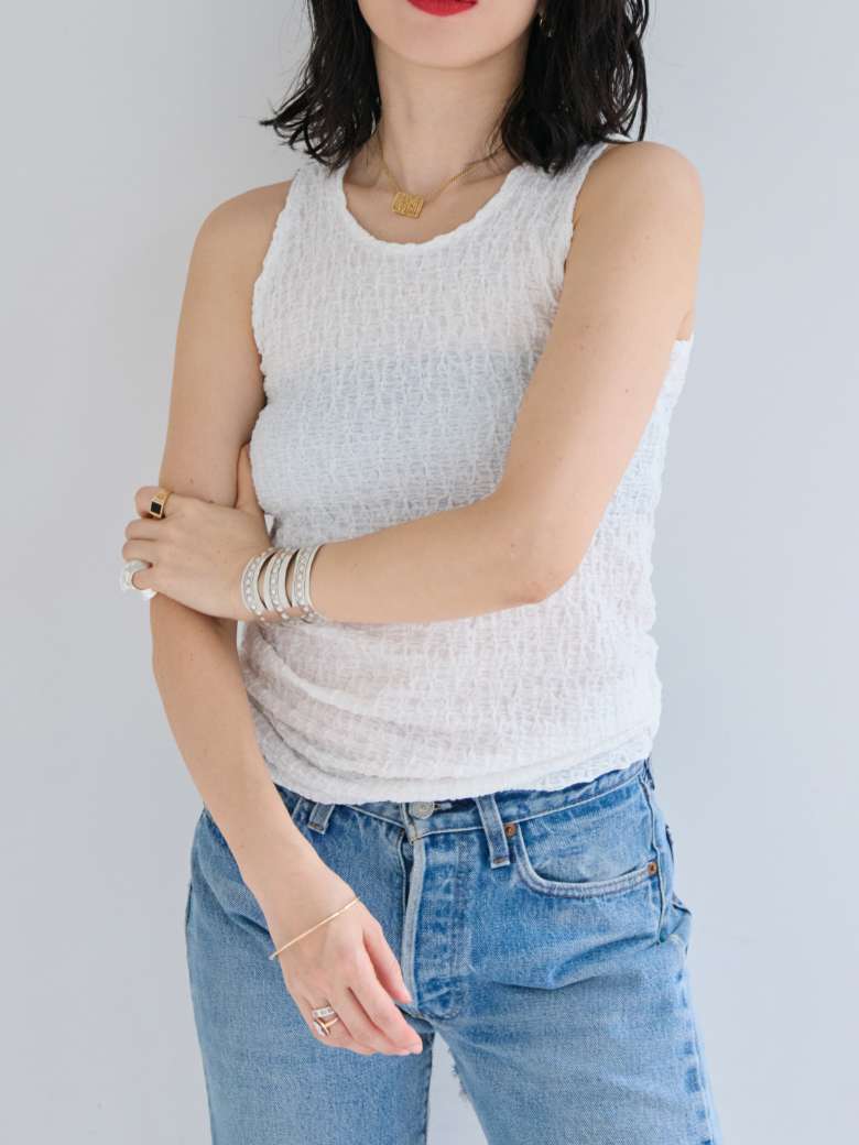 ストレッチ性があり、シワ加工を施したようなラッセルの生地を使用したタンクトップは、アメリカンスリーブでヘルシーな印象に。タイトな着心地と着丈を長めにすることで、ウエストにドレープの様なシルエットが生まれ、今っぽく着こなせます。同素材のジップアップカーディガンと重ねて、デニムパンツを合わせるとヘルシーな大人のスタイルに。