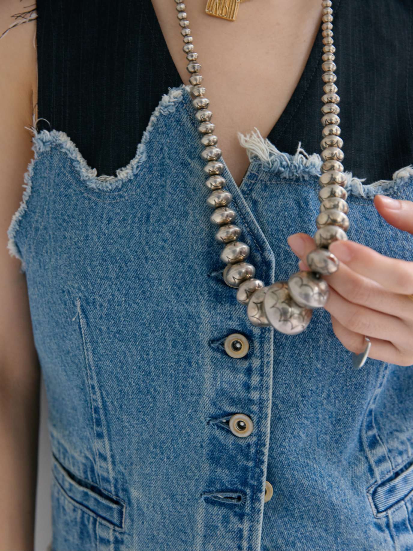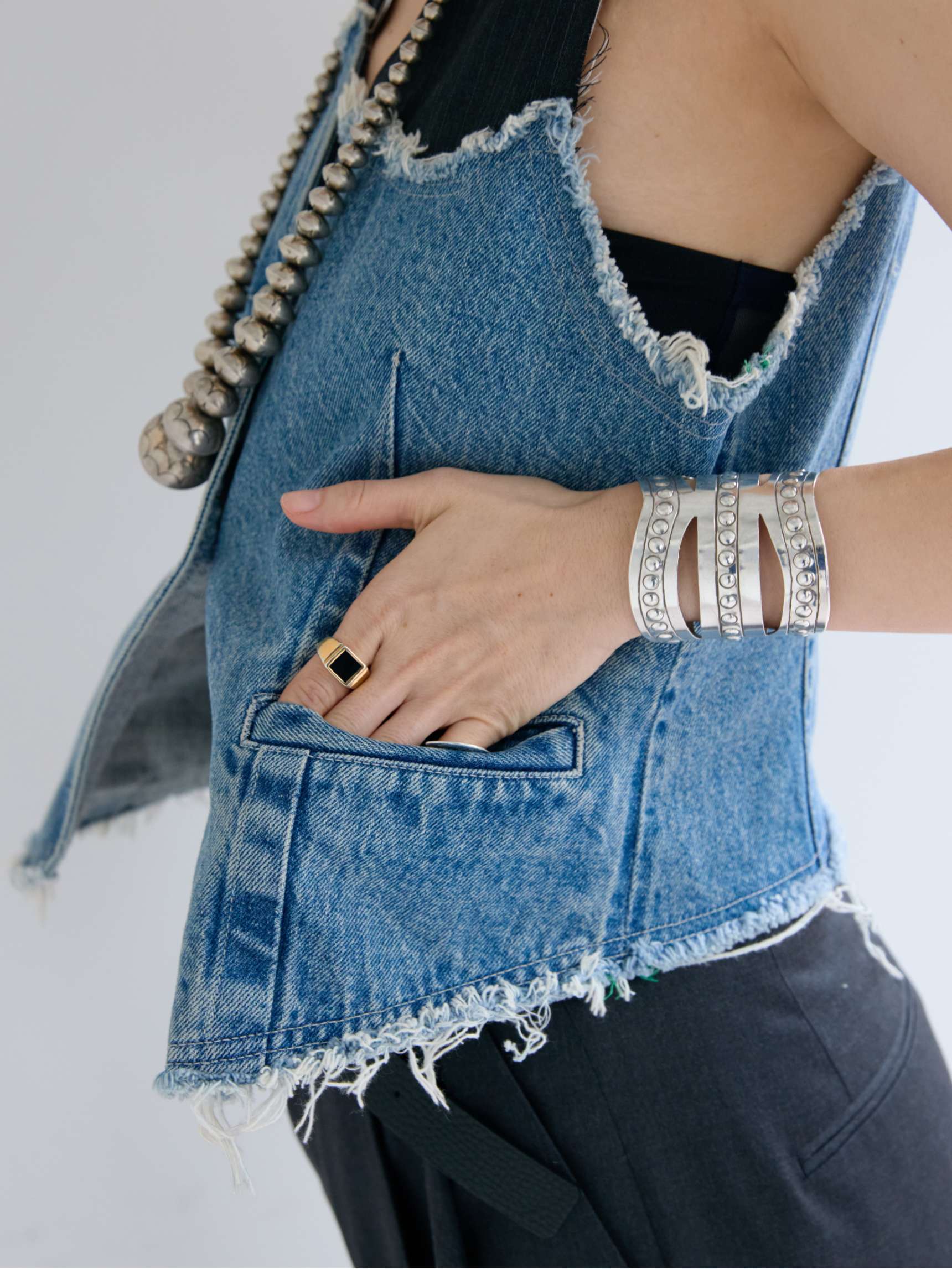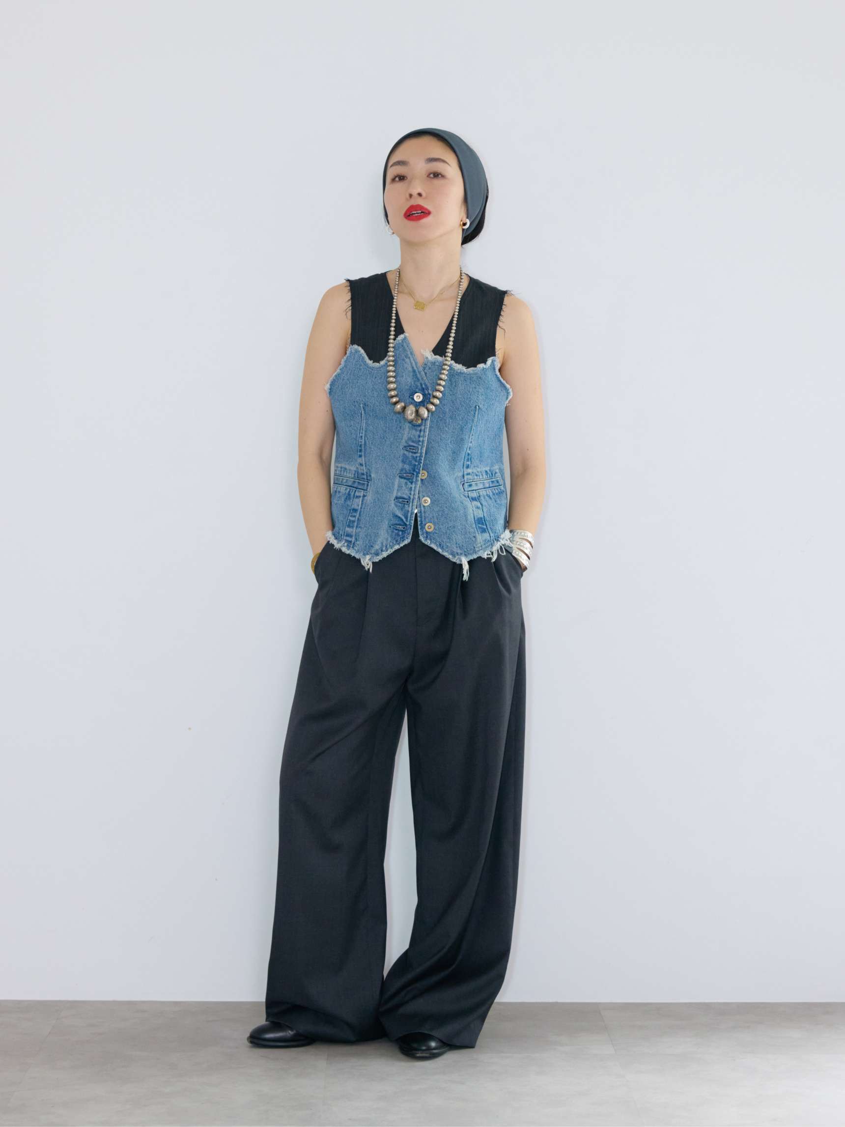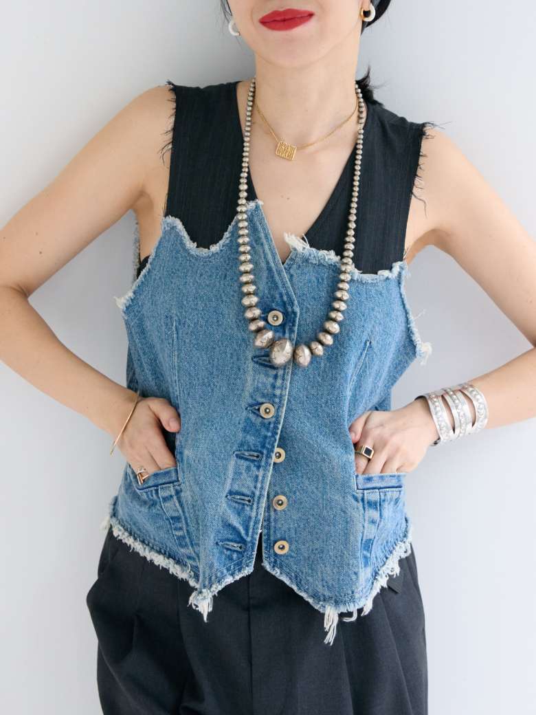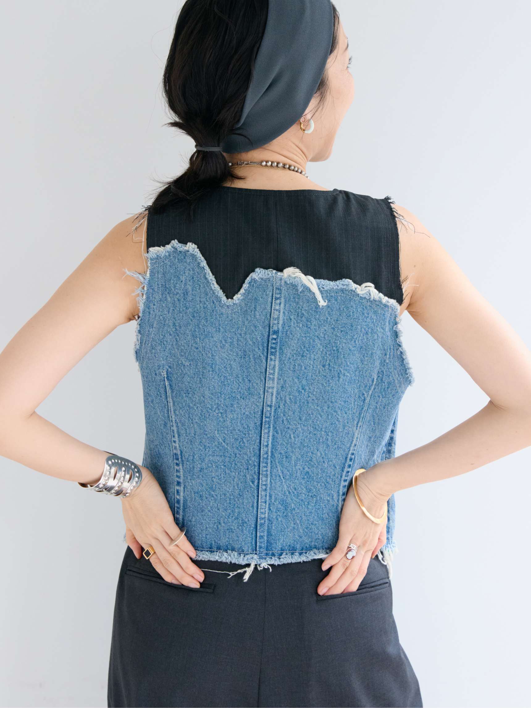 スーツの中に着るような、コンパクトなベストをイメージ。加工を加えたデニム生地とクリーンな印象のツイル生地を掛け合わせて、リメイク風のベストに仕上げました。胸元の開き止まりを高めに設定し、タイトな肩幅とシェイプしたウエストラインにする事で、ボタンを全て閉じて着ても様になるシルエットに。タックボタンをデニム生地のヴィンテージ加工の前に付ける事で、風合いが増し、1点1点仕上がりの違う特別な1着が完成しました。