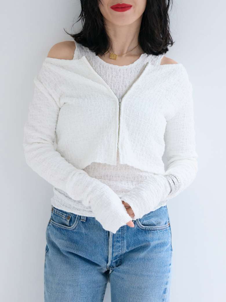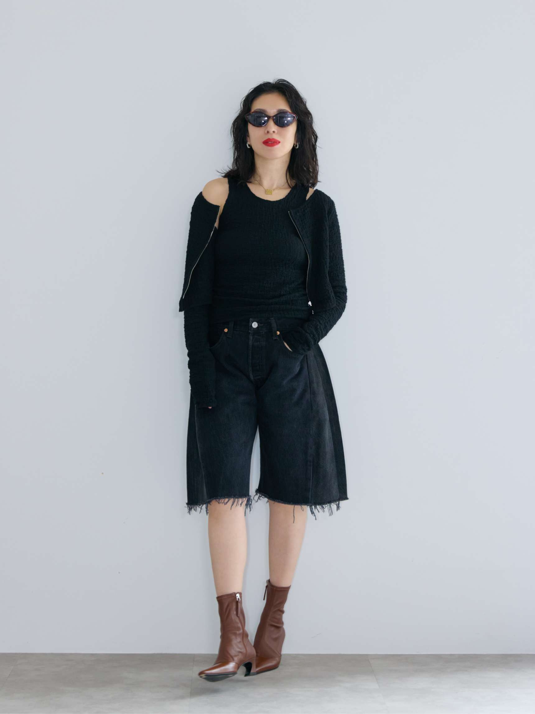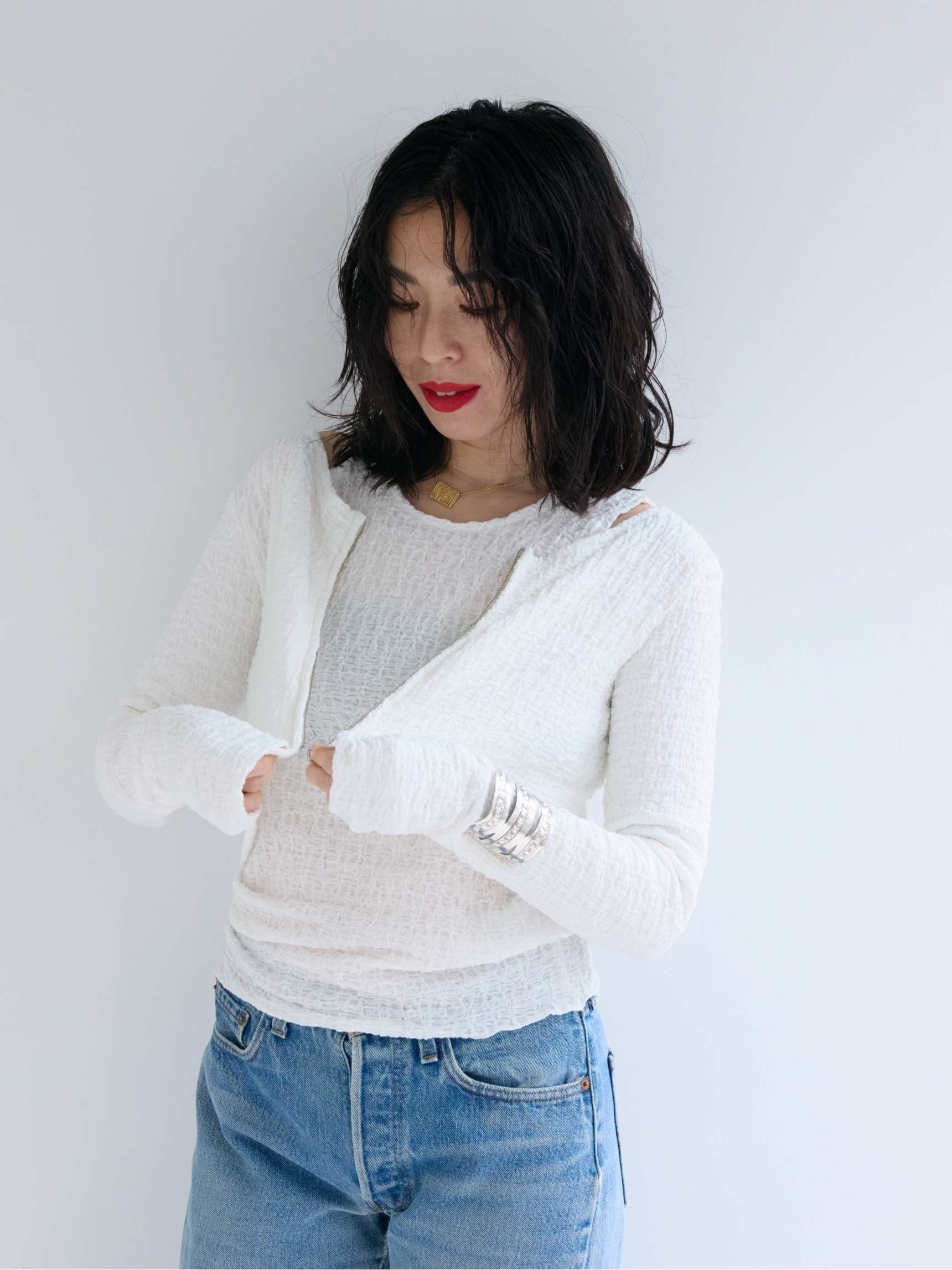 ストレッチ性があり、シワ加工を施したようなラッセルの生地を使用したカーディガンは、同素材のタンクトップとセットアップで合わせるのも素敵。アクティブな印象と女性らしさが同居する、ボックスシルエットがポイント。鎖骨がのぞくネックラインは首元を華奢に見せてくれます。コンパクトなシルエットで、スリムな印象に。長めに設定された袖を少したくし上げて着ると、ニュアンスが加わります。