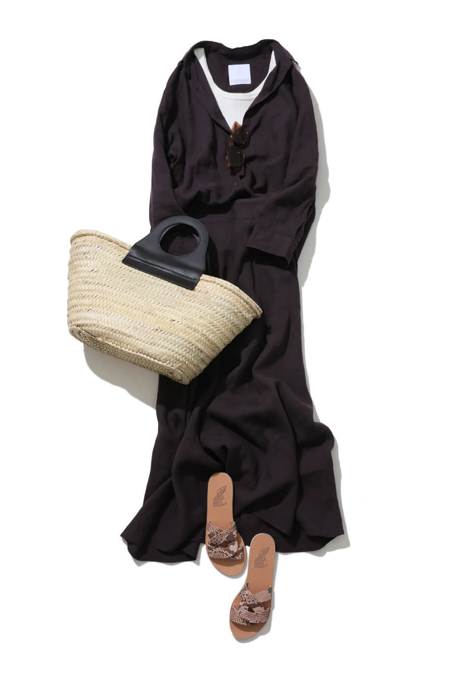 定番の麻アイテムがもうワードローブにストックされているなら、今シーズンは大人な雰囲気のセットアップがおすすめ。ルーズになりすぎないゆるめのシャツと、腰回りがすっきりした美シルエットのマキシスカートのコンビ。珍しい深めのブラウンがシックな印象を生み、春夏らしい小物を引き立てます。