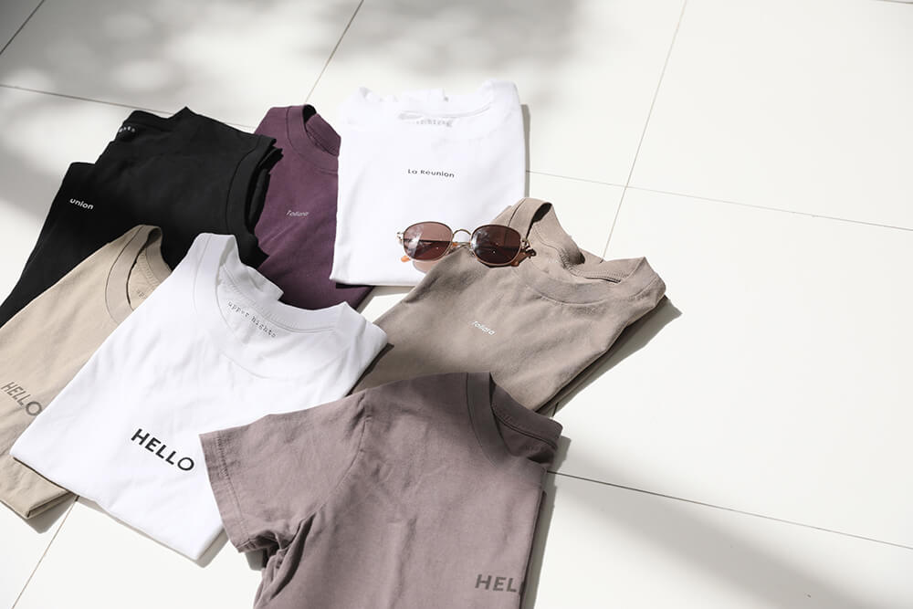 柔らかいニュアンスカラーに、さりげなく入ったロゴ。