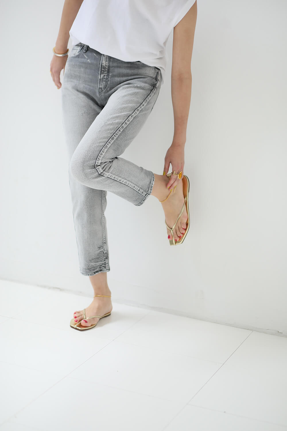 メタル付きサンダルで、辛めのアクセントを。