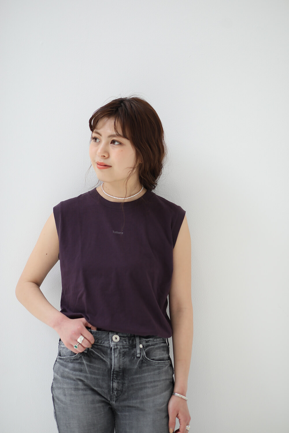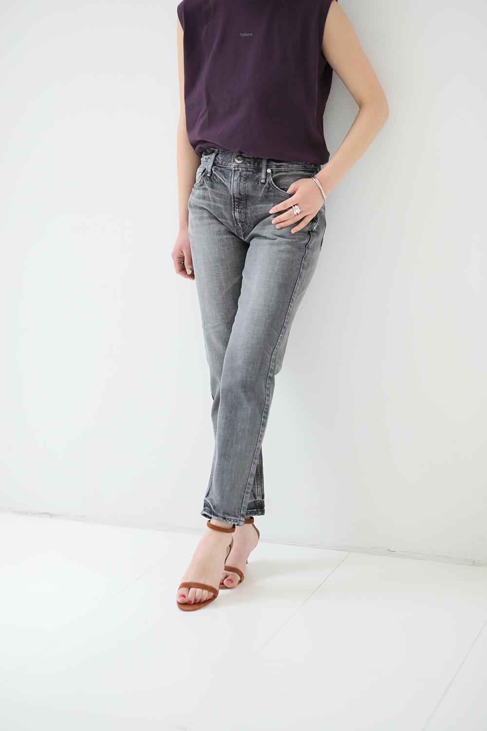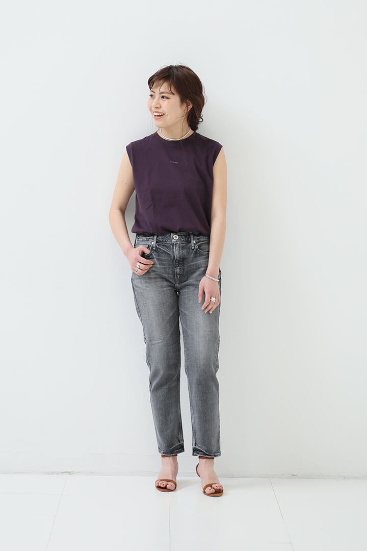 ノースリーブTをデニムにインして、ラフさがありながらスタイルアップを叶えるカジュアルスタイルをメイク。シンプルなコーデに映える大振りのアクセサリーもポイントに。アンクレットチェーンがついた大人フラットサンダルがベストバランス。(STAFF身長: 167cm、着用サイズ: 25)